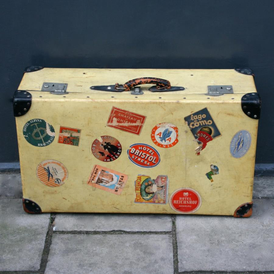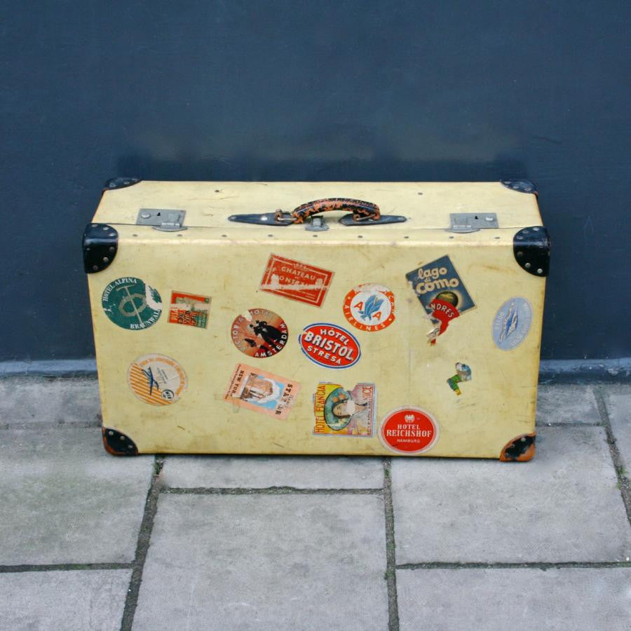 A large vintage travel trunk, in rigid canvas. Featuring a traditional riveted edge, leather handle and original holiday stickers, this piece of travel history would make a wonderful decorative piece.
