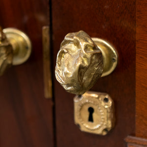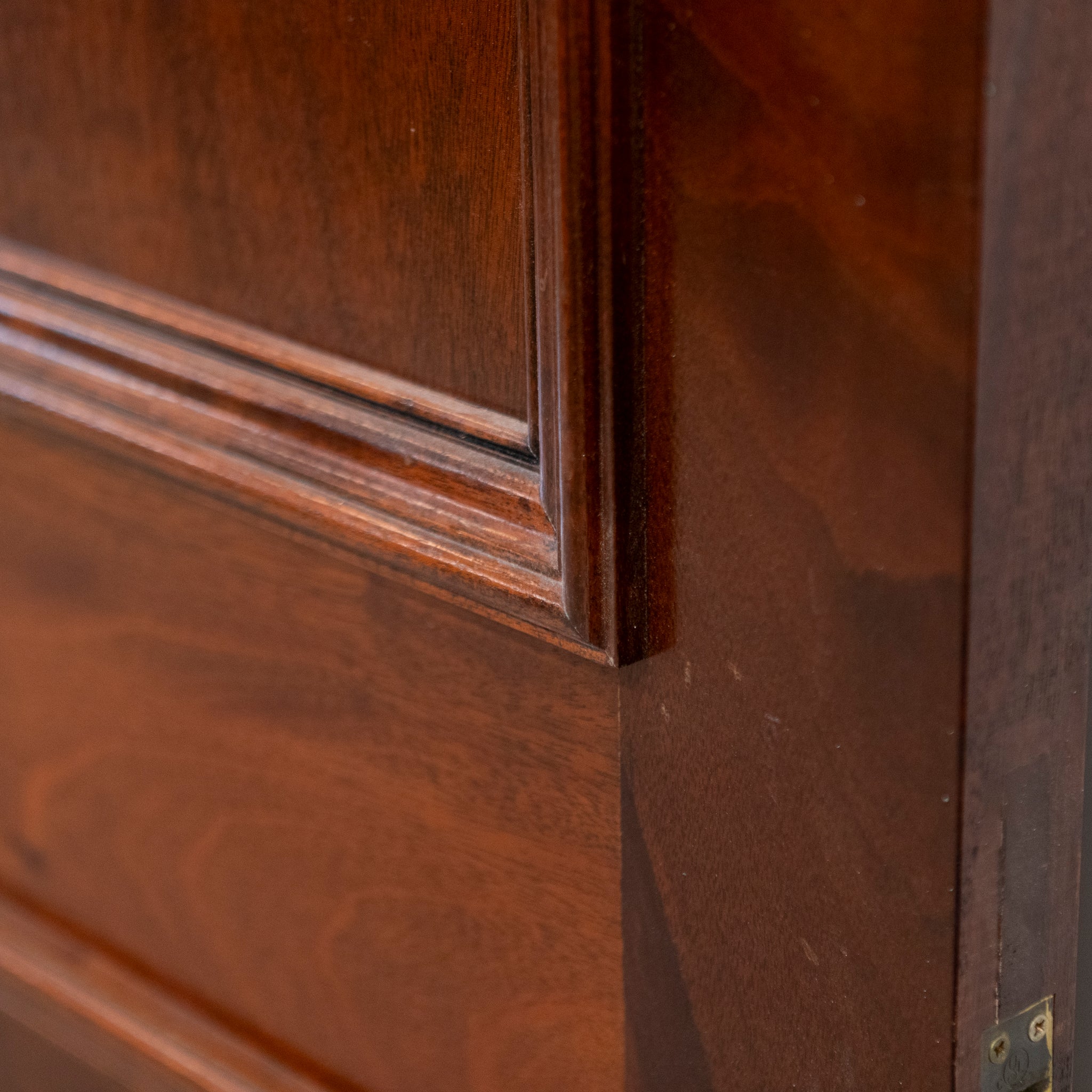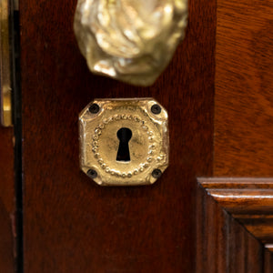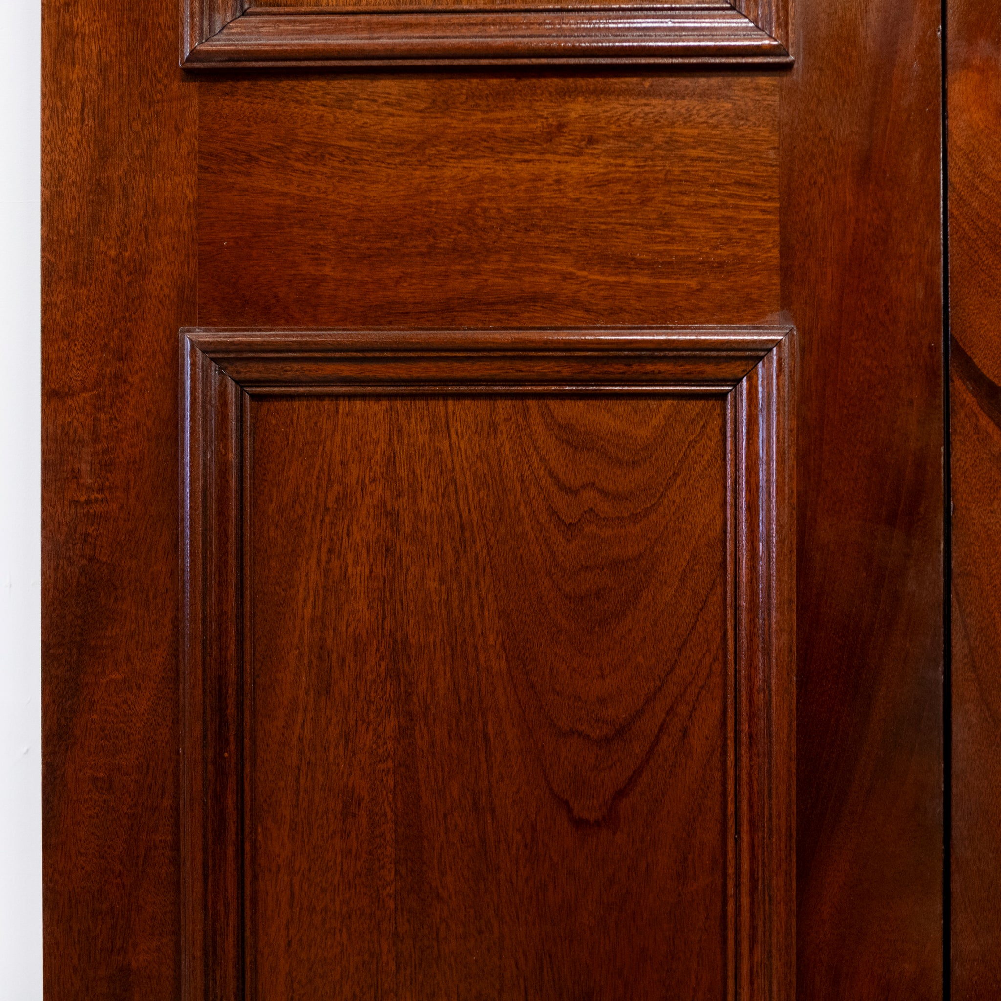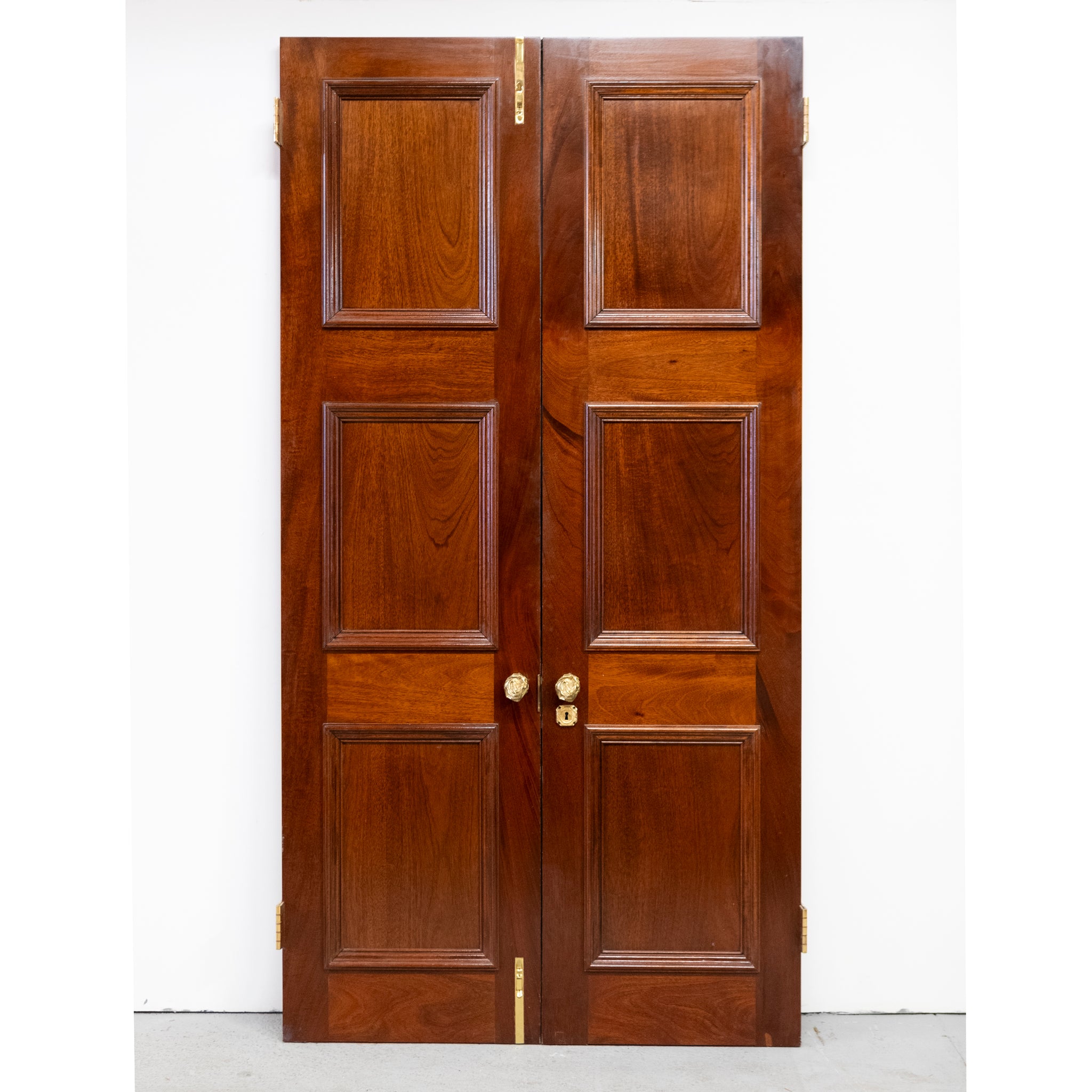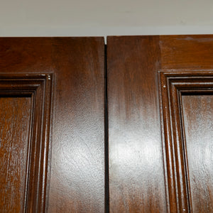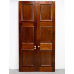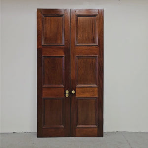 A distinguished pair of large reclaimed double doors, finely crafted from solid mahogany. The doors present a classic six-panel design, the rich, lustrous finish accentuates the natural grain and patina. A very impressive entranceway.