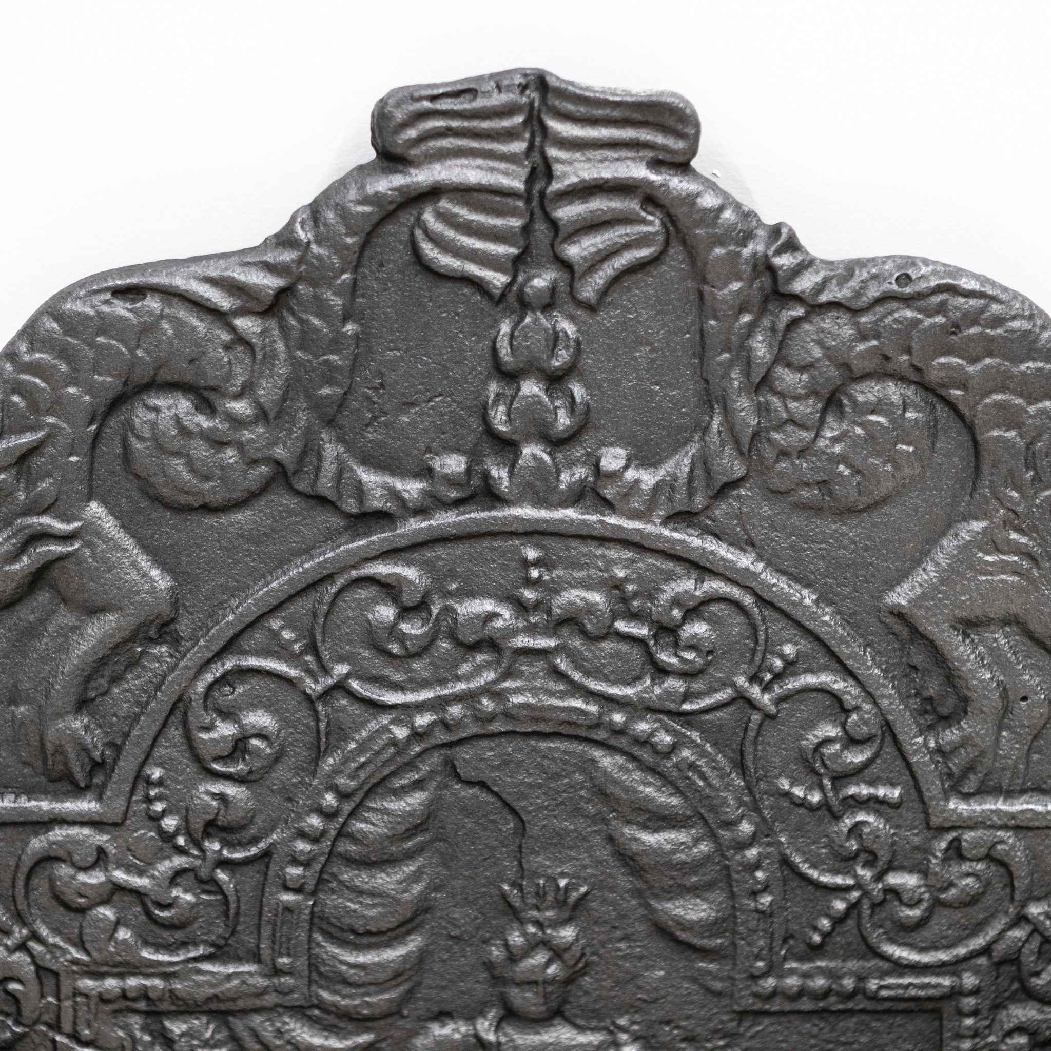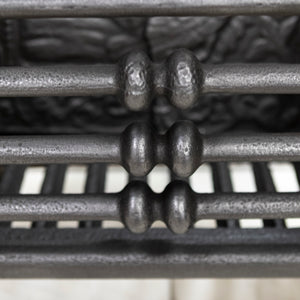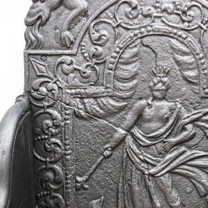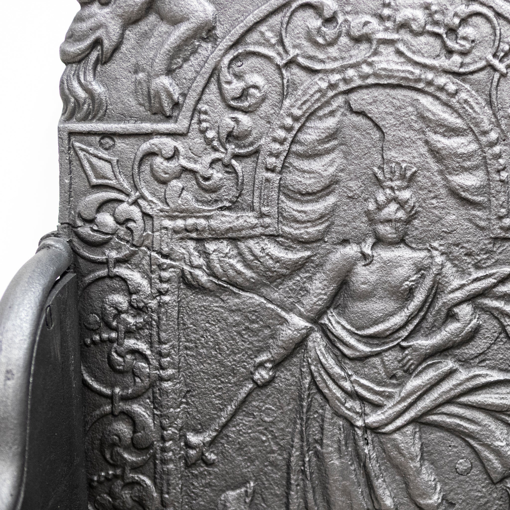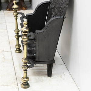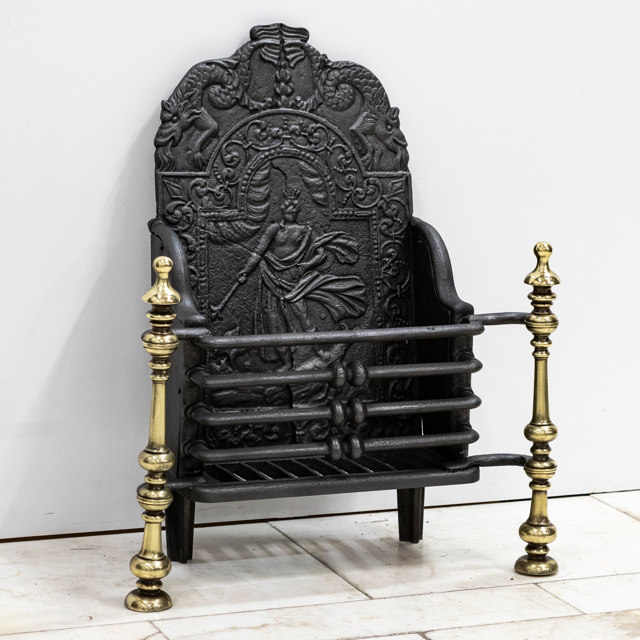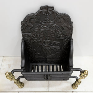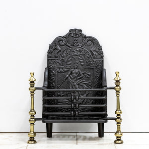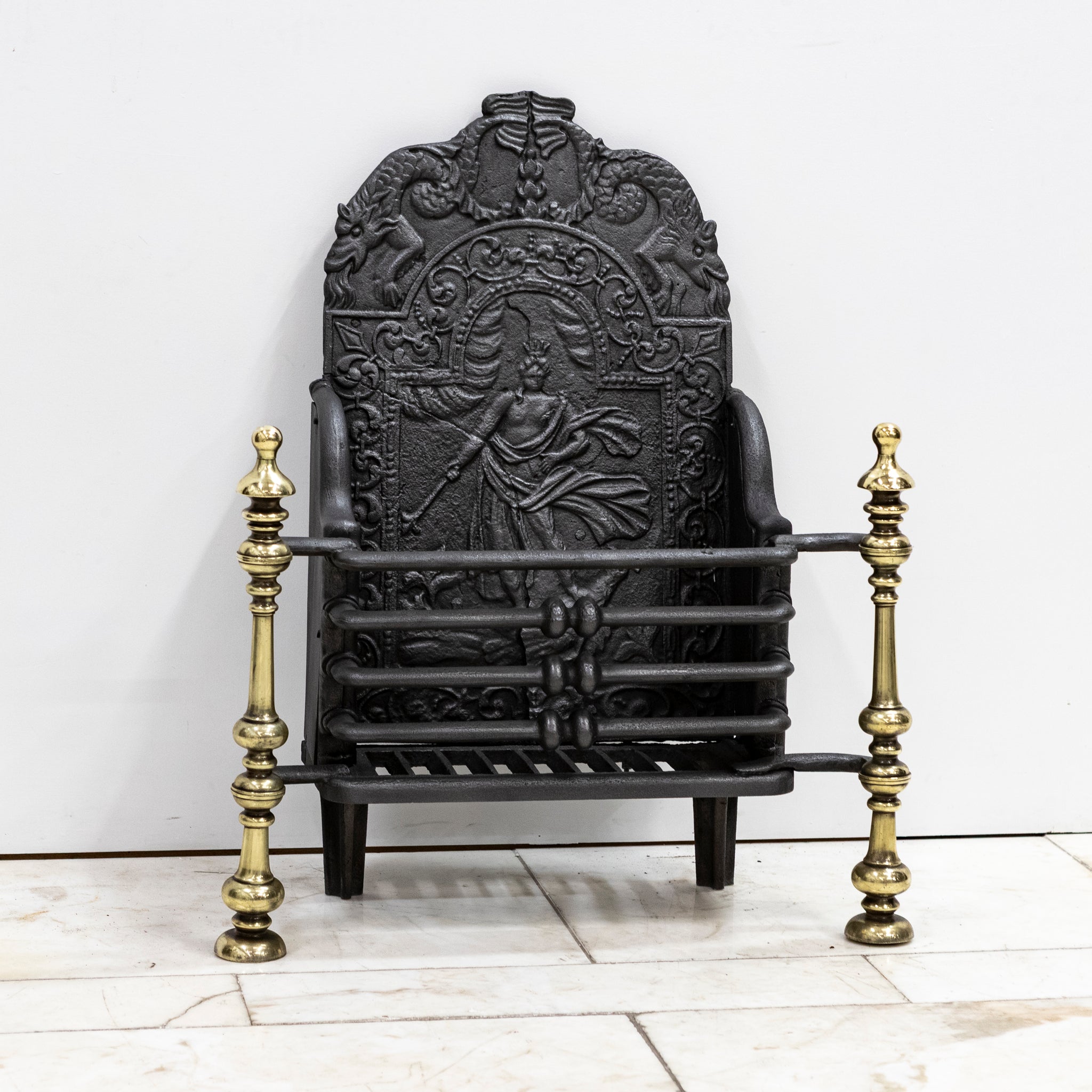 The cast-iron backplate is richly modelled in high relief with a classical figure framed by scrollwork and stylised dragon-form beasts. 4 front bars, with a central deorative motif, are flanked by tall, elegantly turned brass finials, providing a balanced contrast to the black cast iron.