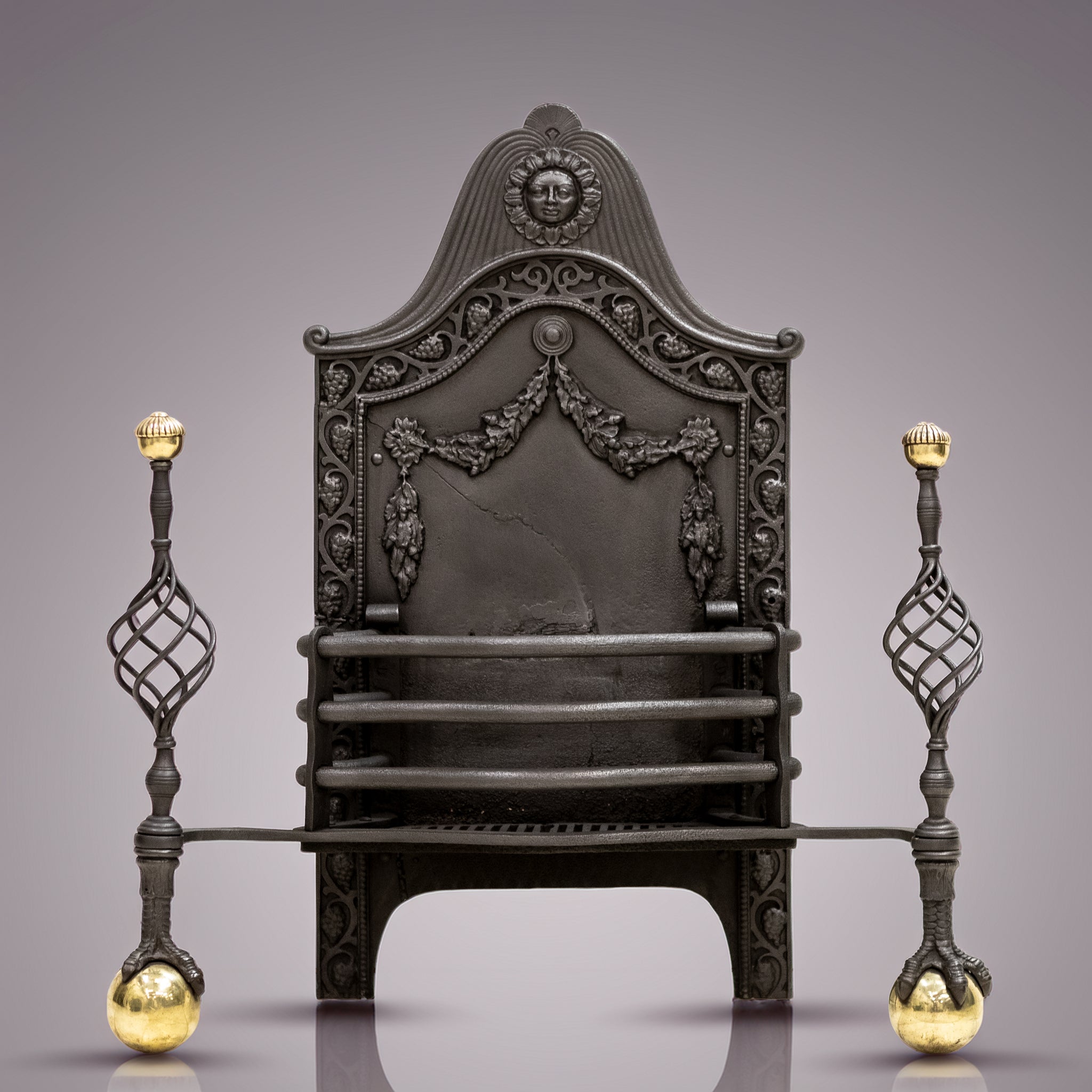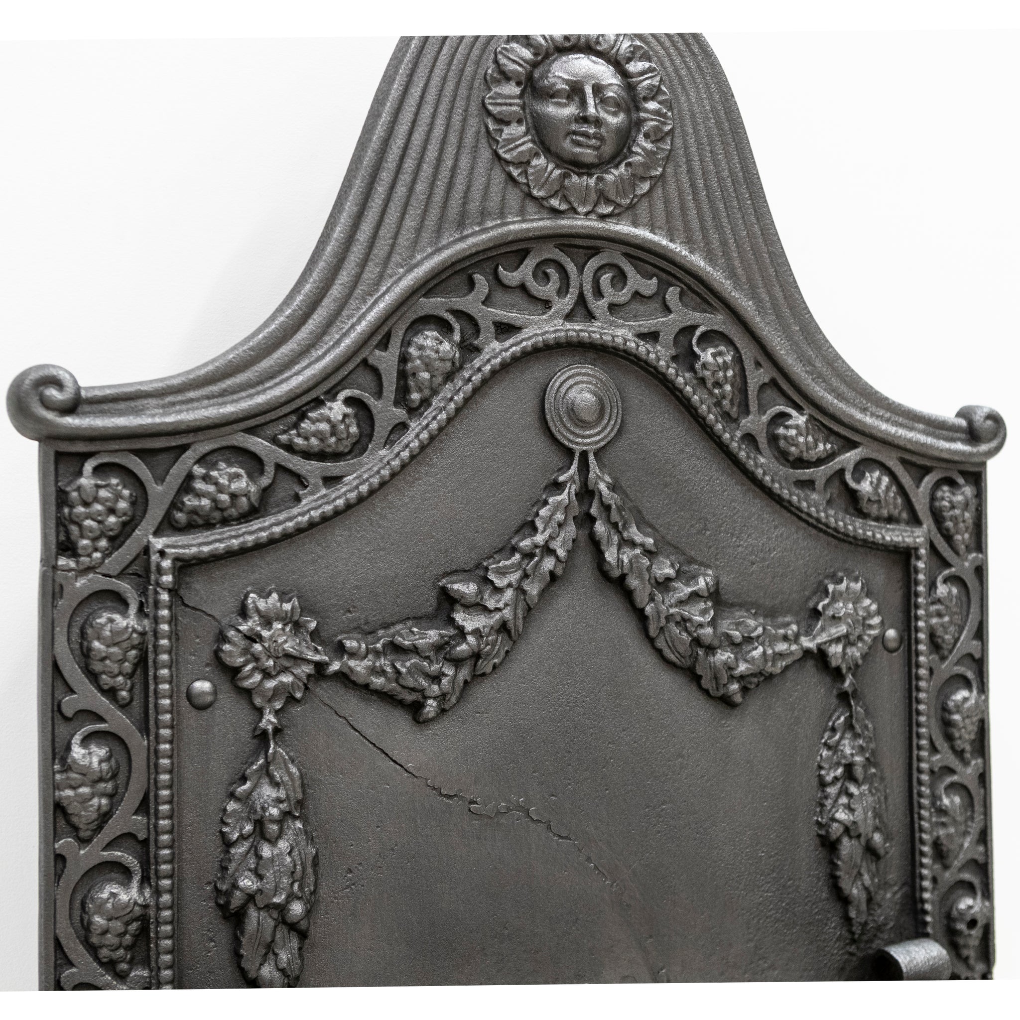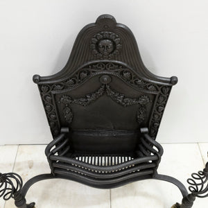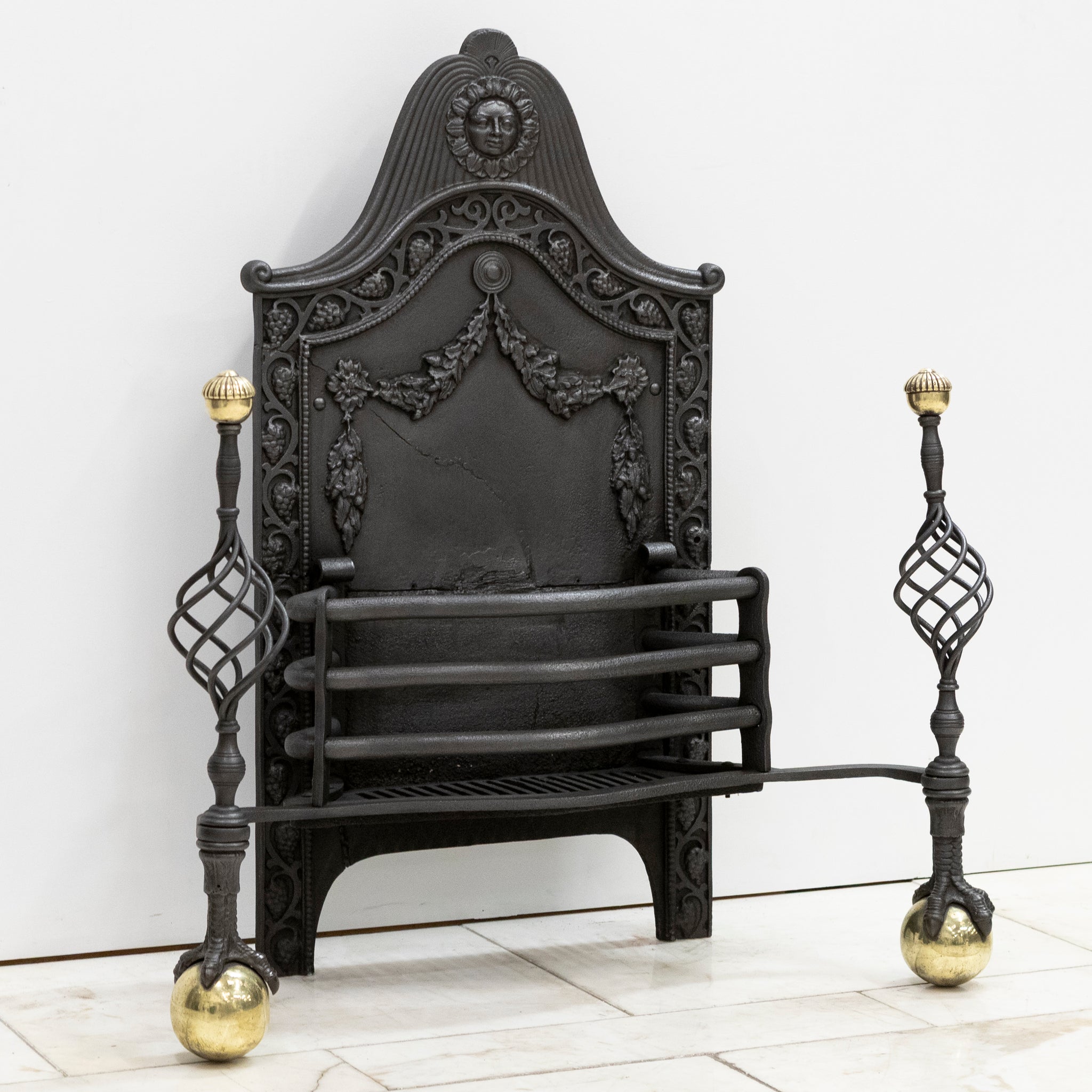 This is a fine antique cast-iron fire basket with a beautifully ornate, high-arched backplate. The upper section is crowned with a classical sunburst mask motif, while the surrounding surface is richly decorated with scrolling foliage and delicate garlands.