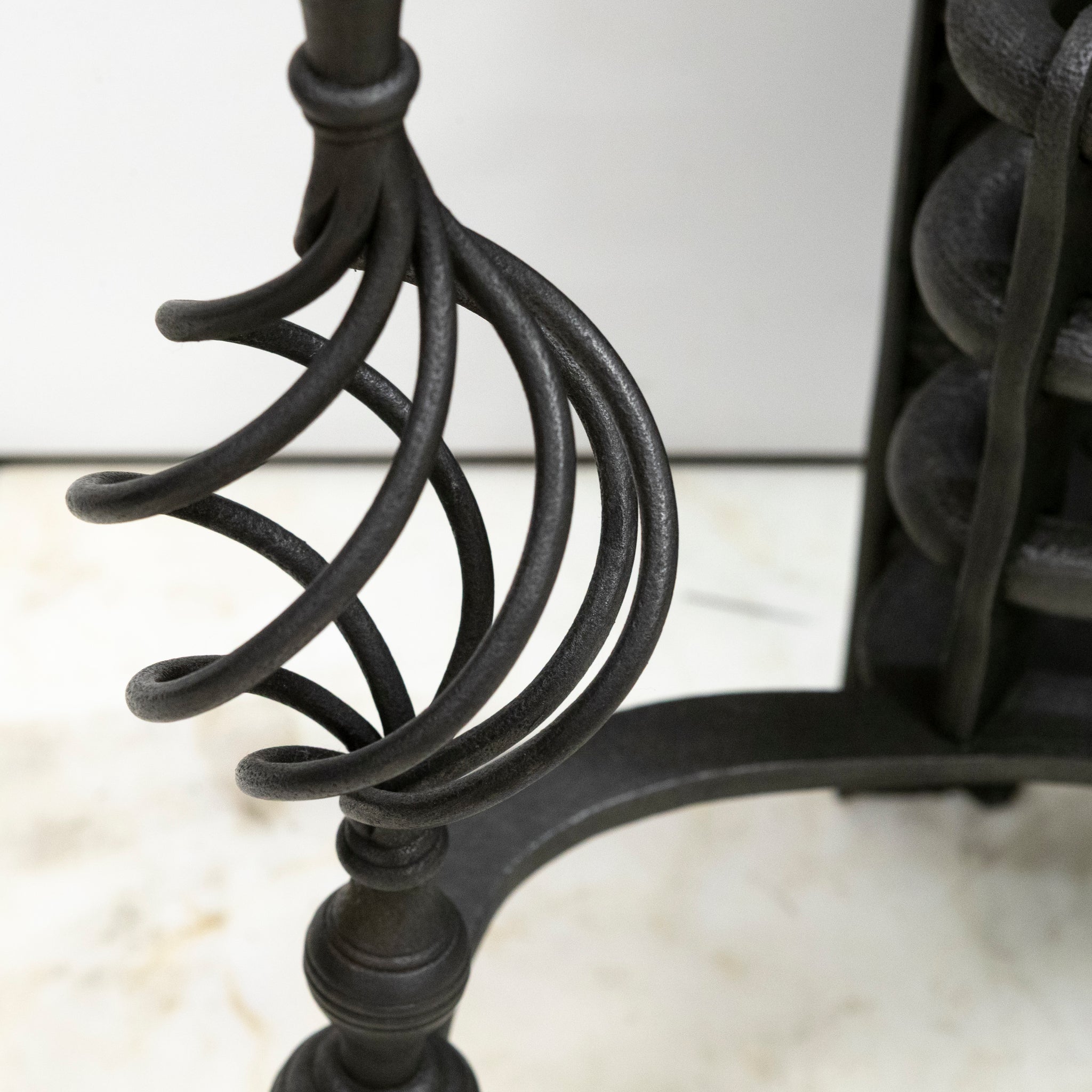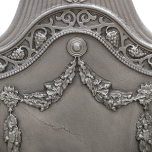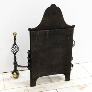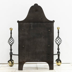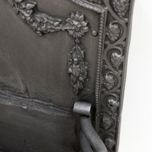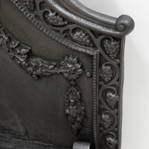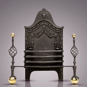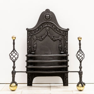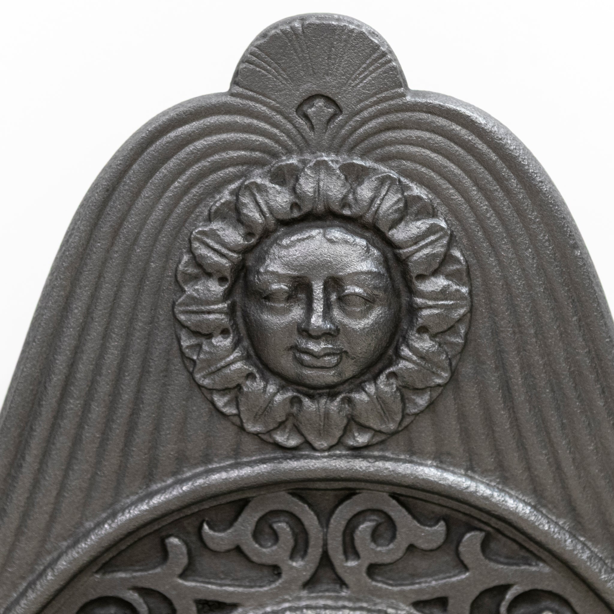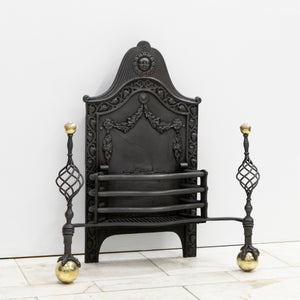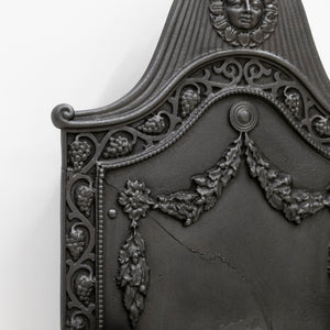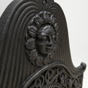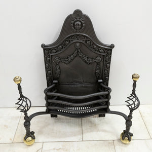 This is a fine antique cast-iron fire basket with a beautifully ornate, high-arched backplate. The upper section is crowned with a classical sunburst mask motif, while the surrounding surface is richly decorated with scrolling foliage and delicate garlands.