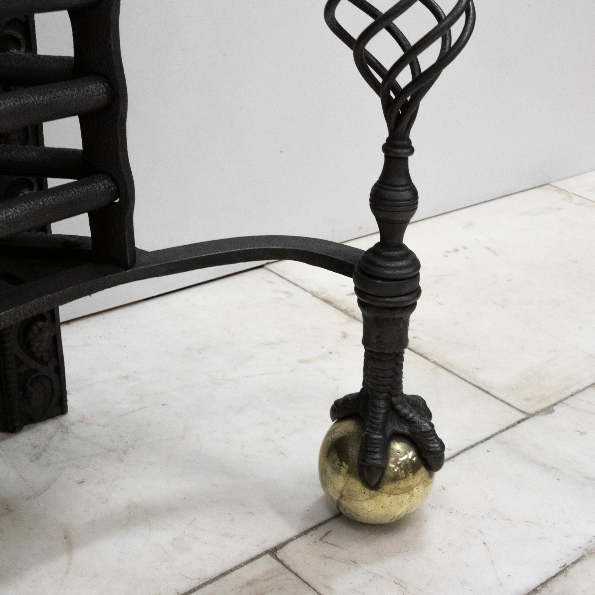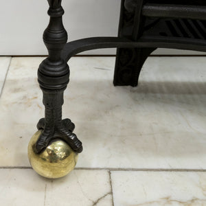 Large intricately twisted openwork finials flank the piece, these are topped with polished brass caps and set on large brass ball and claw feet, adding a striking contrast.