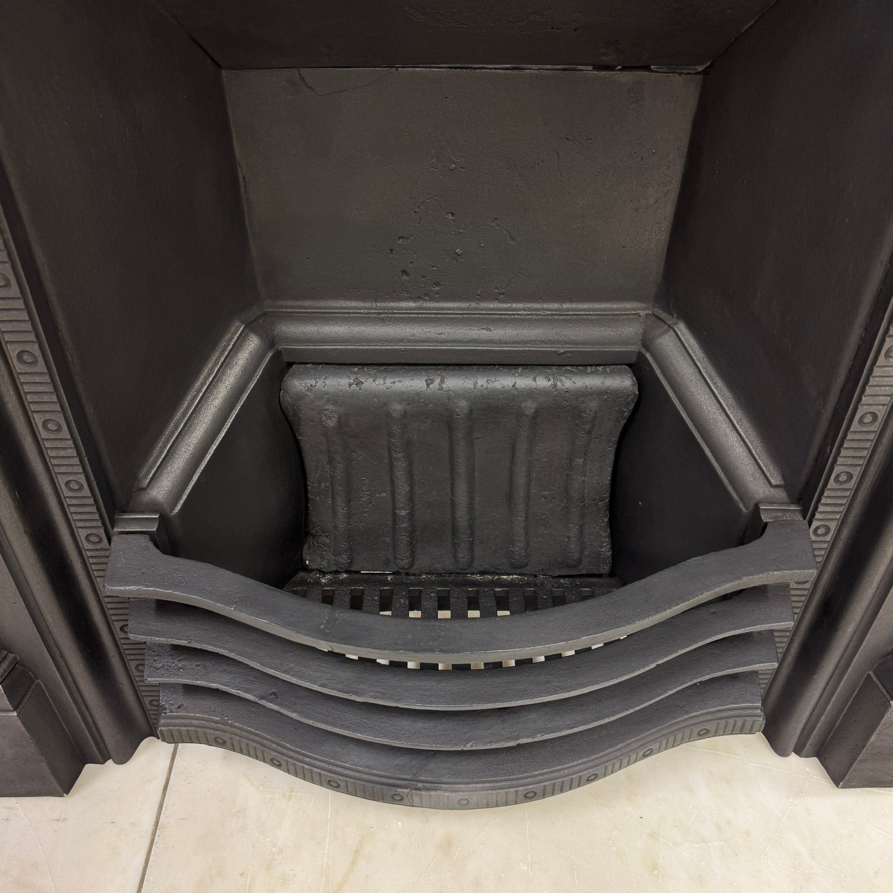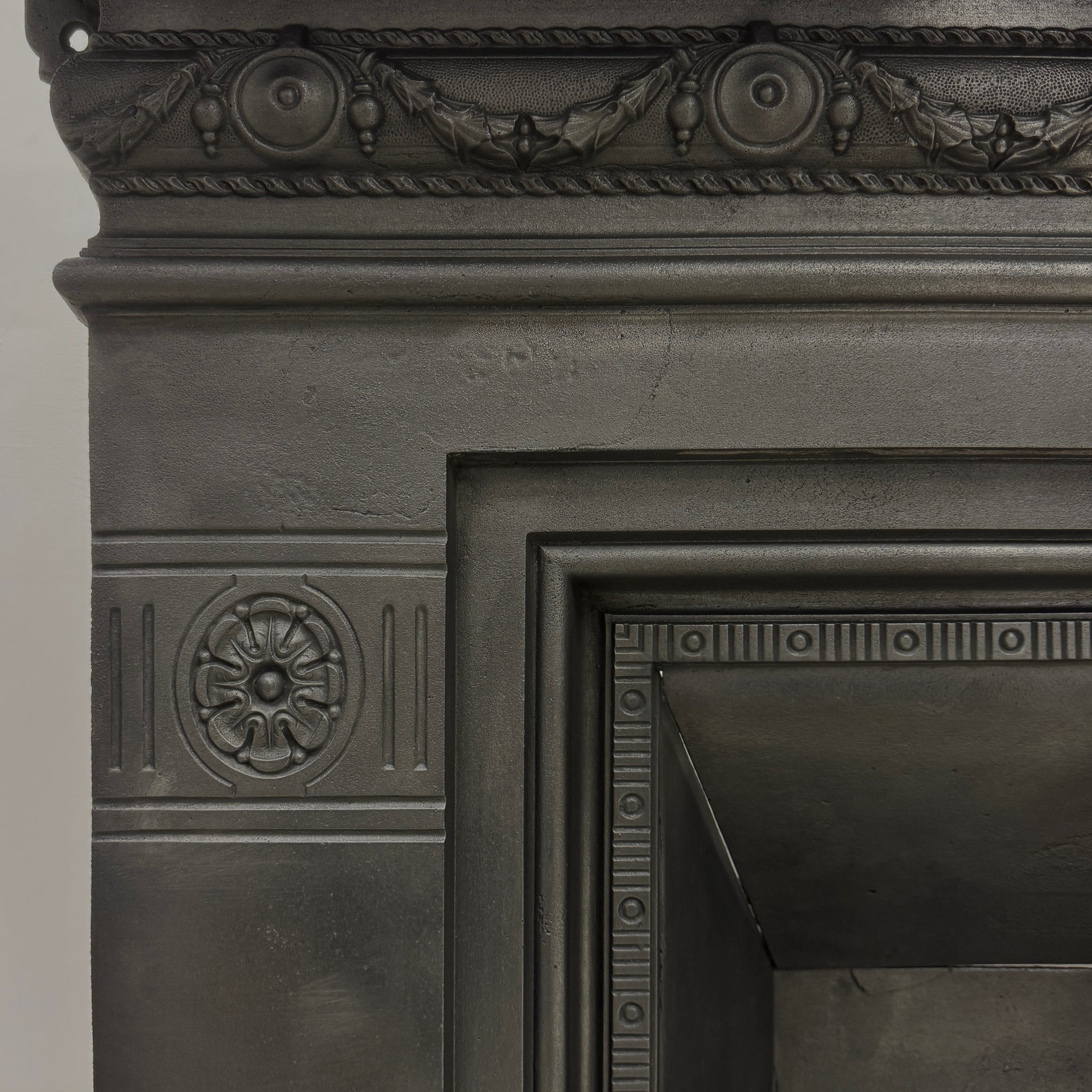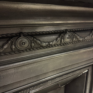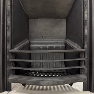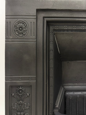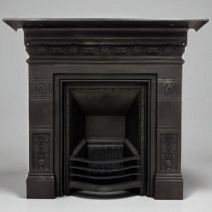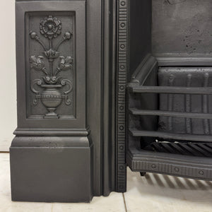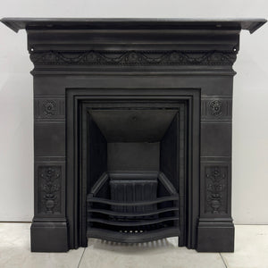 A beautifully proportioned Victorian antique cast iron combination fire. Featuring delicate floral motifs, garland detailing, and a classic urn design to the legs.