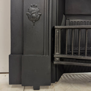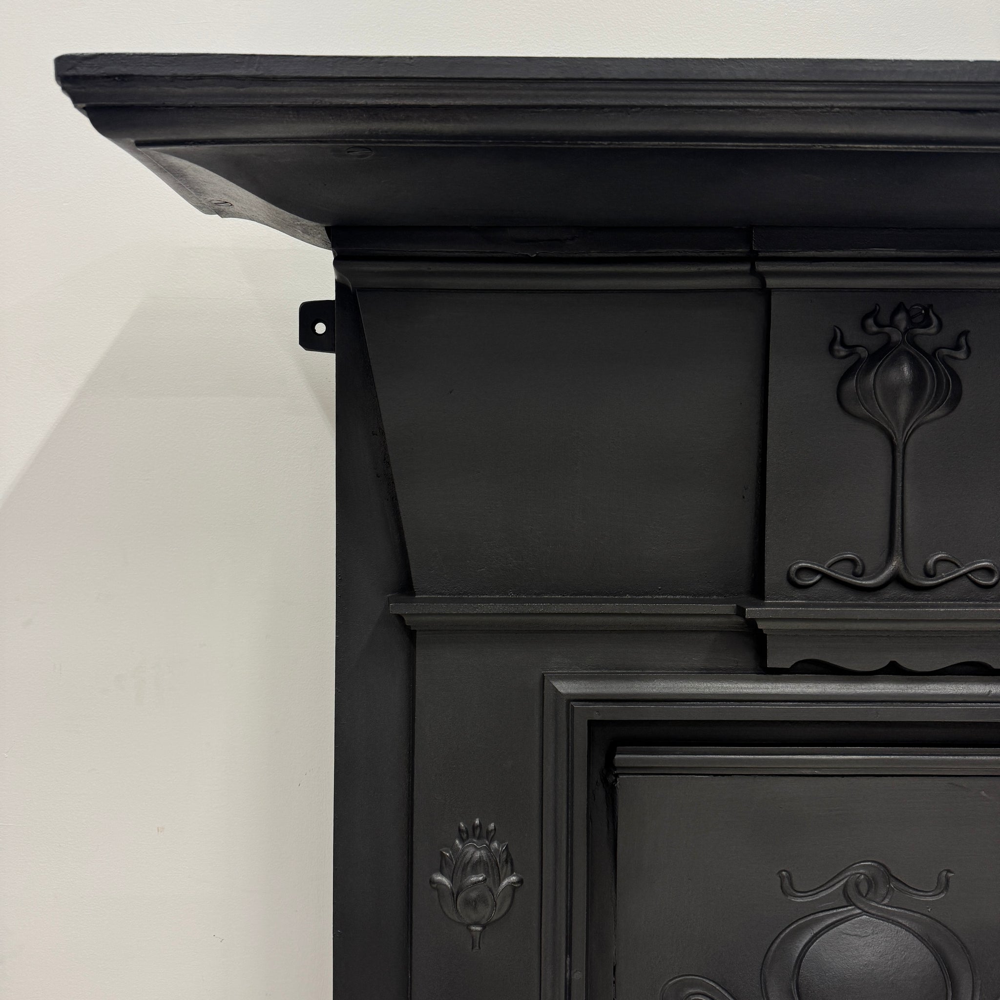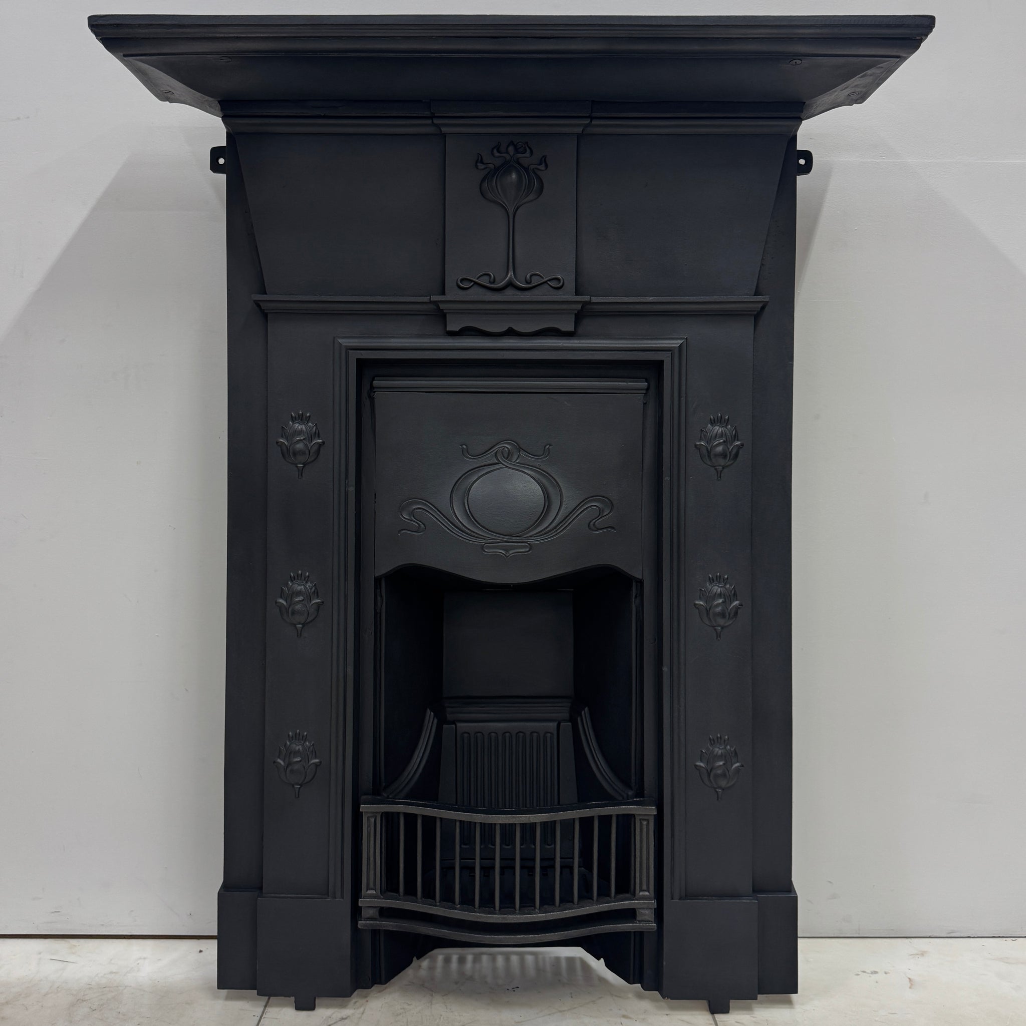This elegant design features stylised tulip motifs along the jambs and a central floral panel beneath the mantel, emblematic of the Art Nouveau movement’s flowing natural forms. The piece retains its original detailing throughout, with a deep shelf and integrated fireback and grate.
