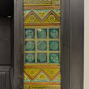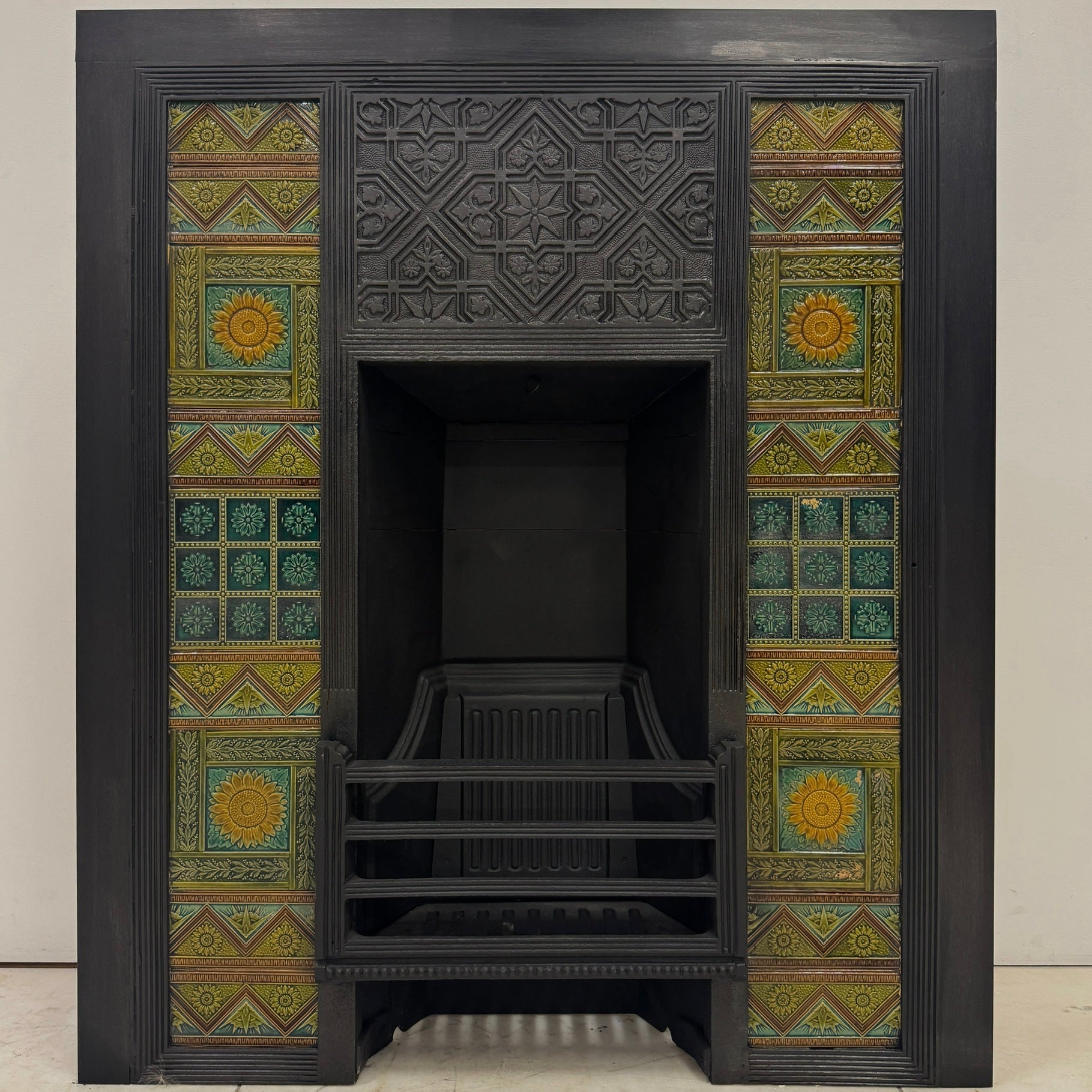 The fireplace features intricate geometric fretwork panels typical of Jeckyll’s Anglo-Japanese style. Paired with a superb set of original hand painted tiles in rich green, ochre and terracotta tones. The sunflower motif is a hallmark of the Aesthetic Movement that symbolises nature, beauty and artistic craftsmanship.
