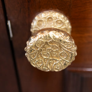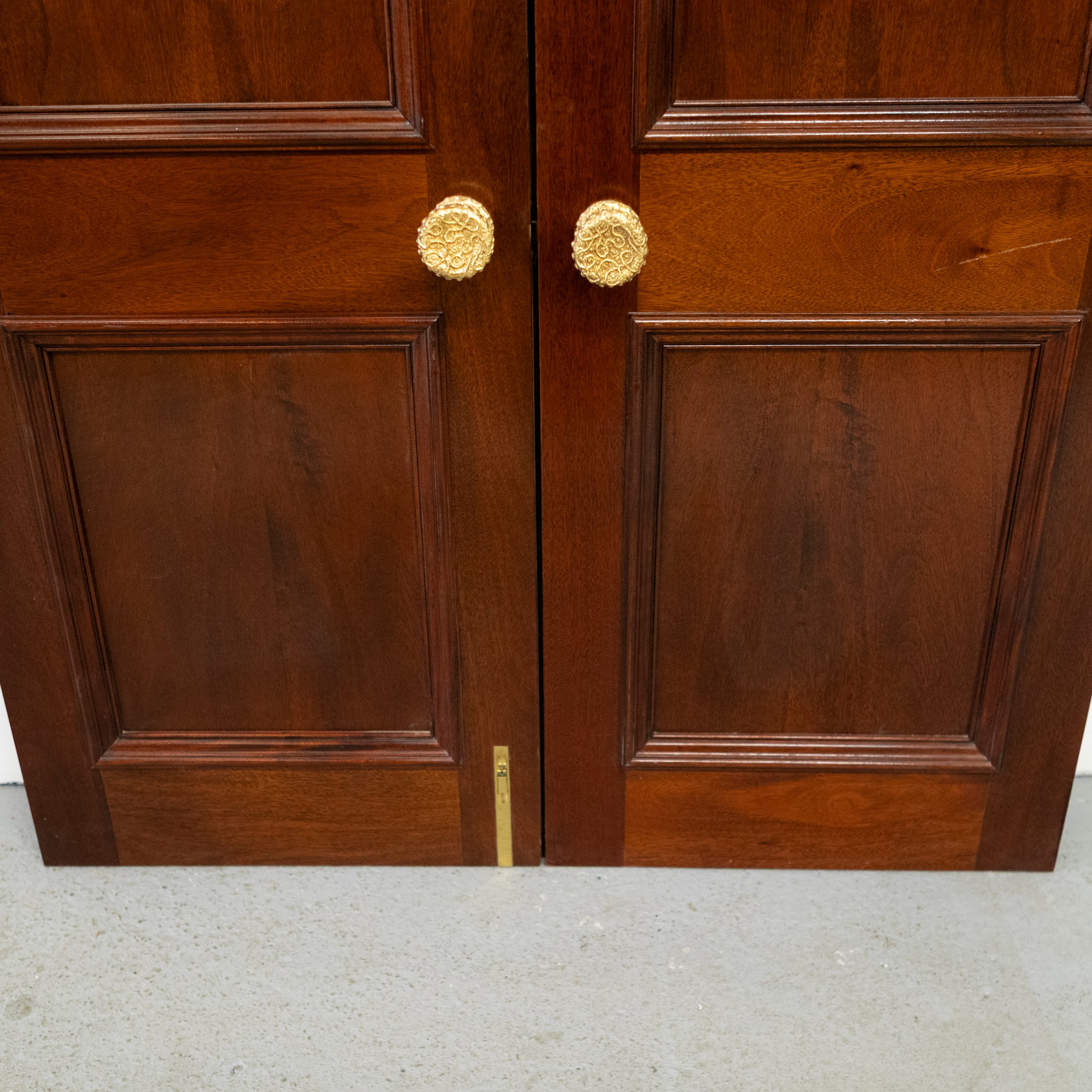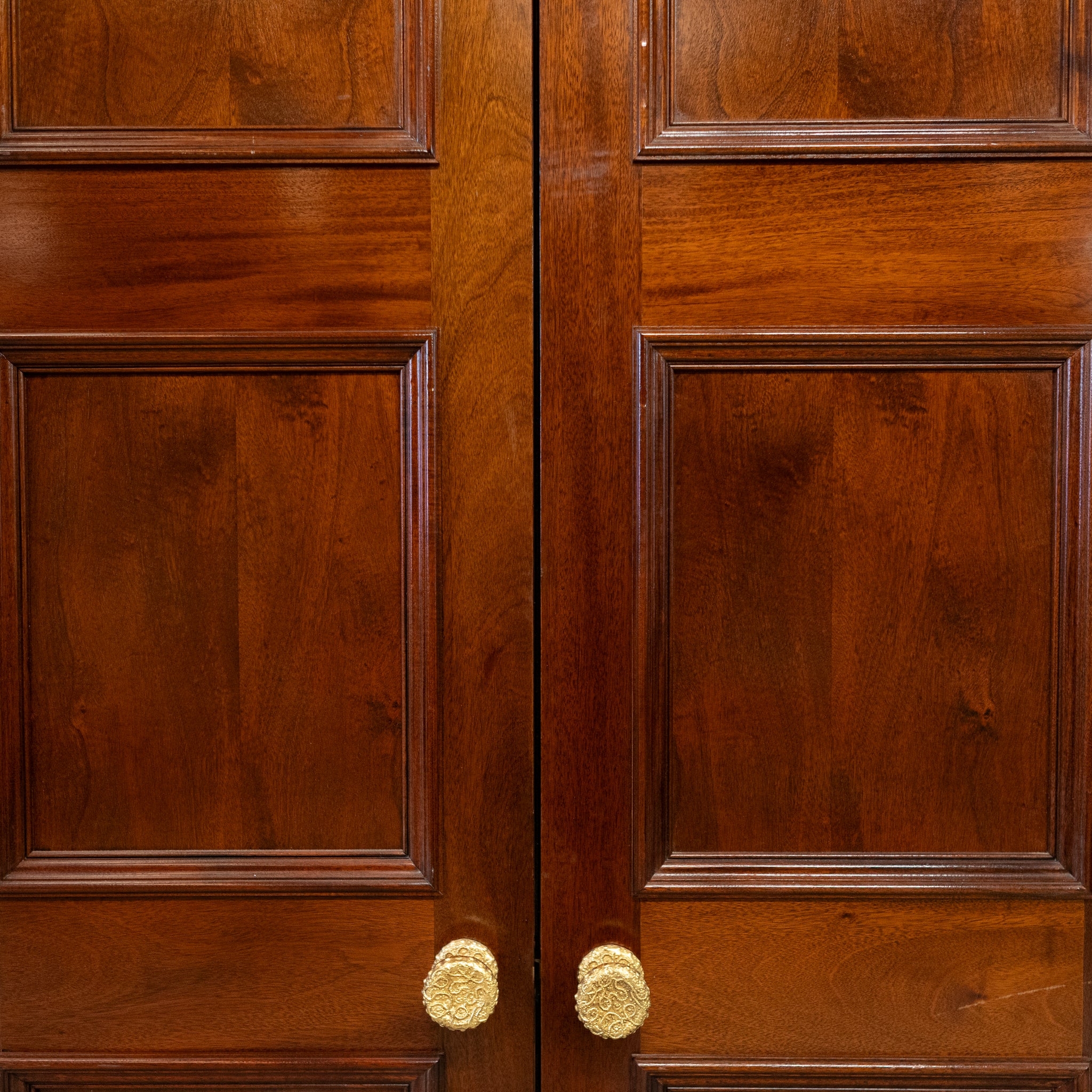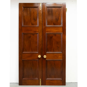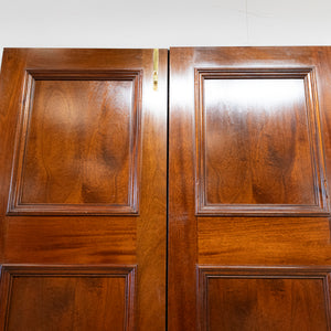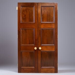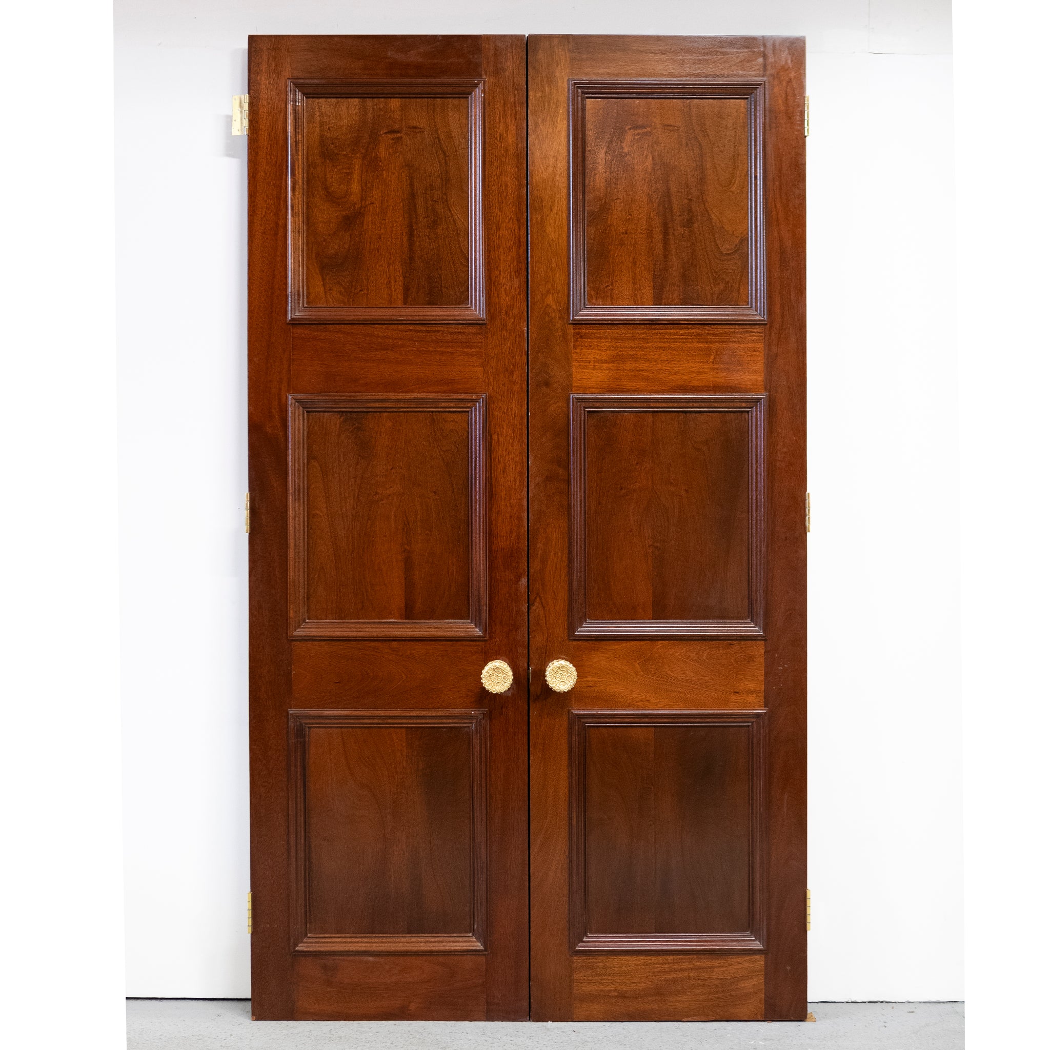 A distinguished pair of large reclaimed double doors, finely crafted from solid mahogany. The doors present a classic six-panel design, and the rich, lustrous finish accentuates the natural grain and patina. A very impressive entranceway with exquisite brass handles.