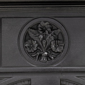 A well-cast surround with classical mouldings, floral garlands and a central roundel above an arched opening.