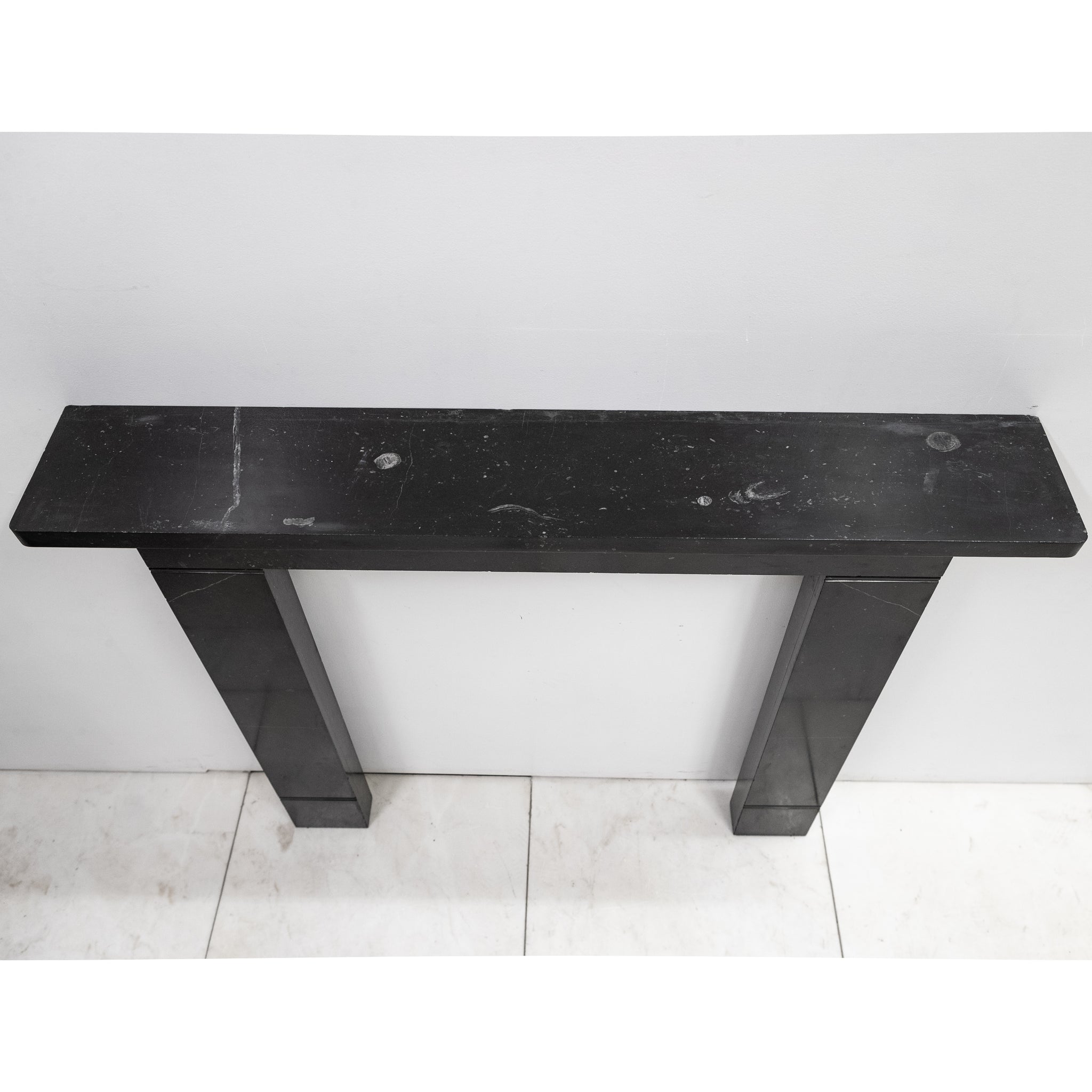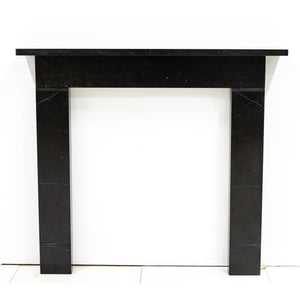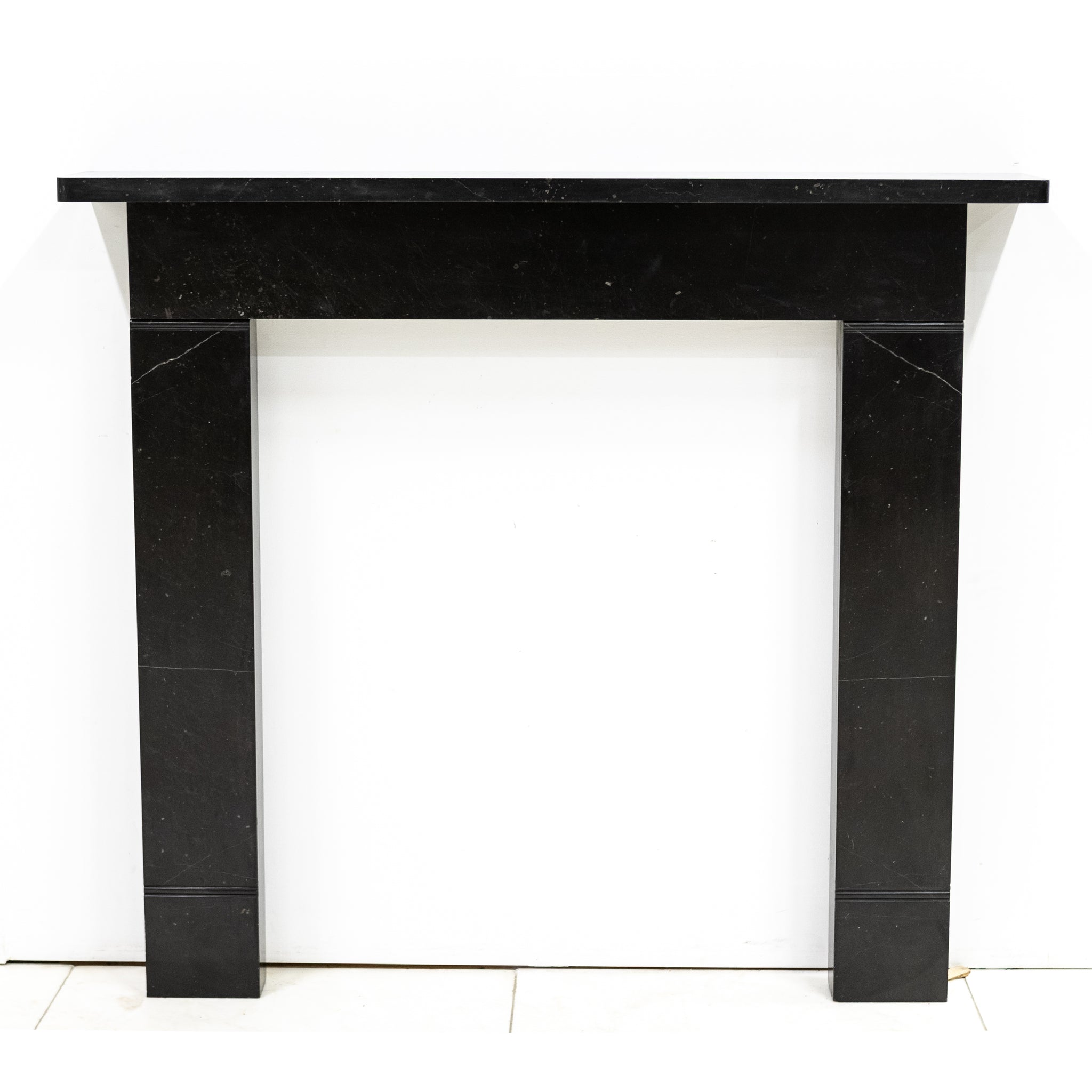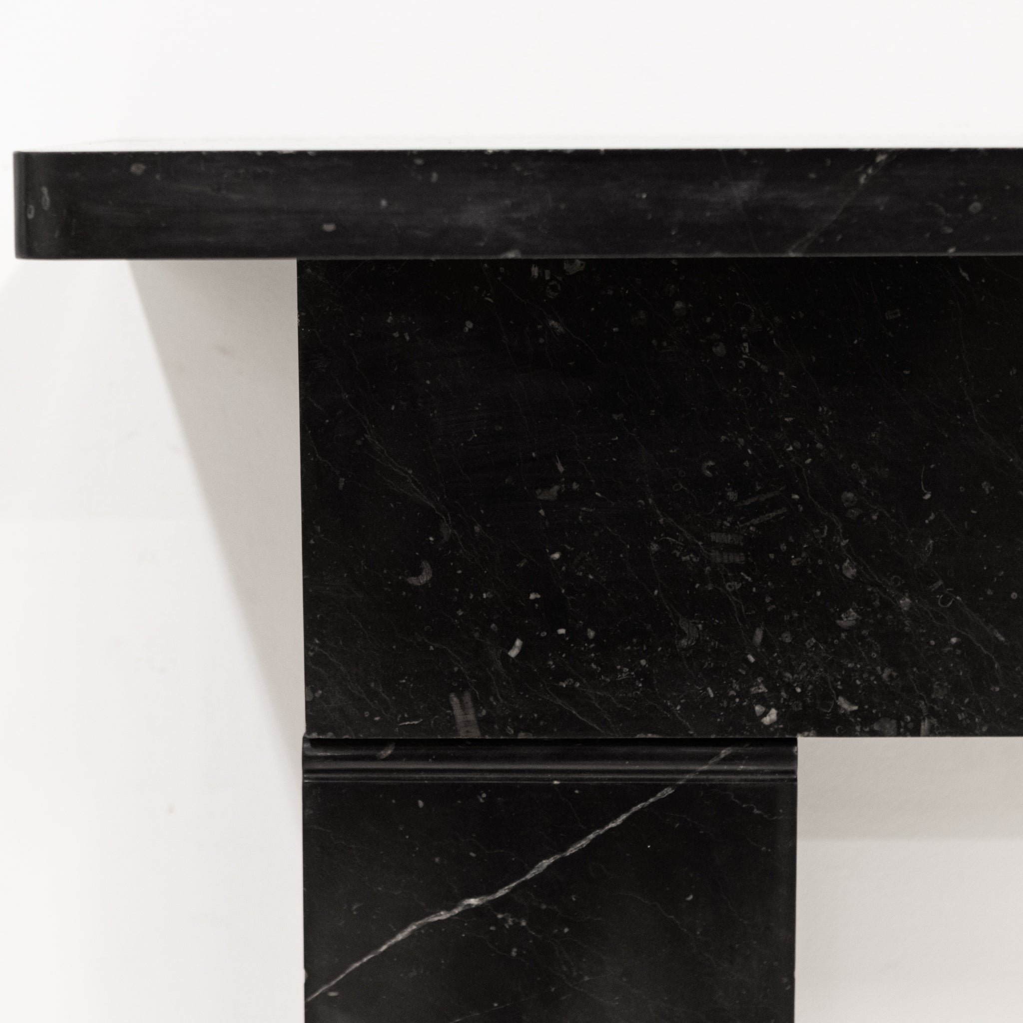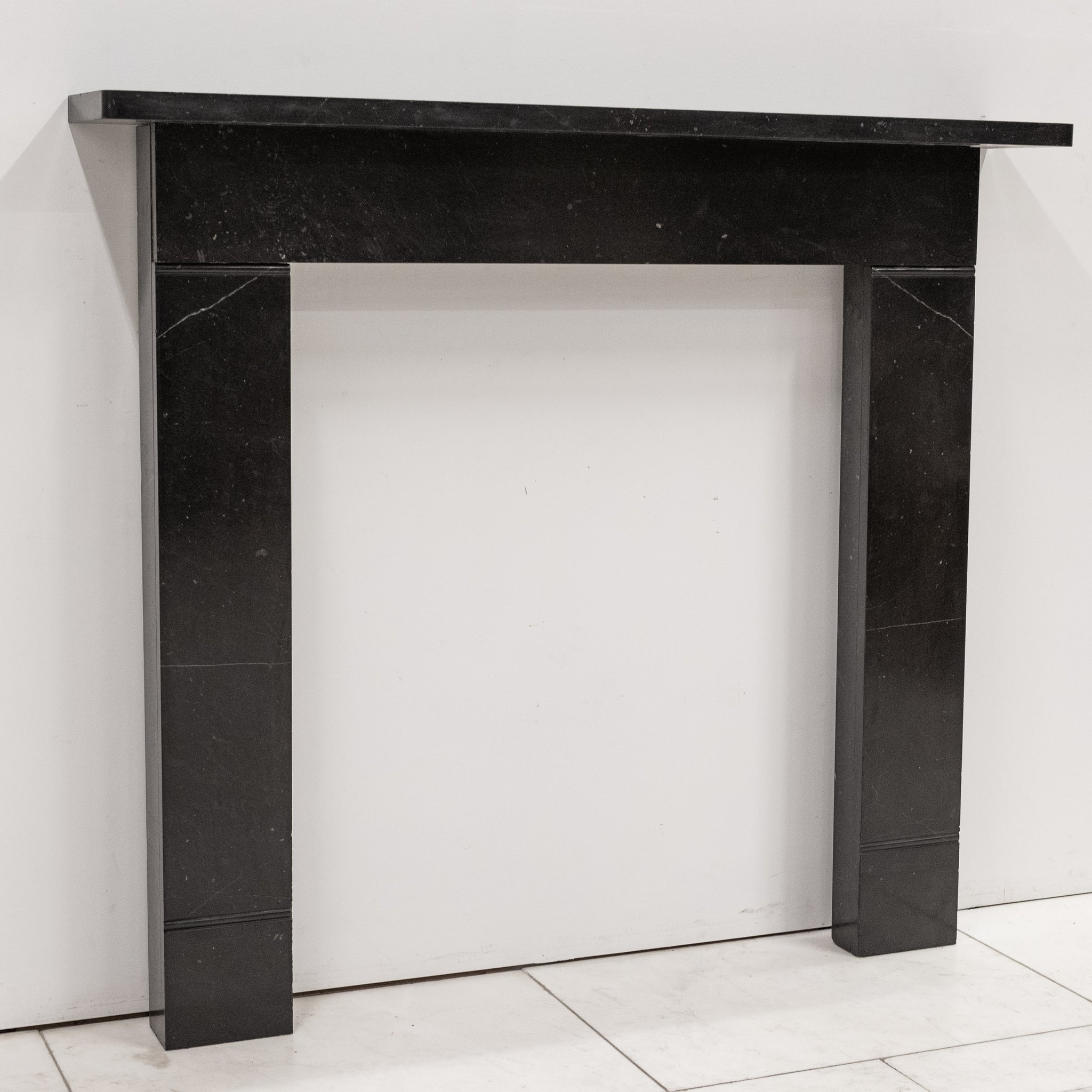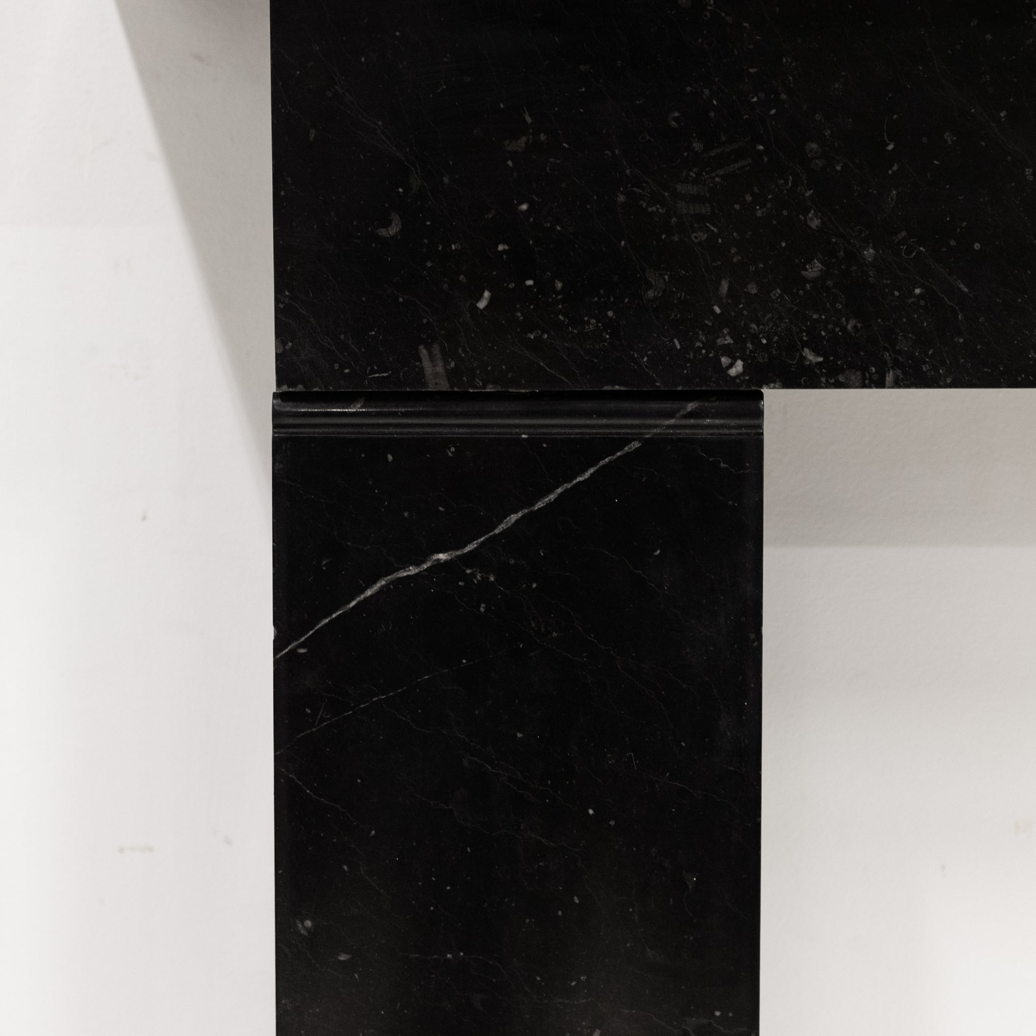 The surround is beautifully proportioned, with a broad, understated mantel shelf above cleanly defined jambs, all cut from dense Belgian Black marble richly figured with natural and fossil inclusions.