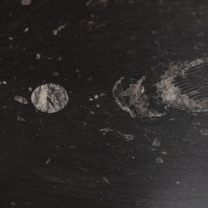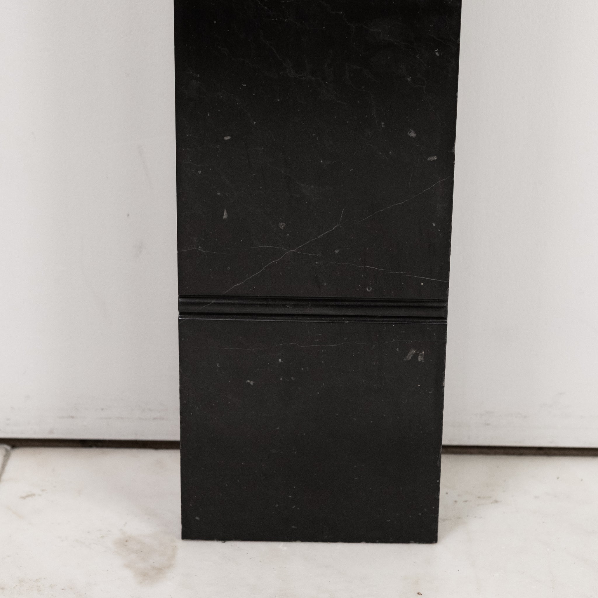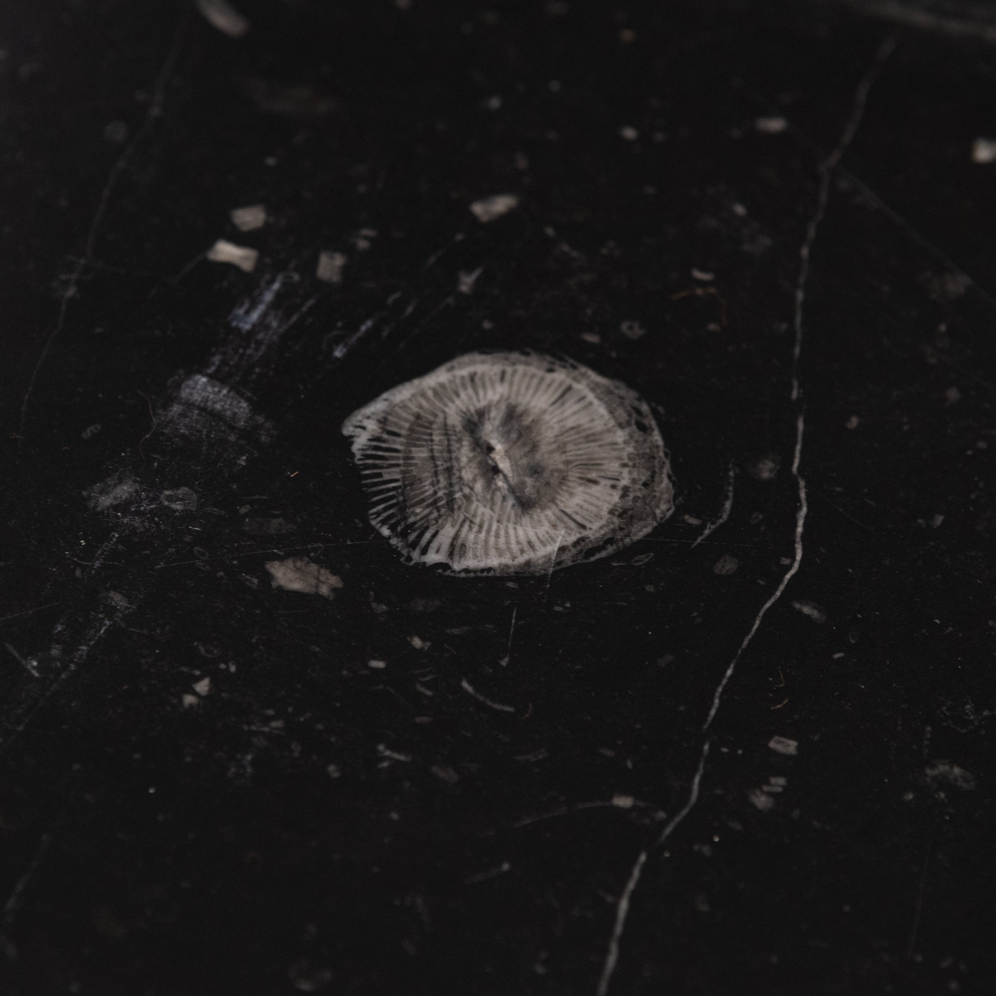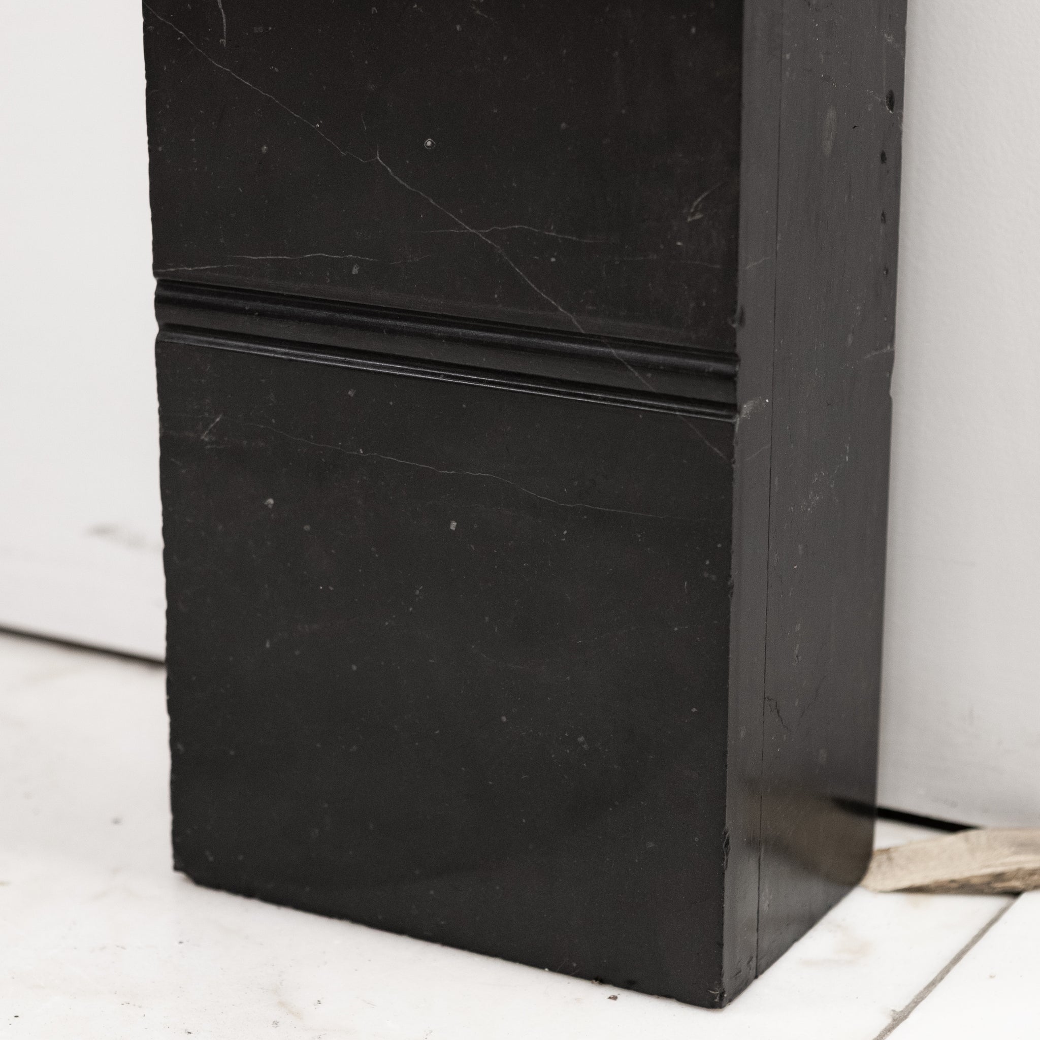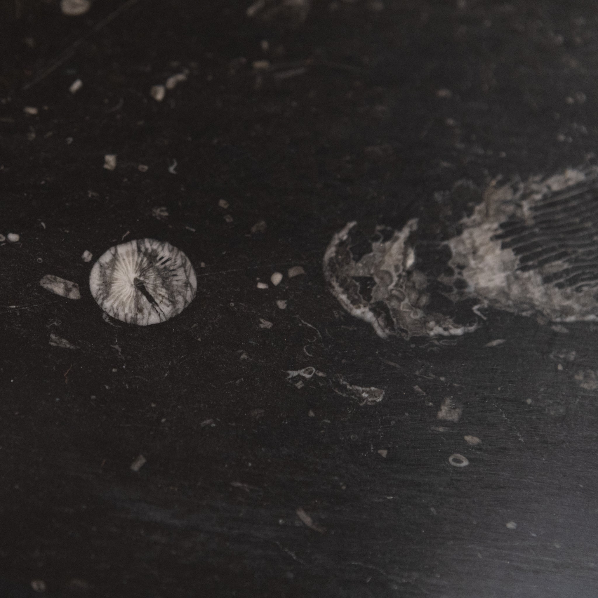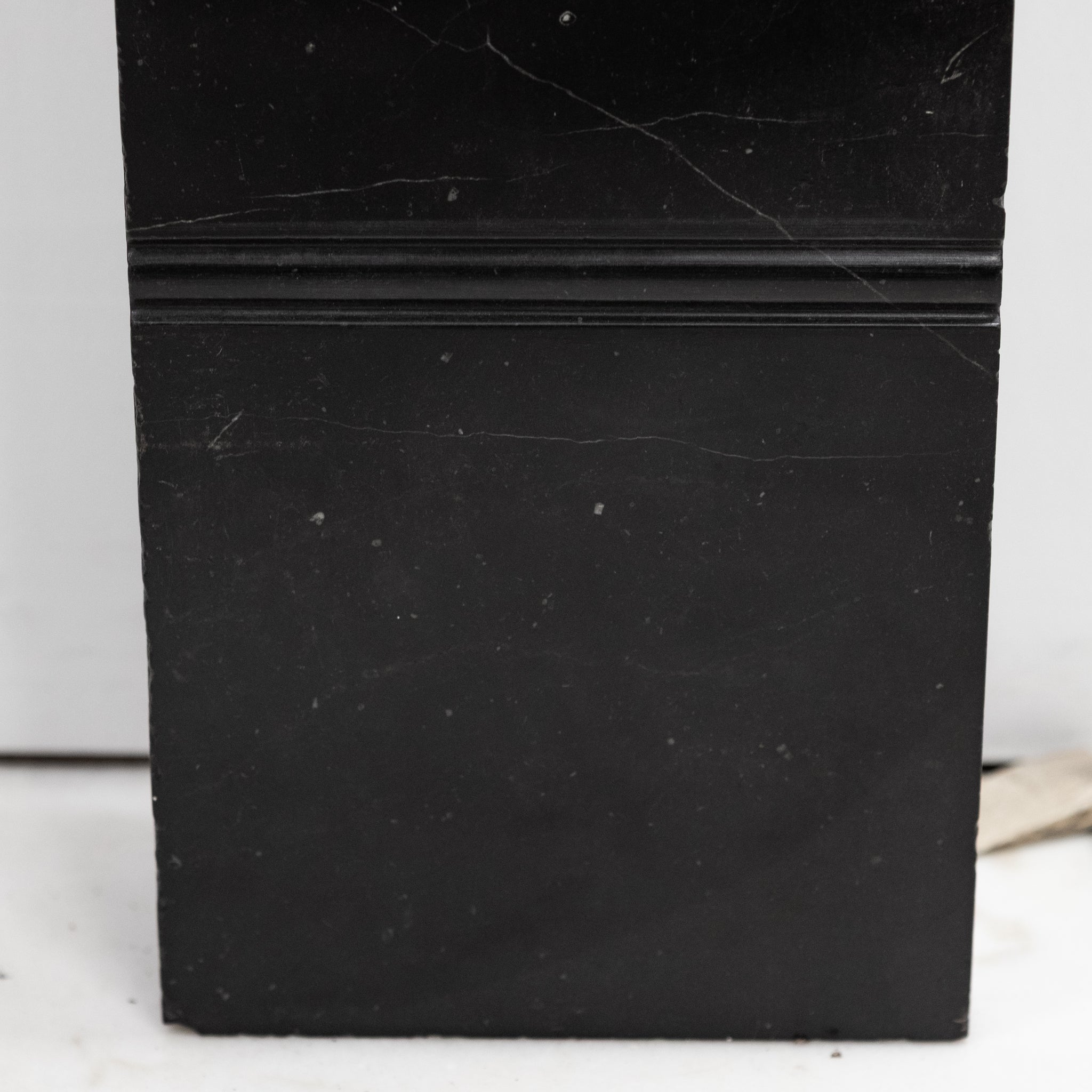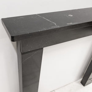 The surround is beautifully proportioned, with a broad, understated mantel shelf above cleanly defined jambs, all cut from dense Belgian Black marble richly figured with natural and fossil inclusions.