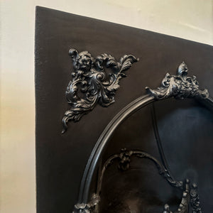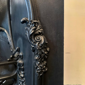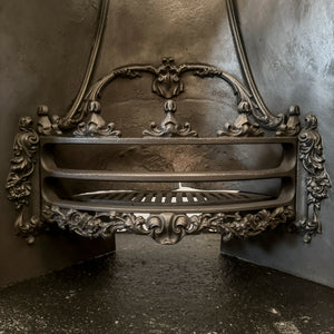 This cast iron insert is adorned with floral motifs to the inner and outer elements of the insert, these charming flamboyant designs are typical of the period and are echoed throughout the piece including the backplate and the 2 bar integral basket.