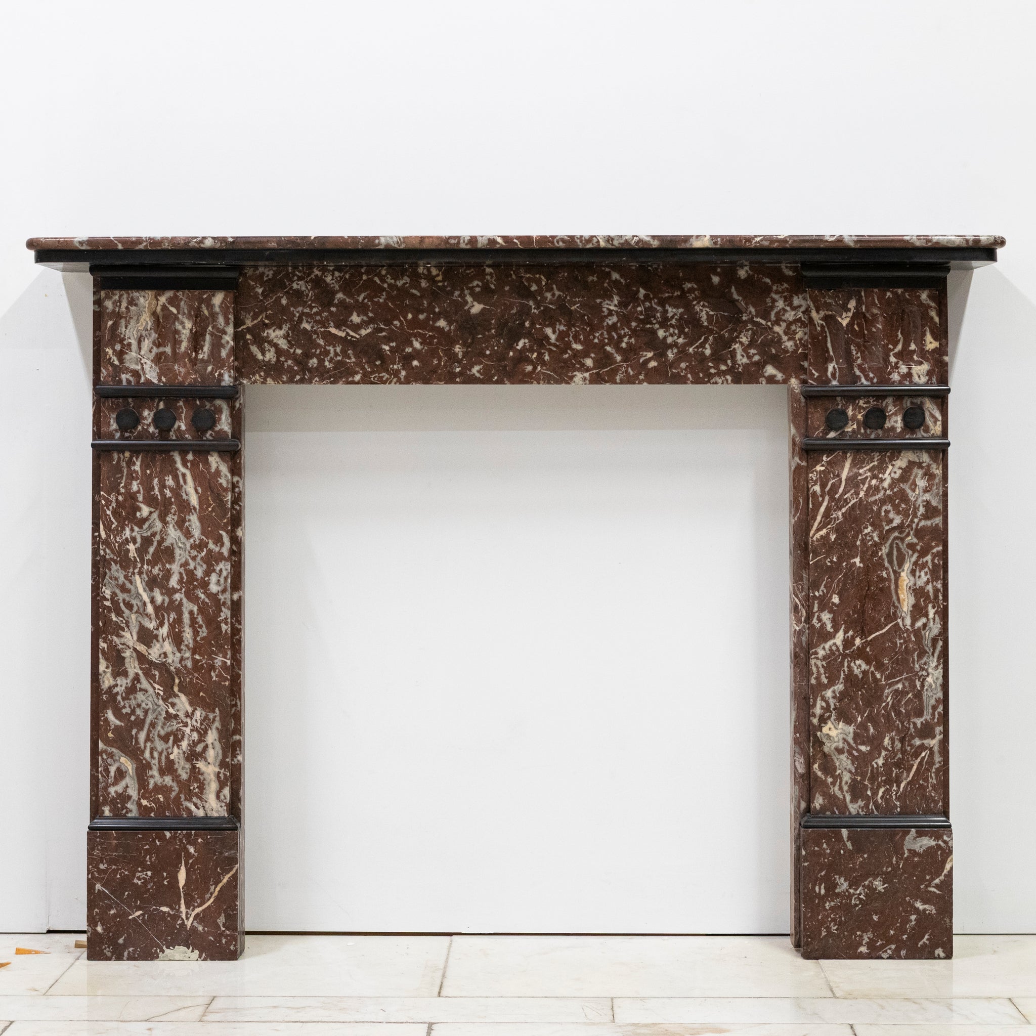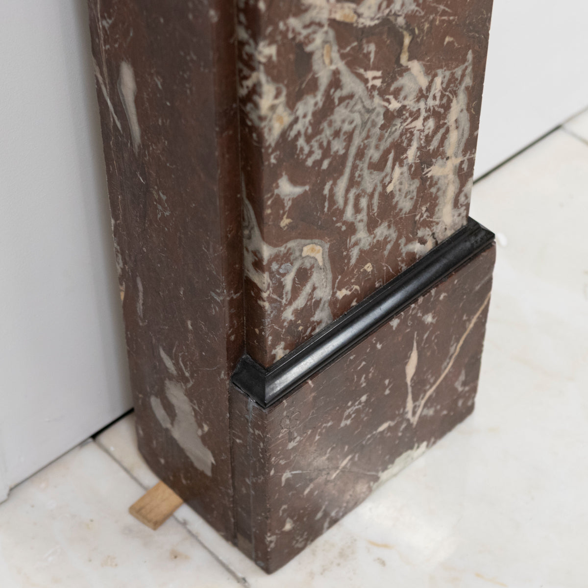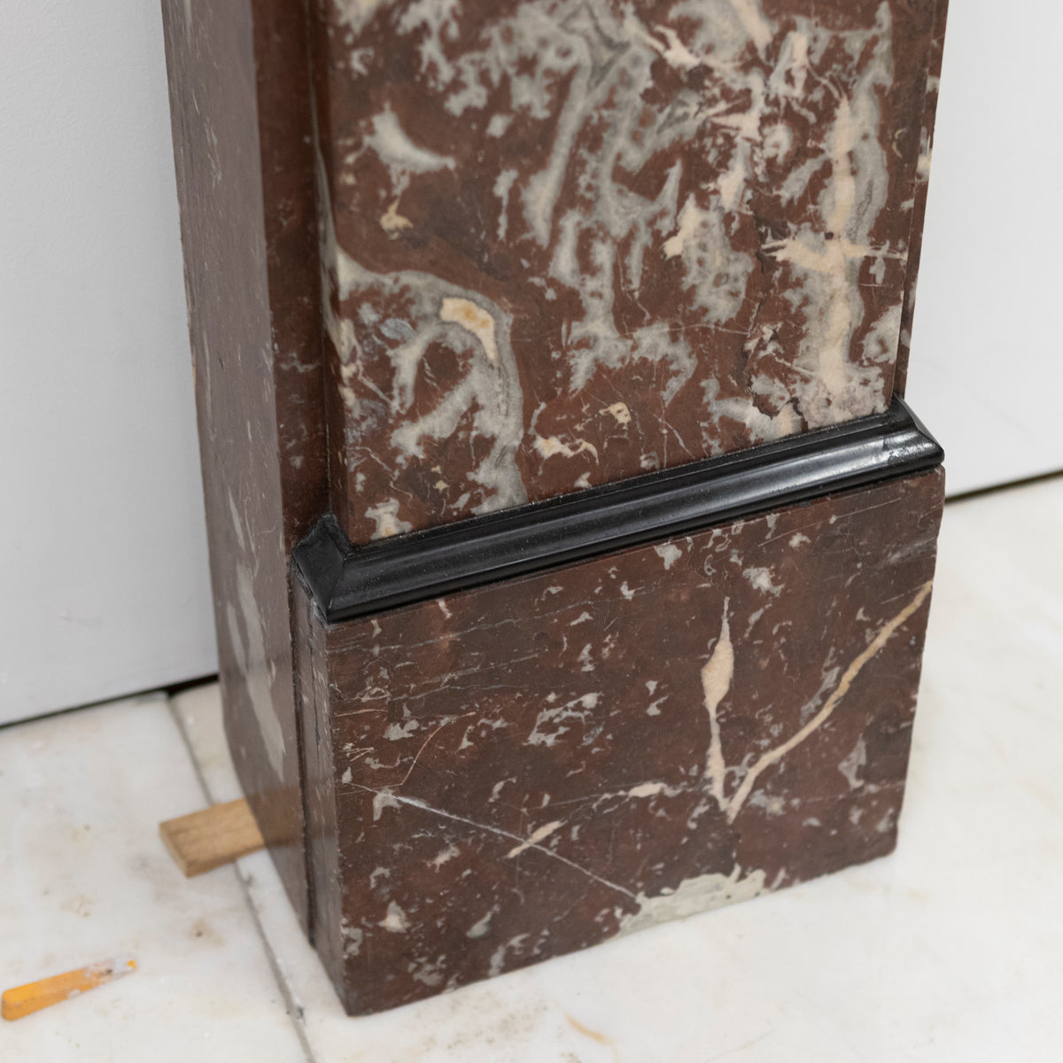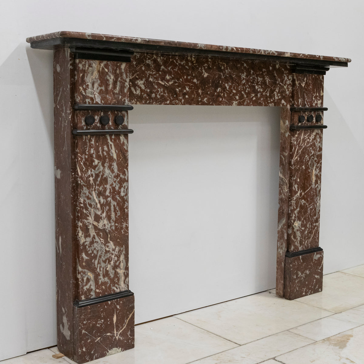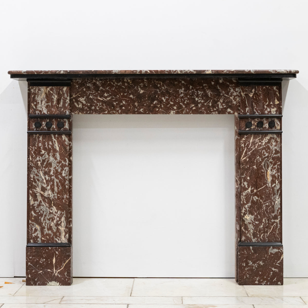 Rouge marble is contrasted against black accents in this original period chimneypiece. Carved thumbnail details surmount each jamb. A substantial bevelled shelf finishes the piece. Restored at our Hertfordshire warehouse.
