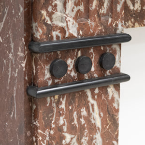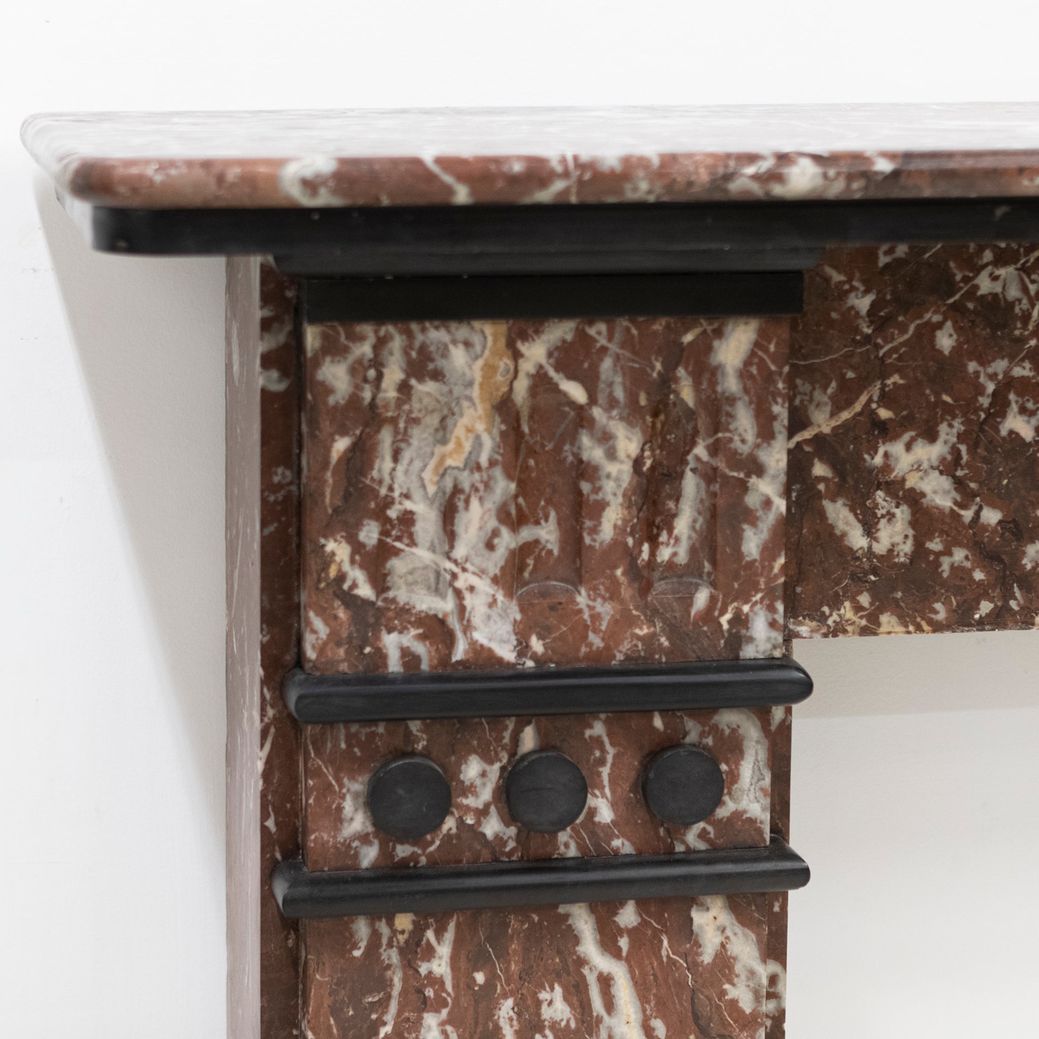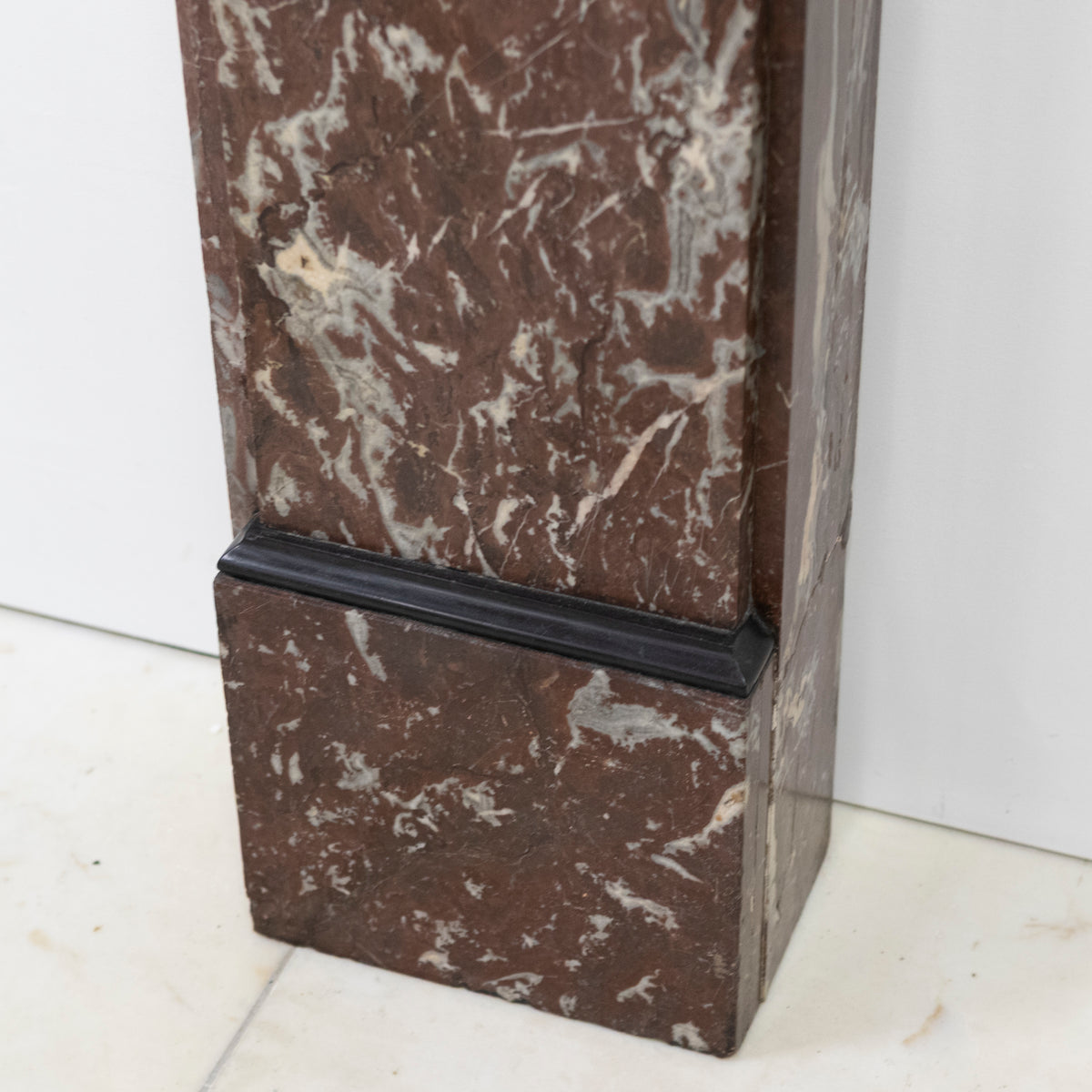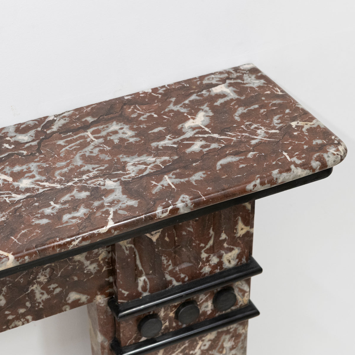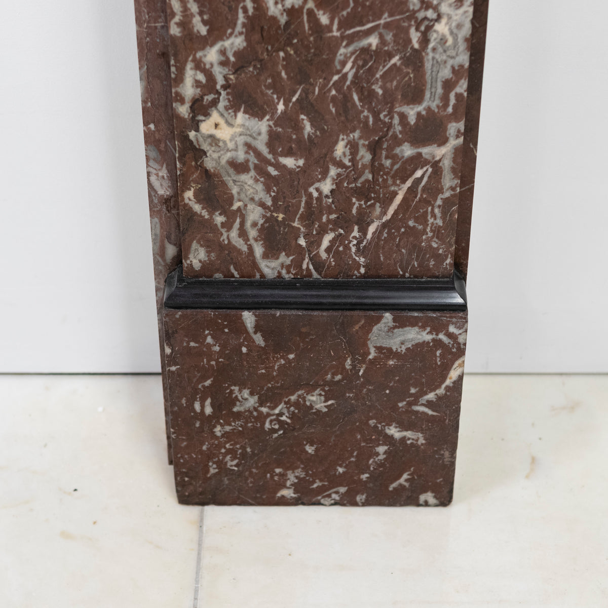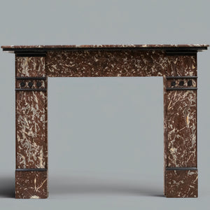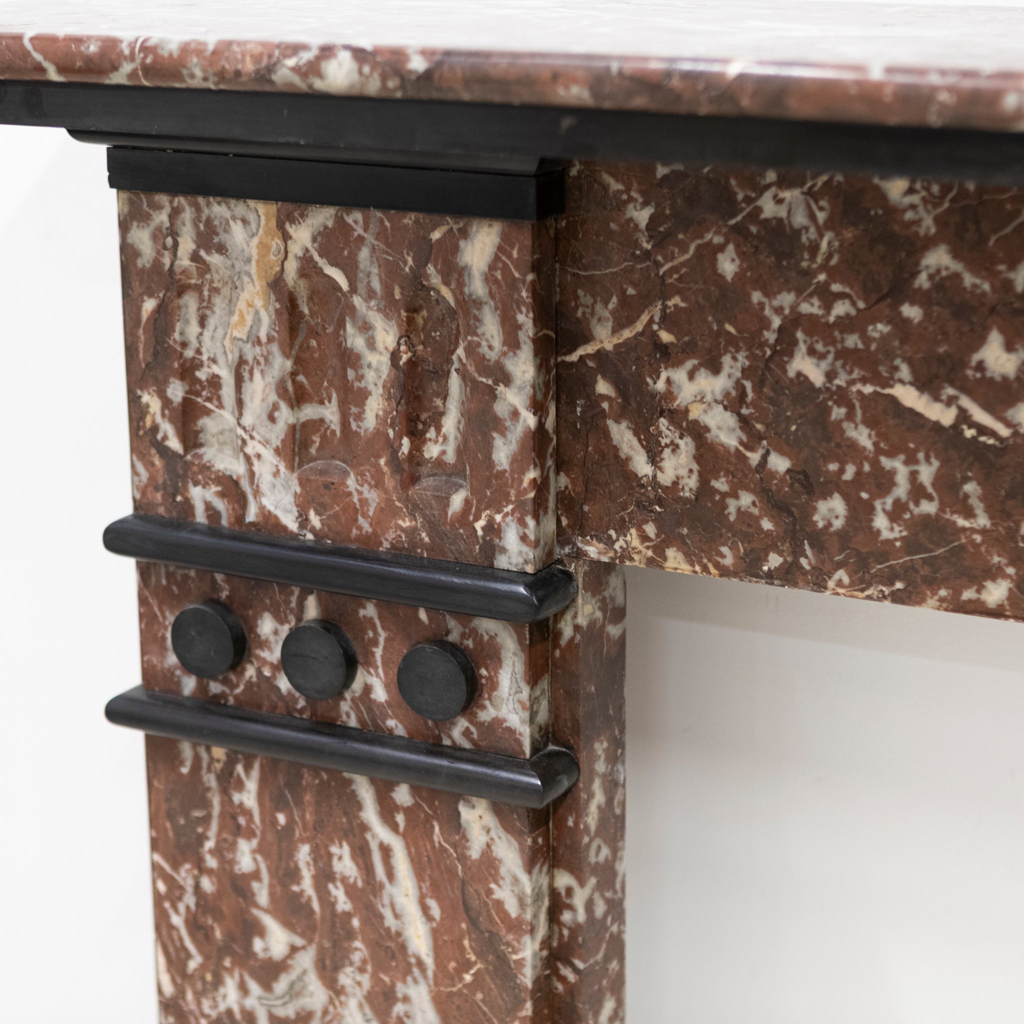 Rouge marble is contrasted against black accents in this original period chimneypiece. Carved thumbnail details surmount each jamb. A substantial bevelled shelf finishes the piece. Restored at our Hertfordshire warehouse.