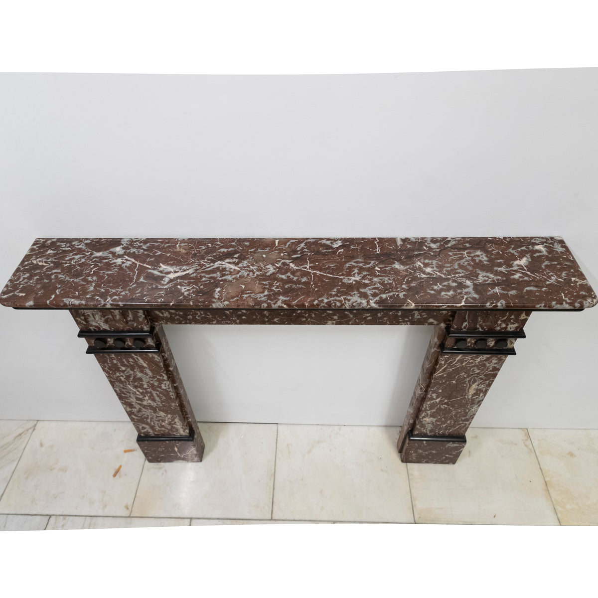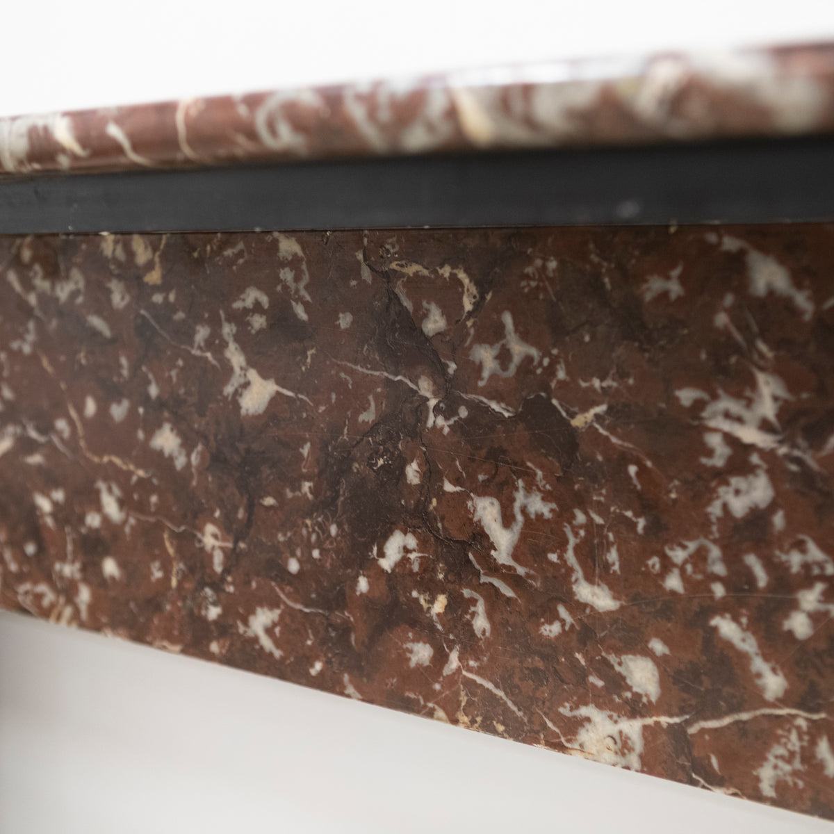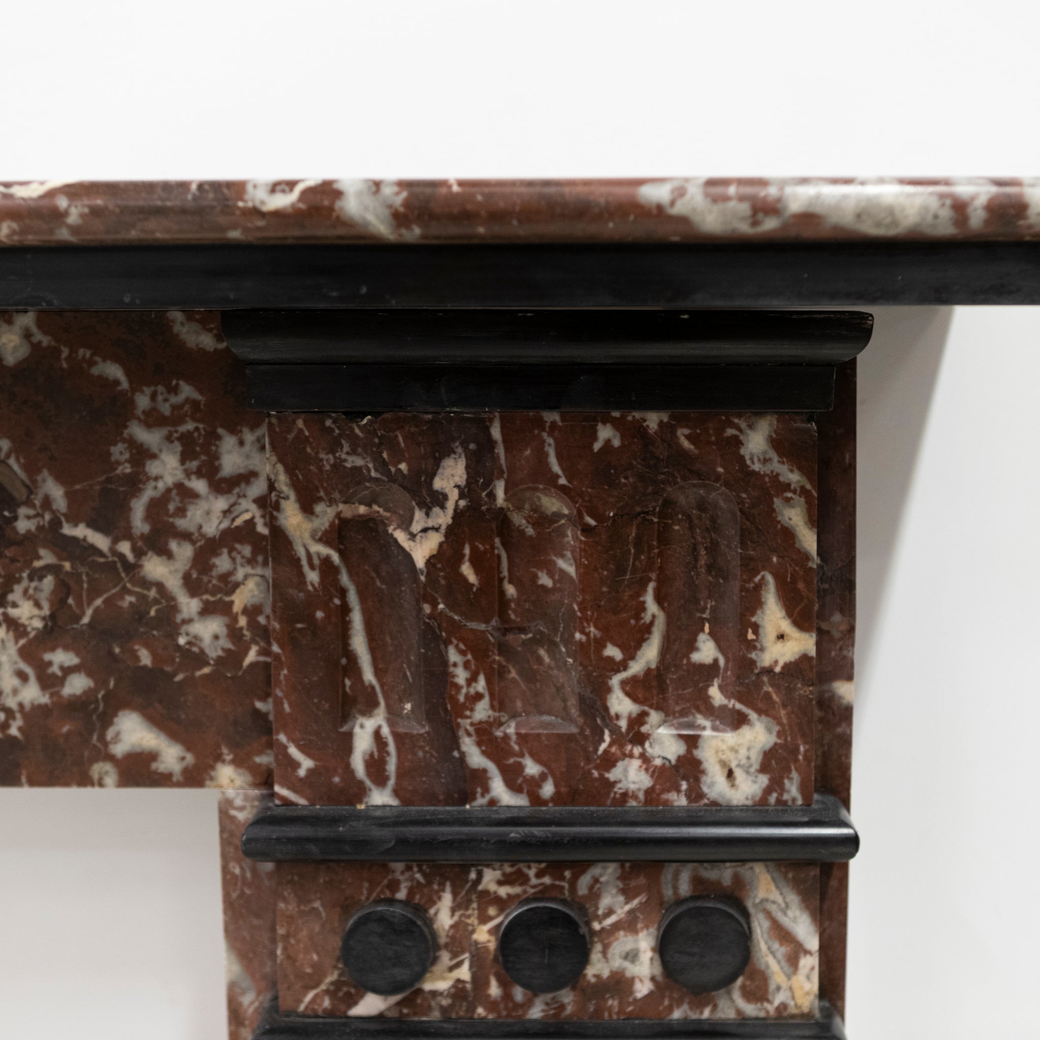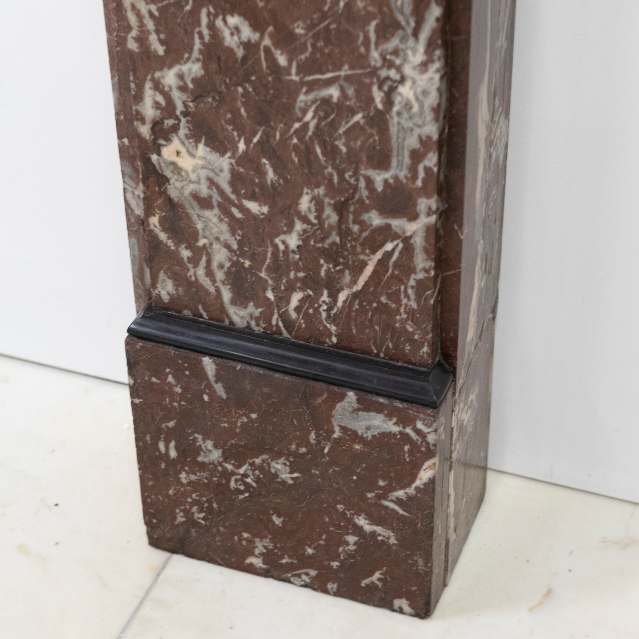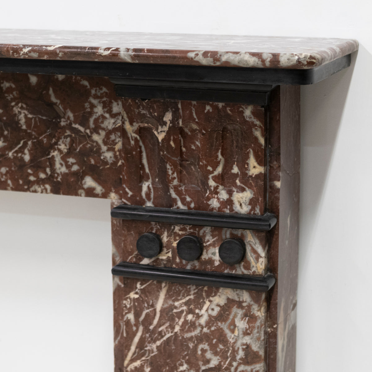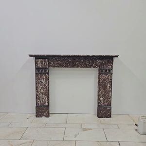 Rouge marble is contrasted against black accents in this original period chimneypiece. Carved thumbnail details surmount each jamb. A substantial bevelled shelf finishes the piece. Restored at our Hertfordshire warehouse.