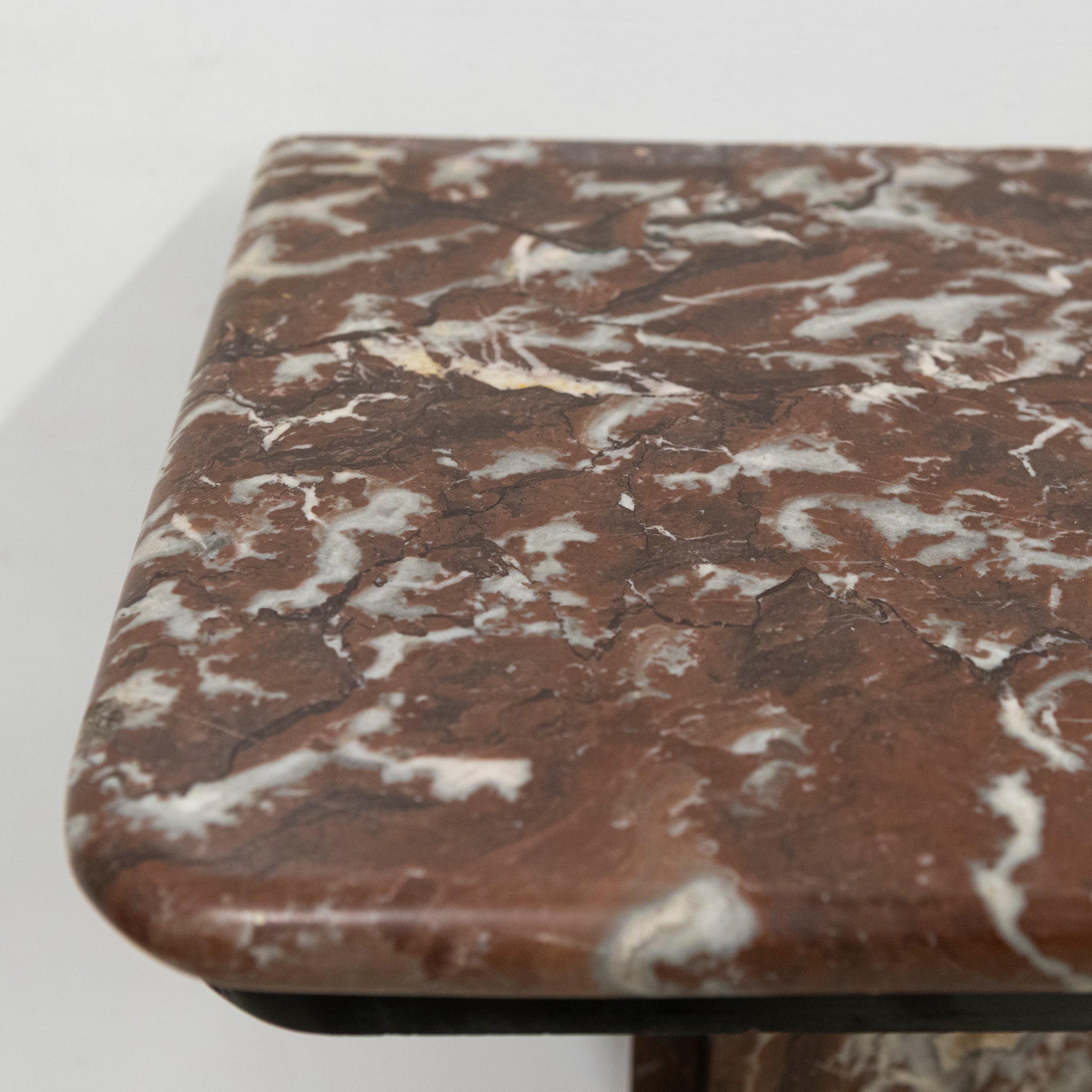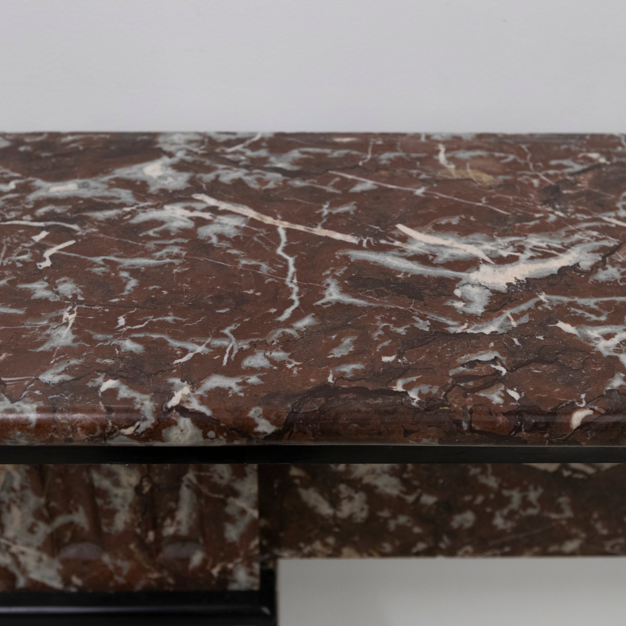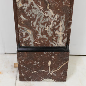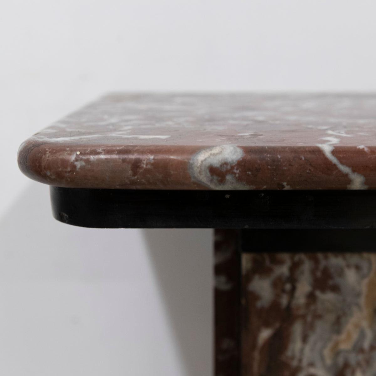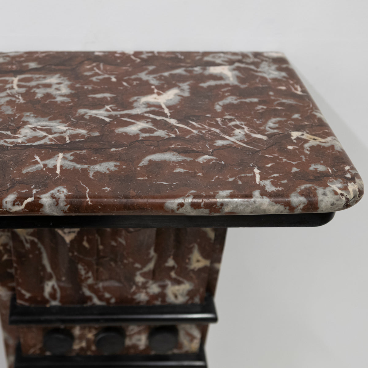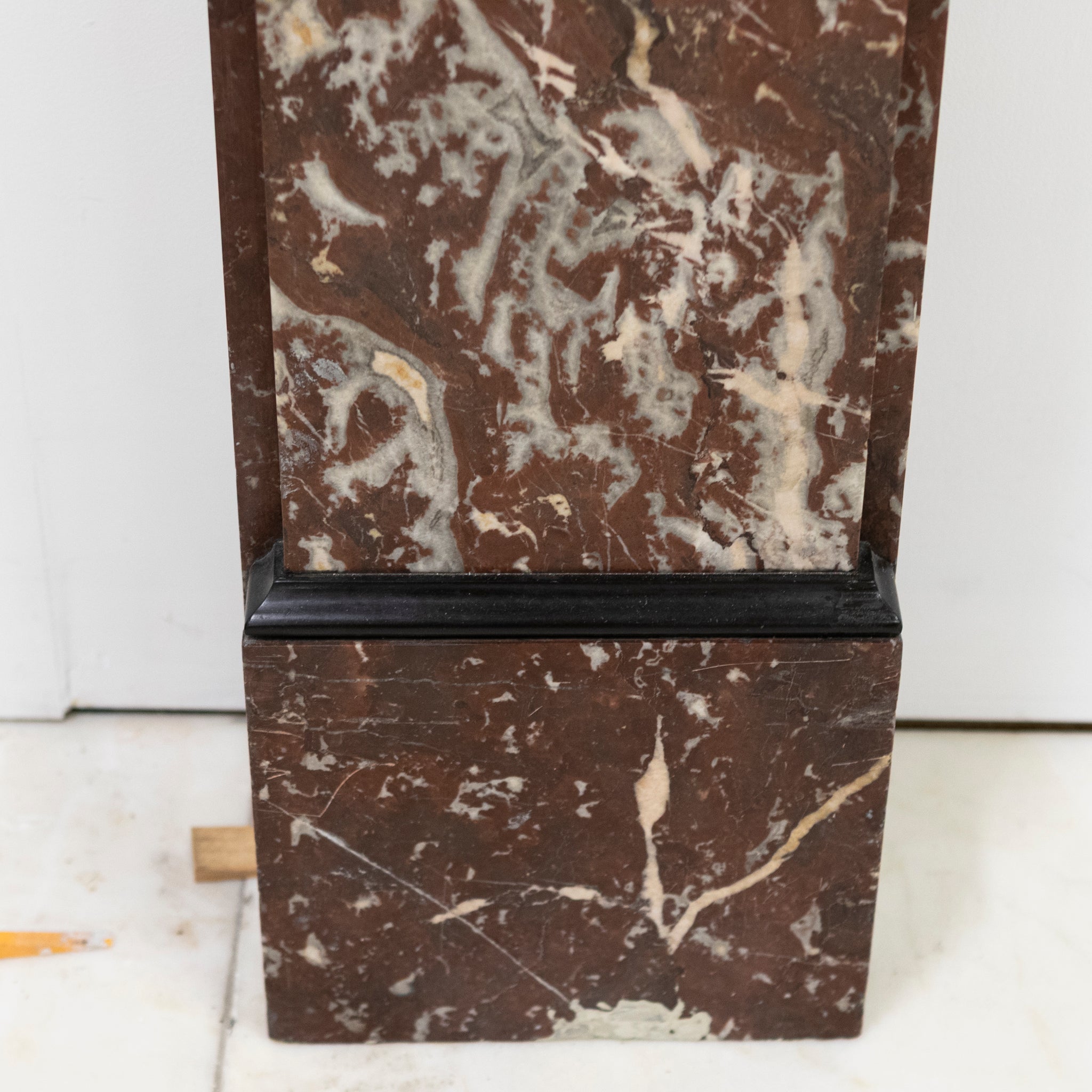 Rouge marble is contrasted against black accents in this original period chimneypiece. Carved thumbnail details surmount each jamb. A substantial bevelled shelf finishes the piece. Restored at our Hertfordshire warehouse.