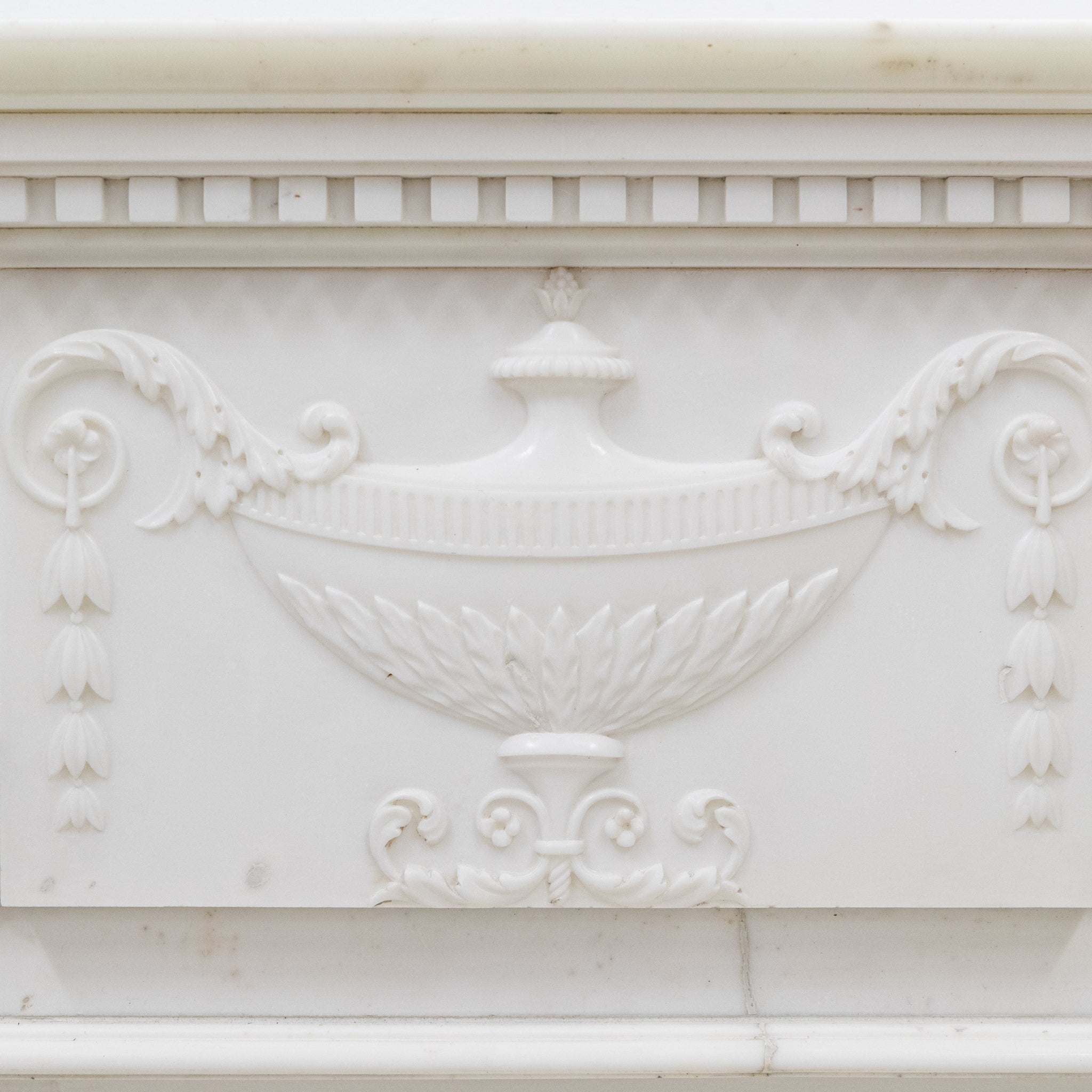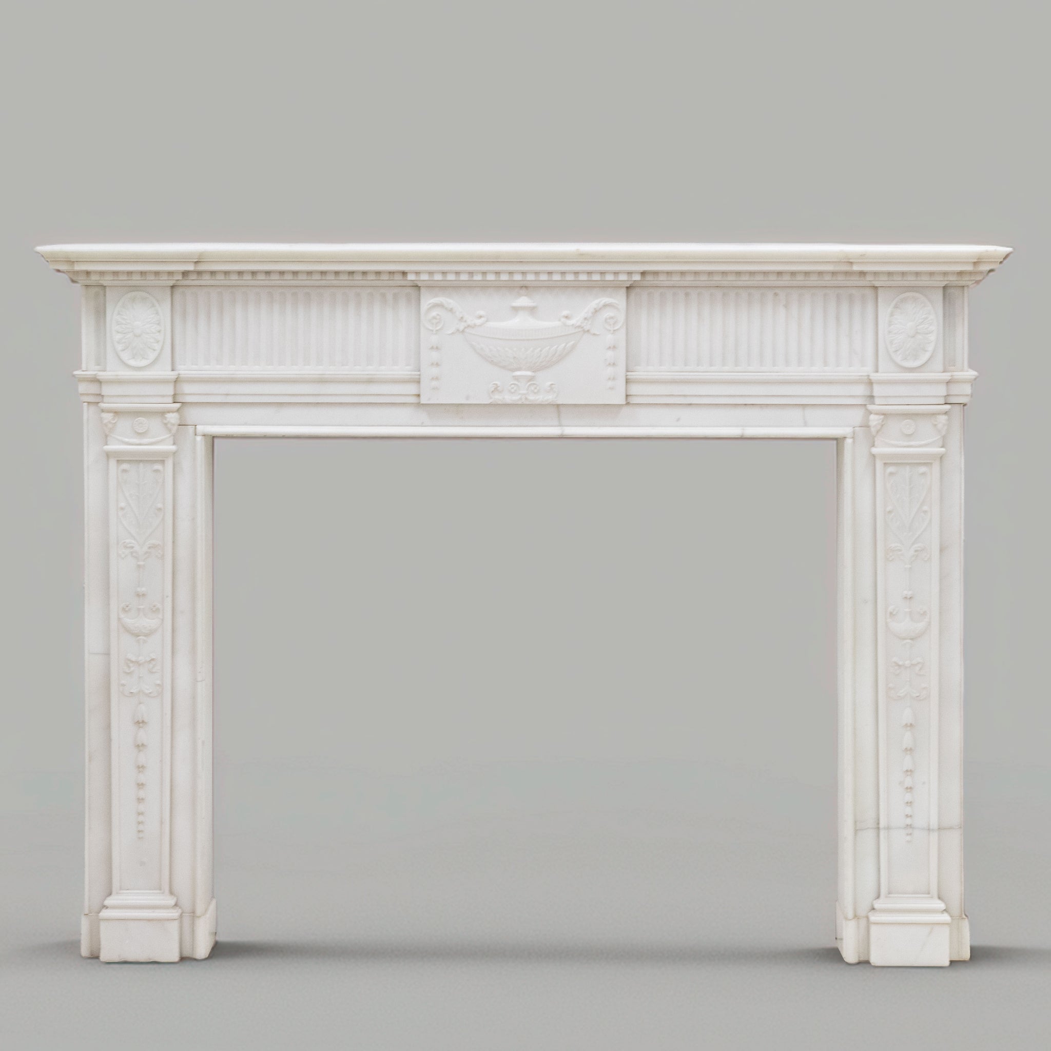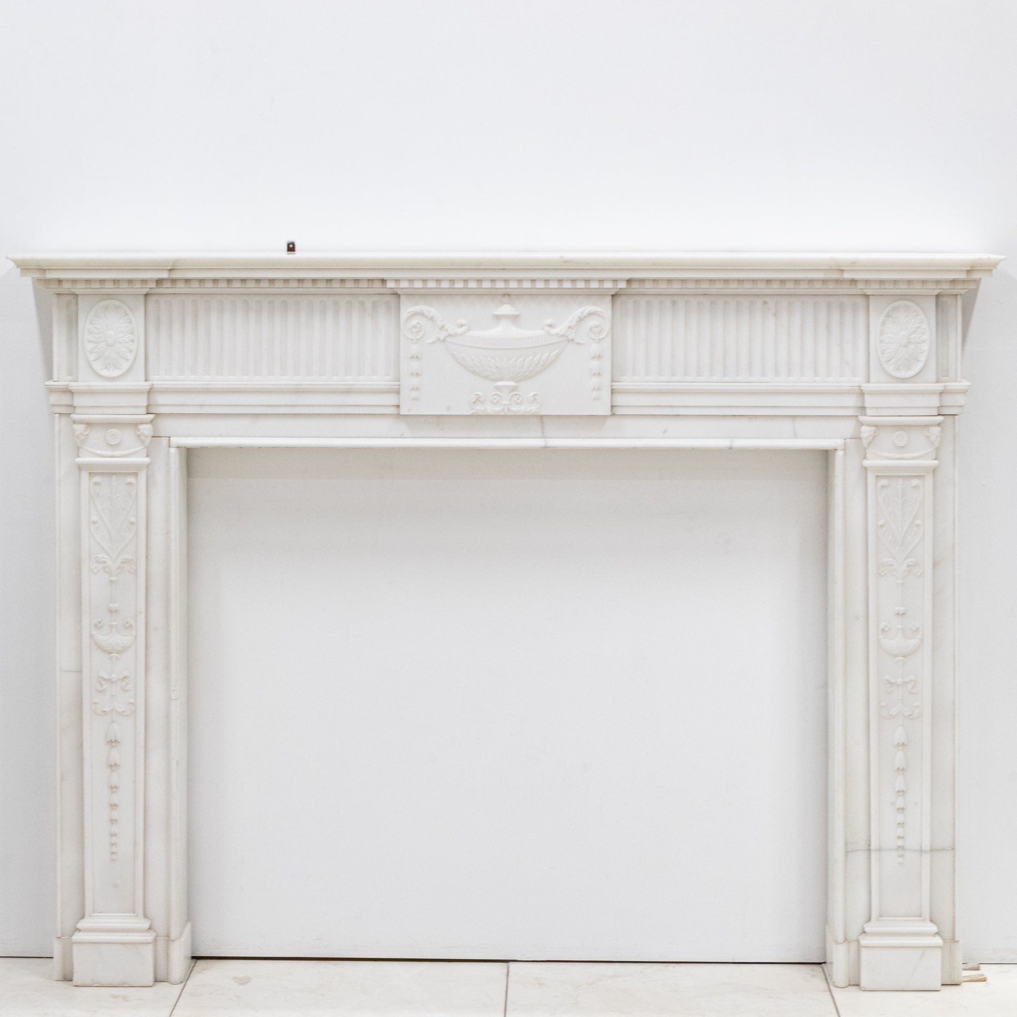 Strongly rooted in the neoclassical language popularised by Robert Adam, the design draws on the refined vocabulary of late 18th century interiors. The frieze is crisply fluted and centred by an elegant classical urn tablet, suspended with swags and finely modelled husks.