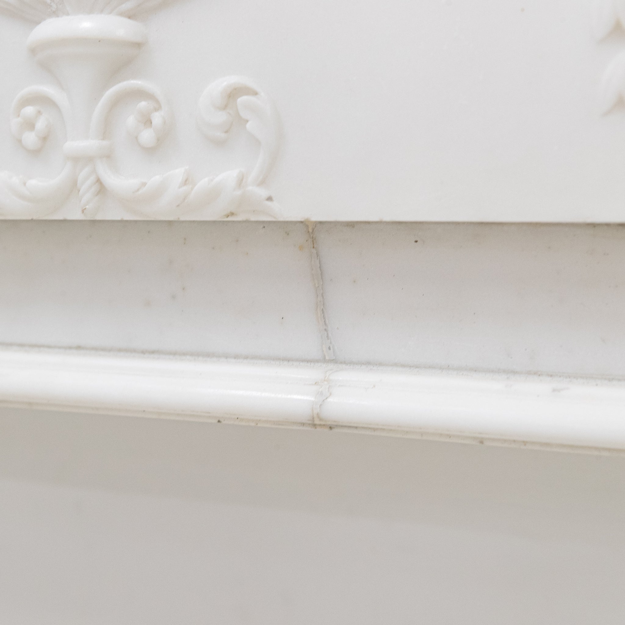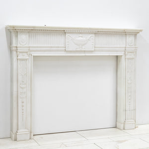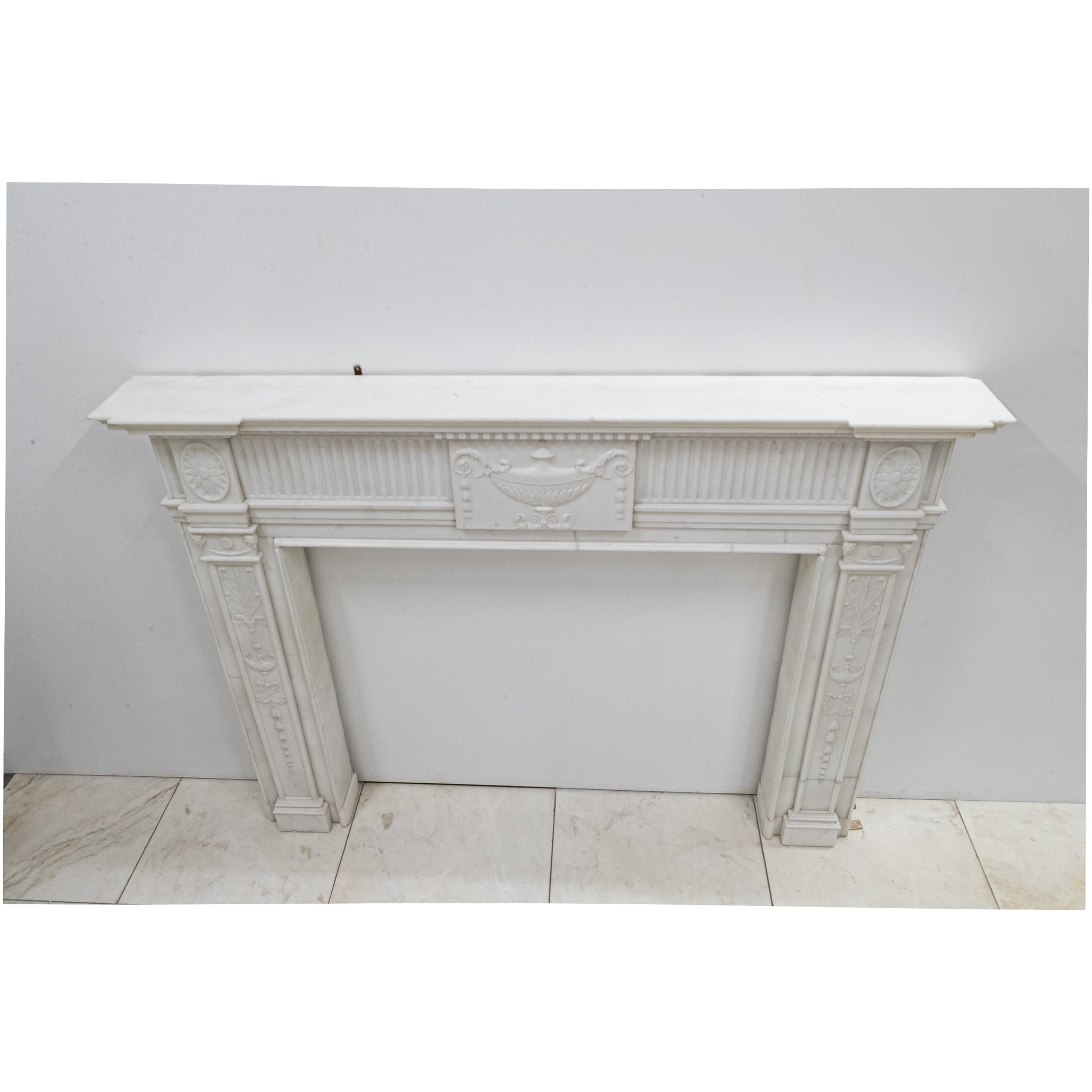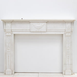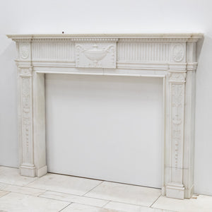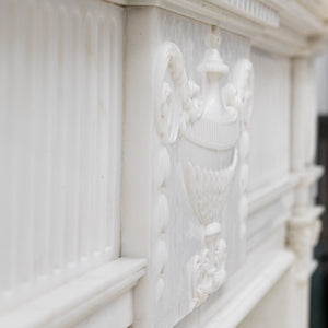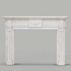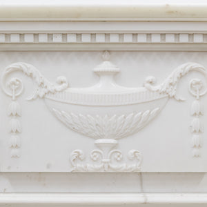 Strongly rooted in the neoclassical language popularised by Robert Adam, the design draws on the refined vocabulary of late 18th century interiors. The frieze is crisply fluted and centred by an elegant classical urn tablet, suspended with swags and finely modelled husks.