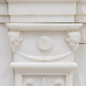 At either end, oval paterae provide balance, their petal carving sharp and deeply cut. The jambs are equally accomplished, with attenuated proportions and delicately carved foliate drops, terminating in distinctive ram’s head blocks linked by draped garlands — a strong neoclassical motif referencing sacrifice and antiquity, and indicative of a sophisticated workshop.