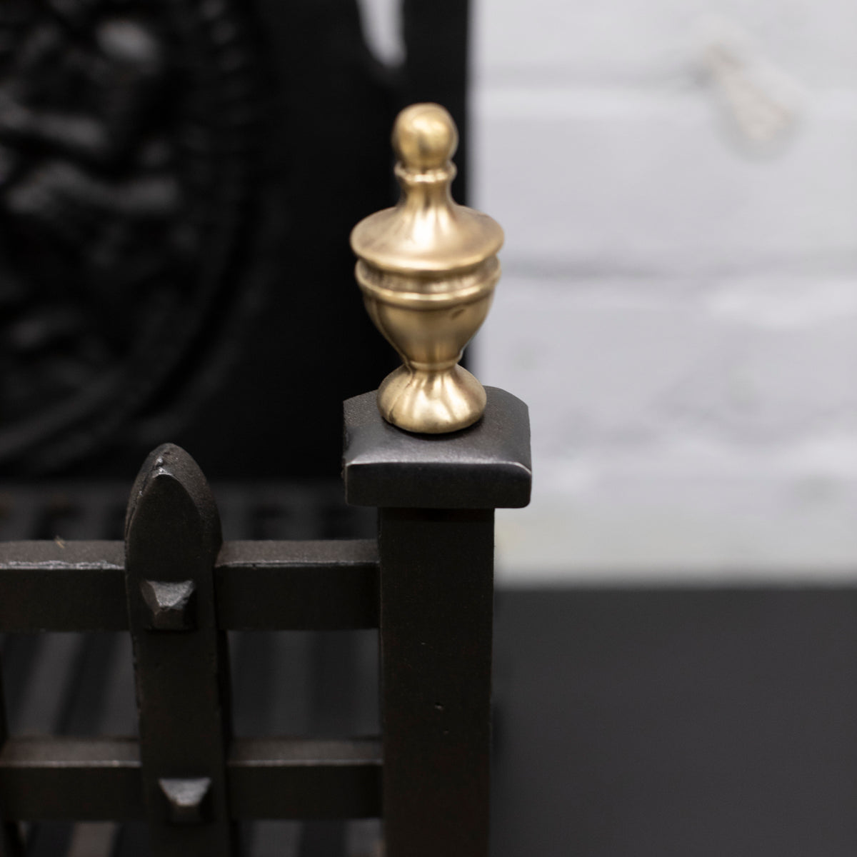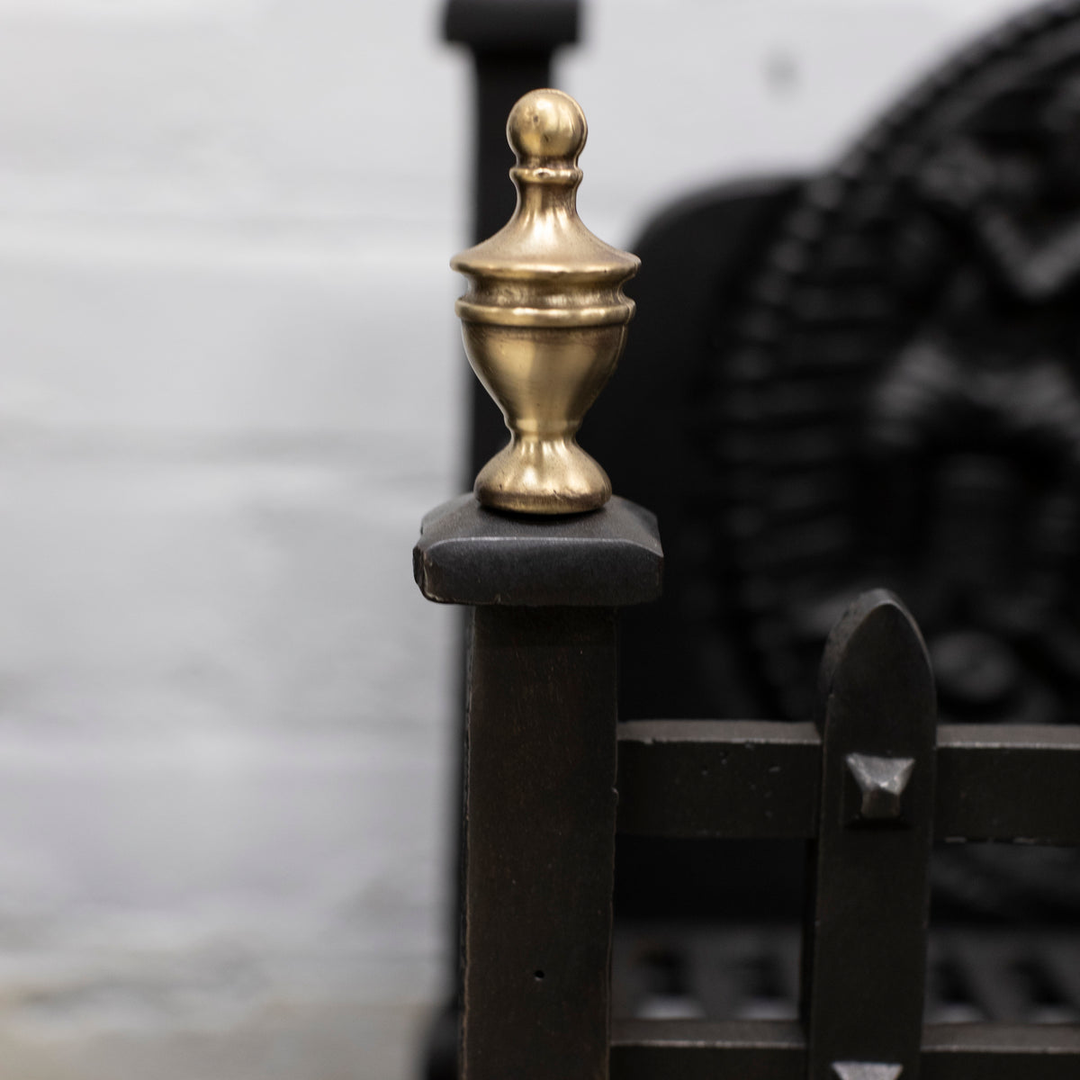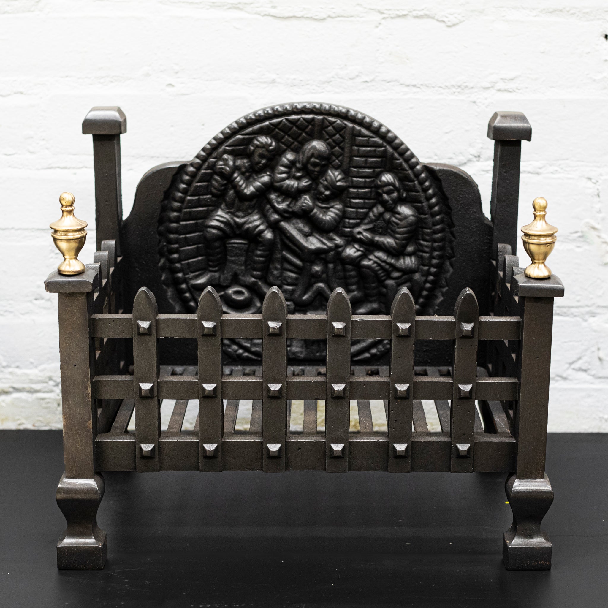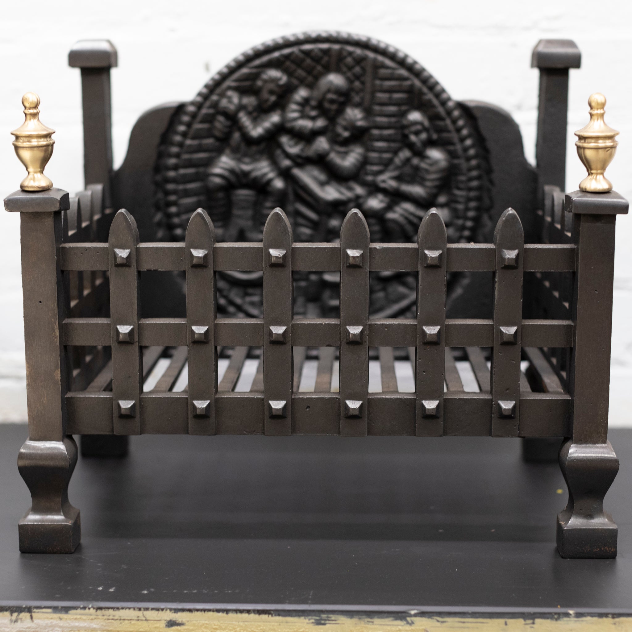 Standing proud on robust legs, the basket is comprised of studded rail posts and decorated with brass finials and an intricate backplate.