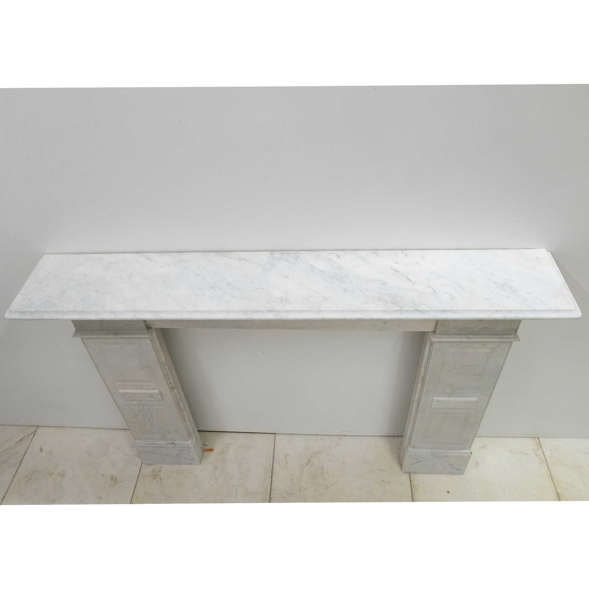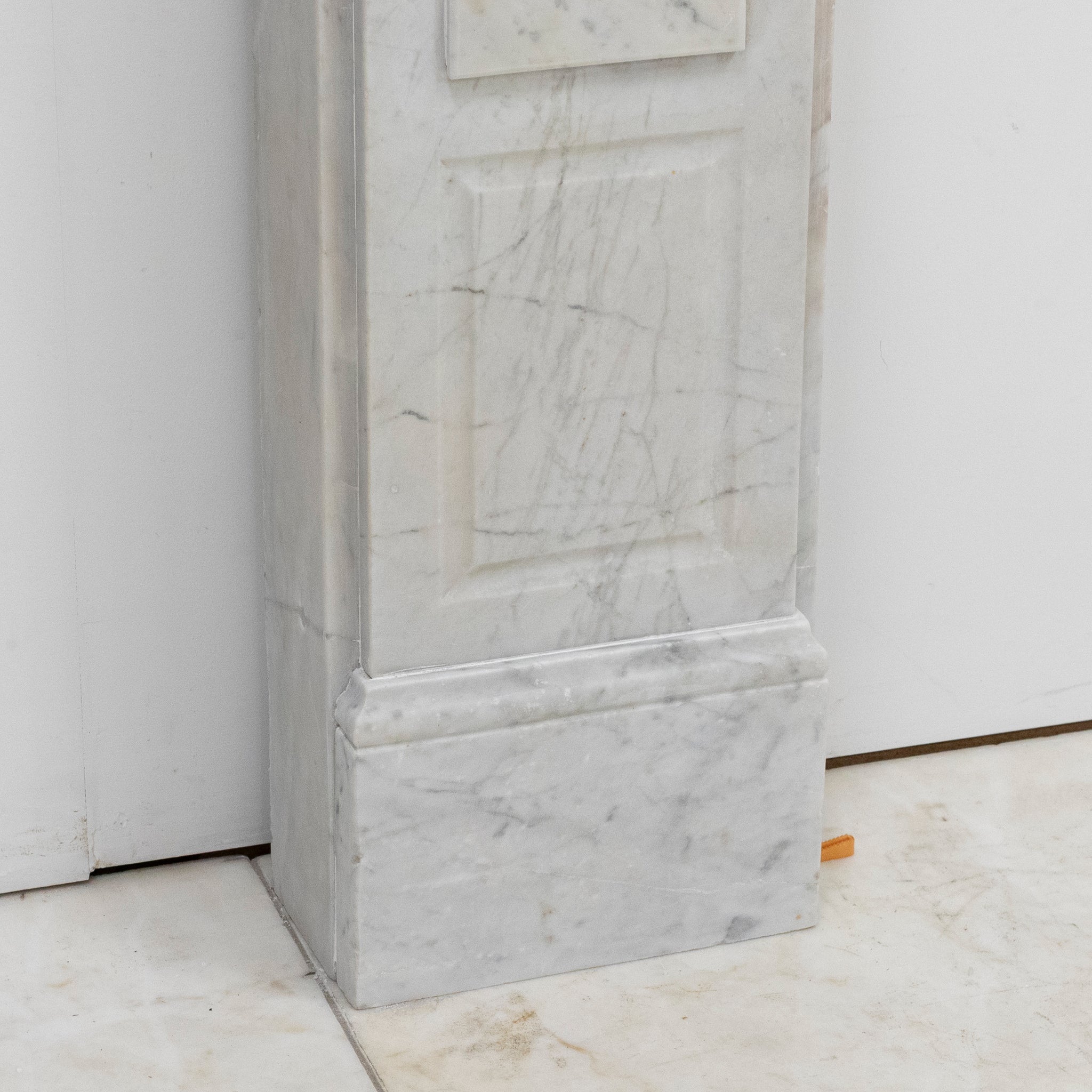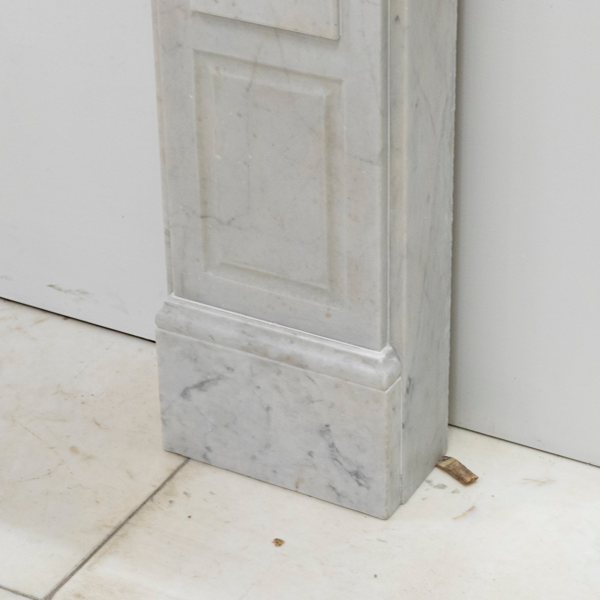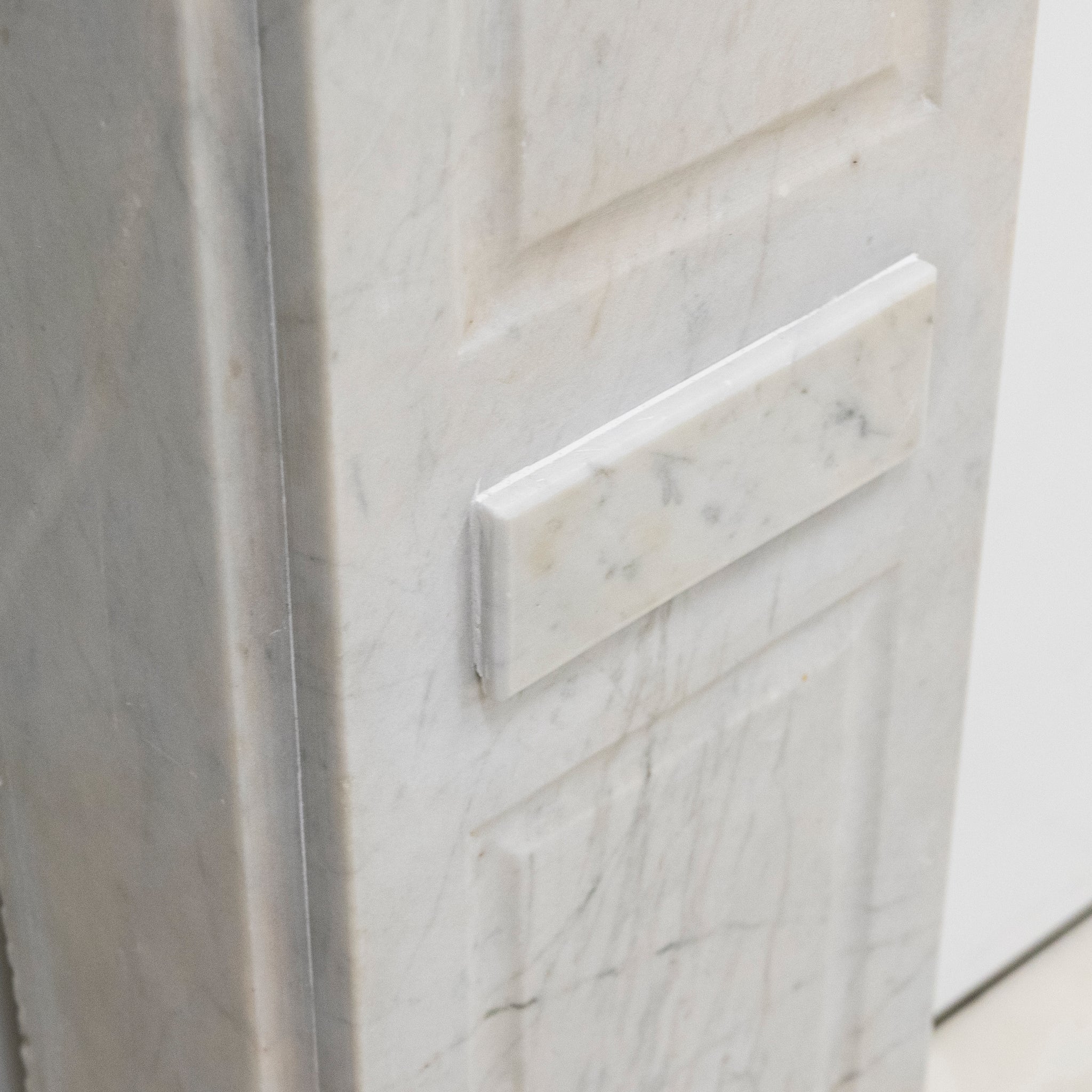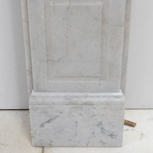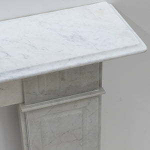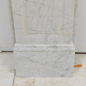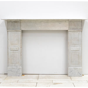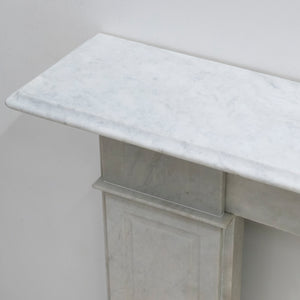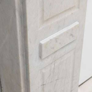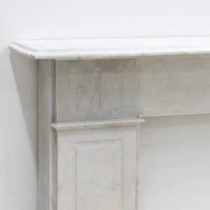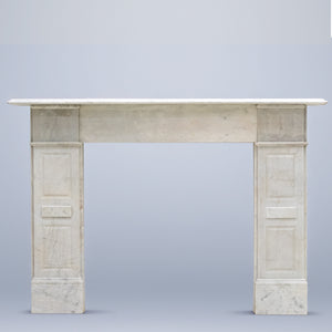 An original antique Edwardian fire surround carved from Carrara marble featuring a plain and a bevelled mantel shelf. Thumbnail details are seen on the endblocks. The jambs are articulated with fielded panels and squared plinth blocks, emphasising balance and proportion over ornament. The overall design reflects early 19th-century classical restraint and geometric clarity.