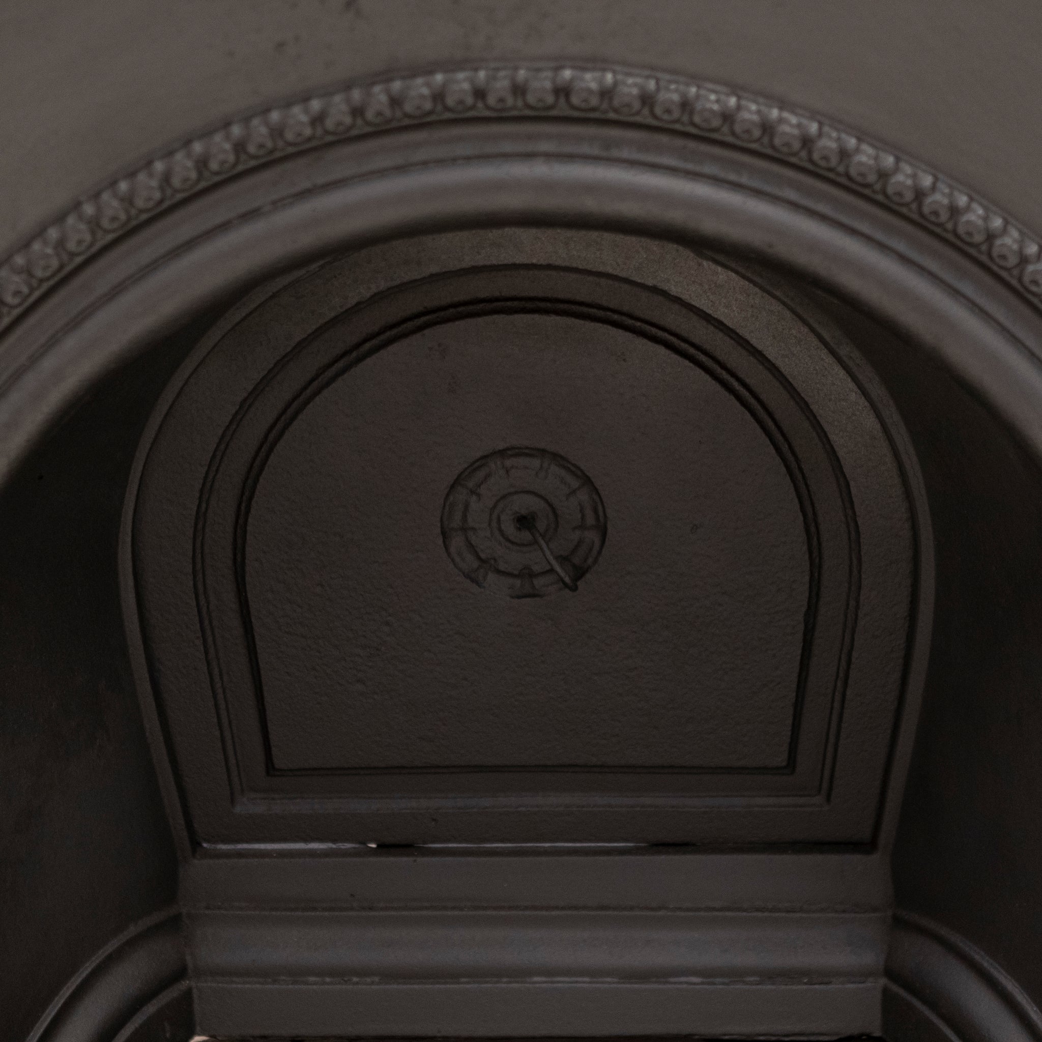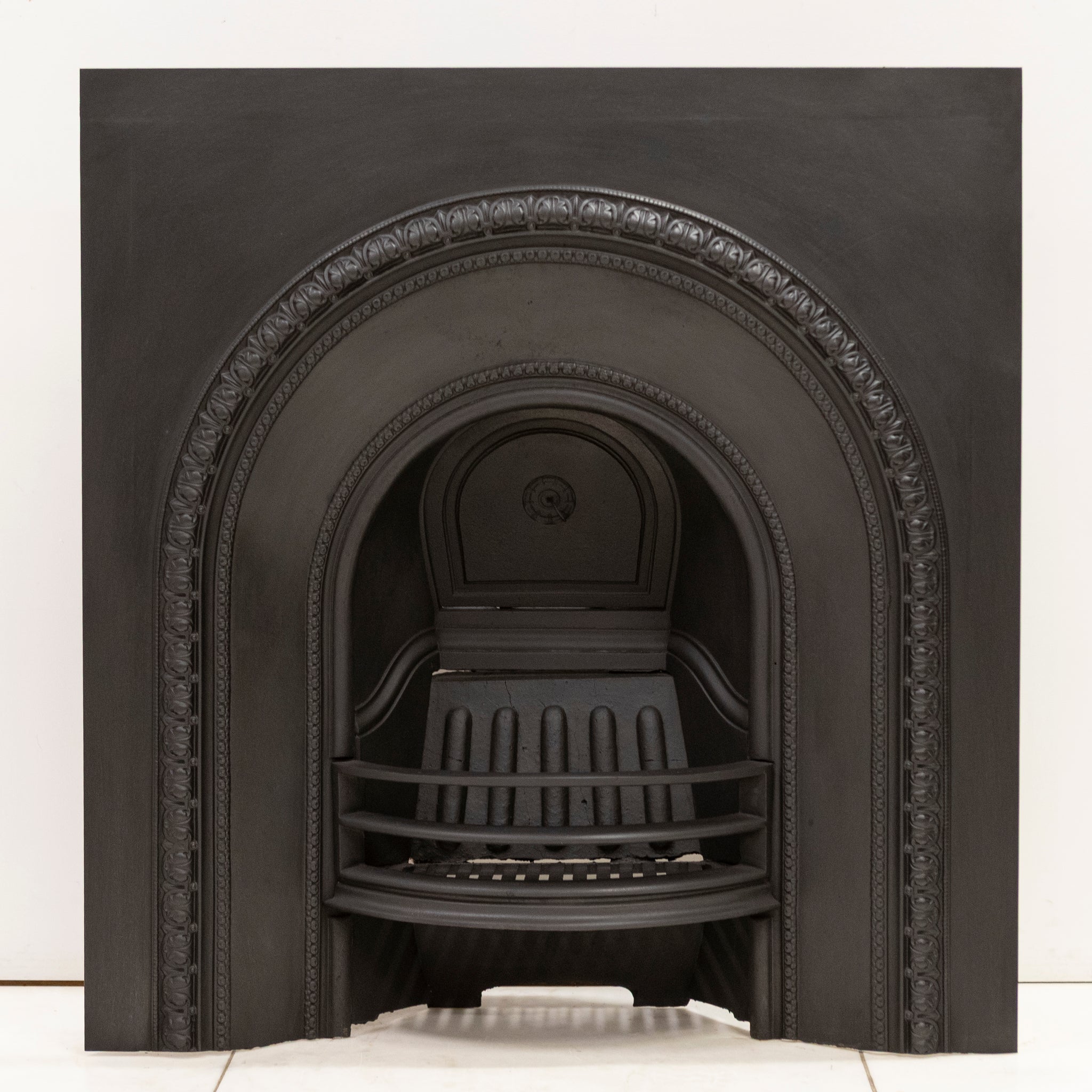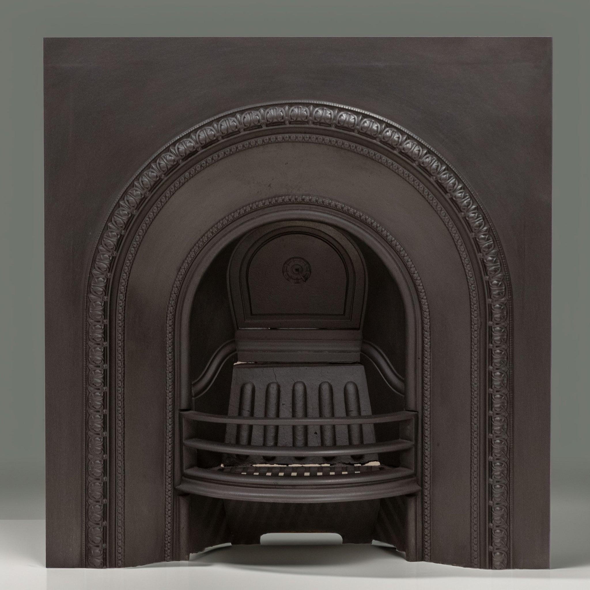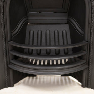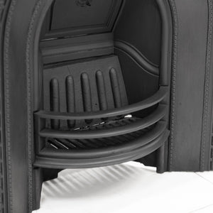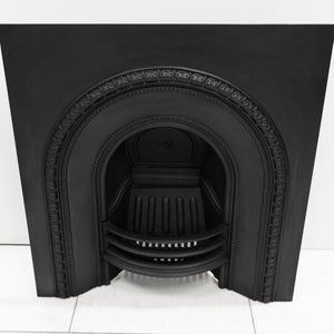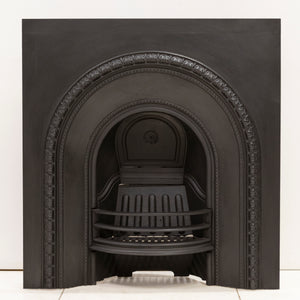 Antique Cast Iron Arched Fireplace Insert with an arched opening and ornate border.