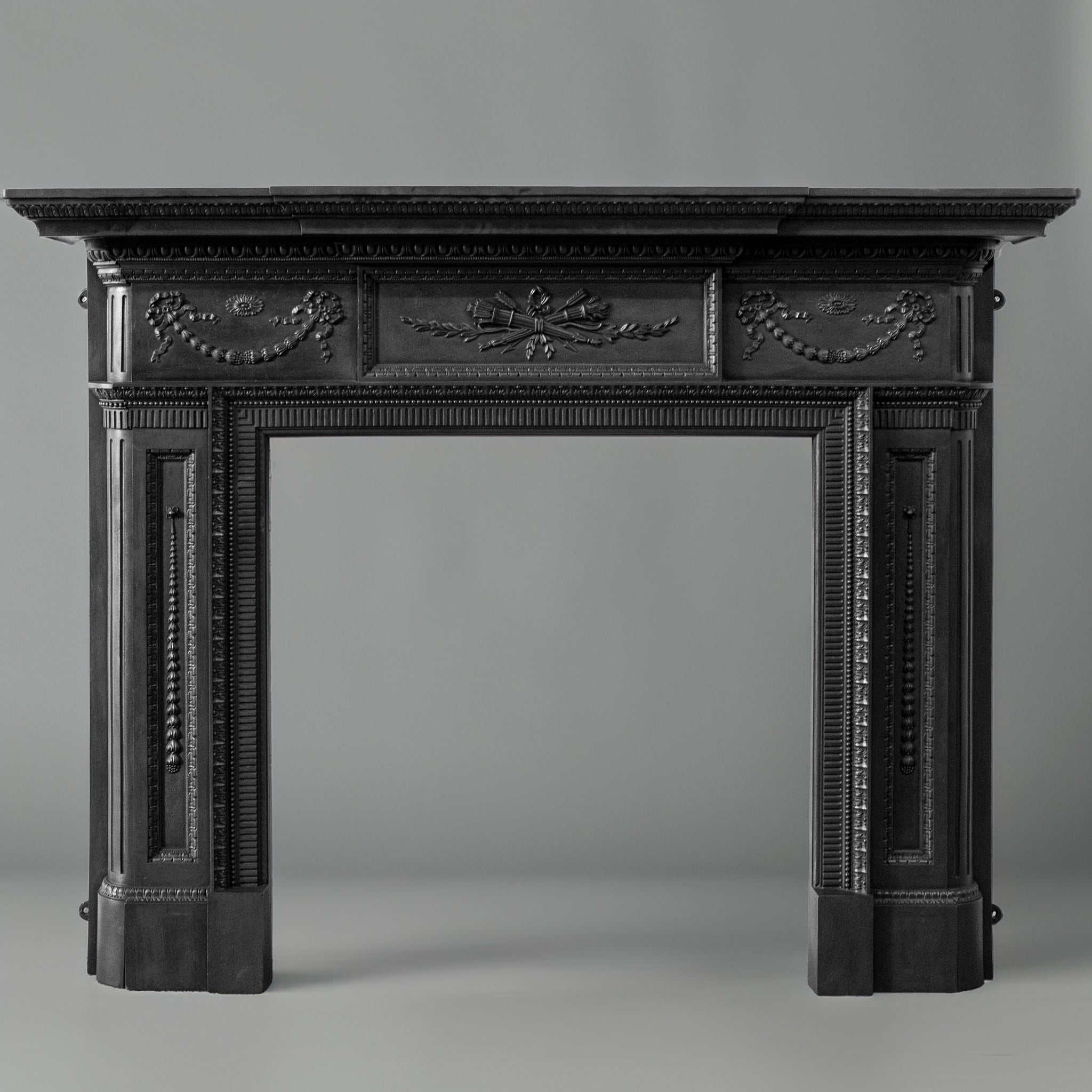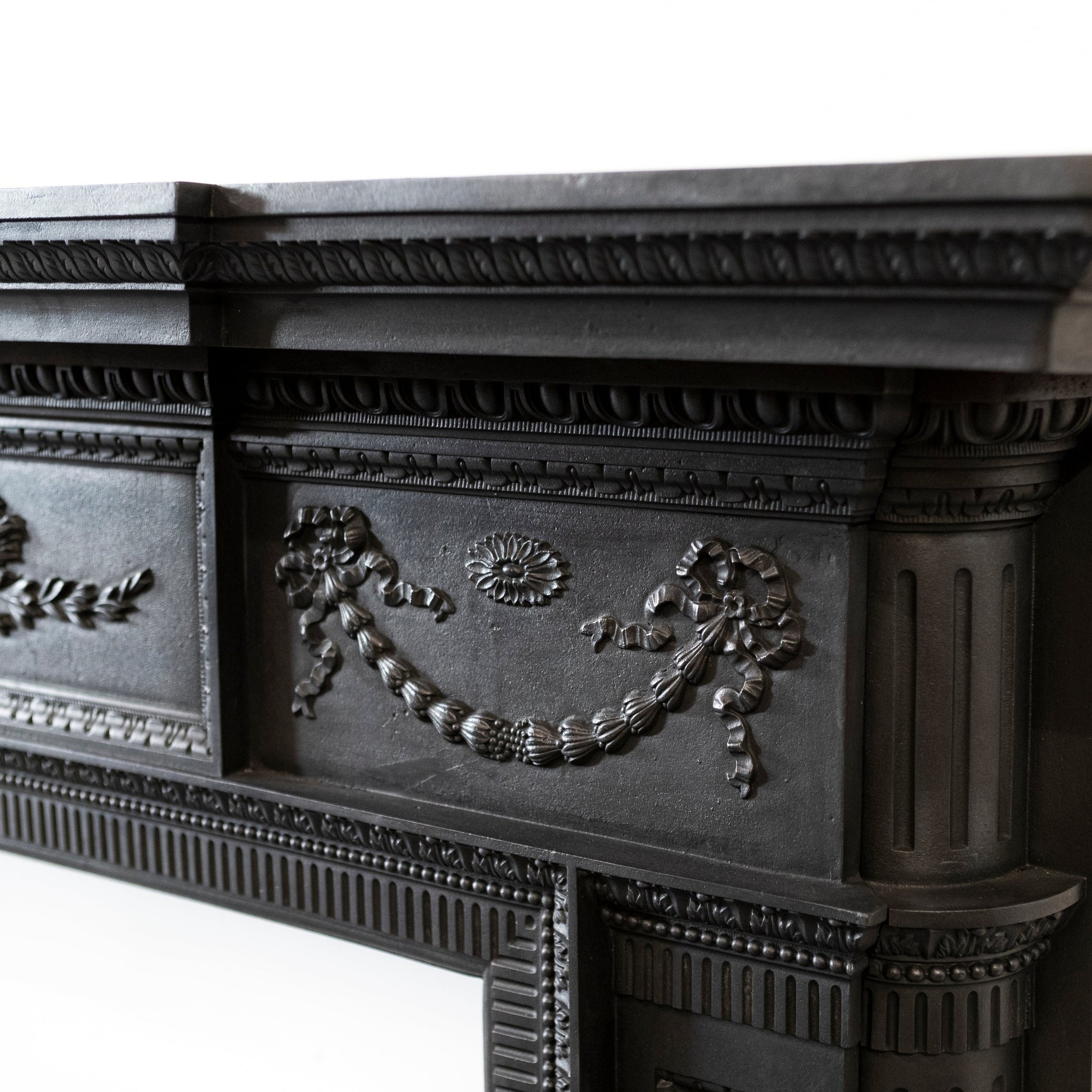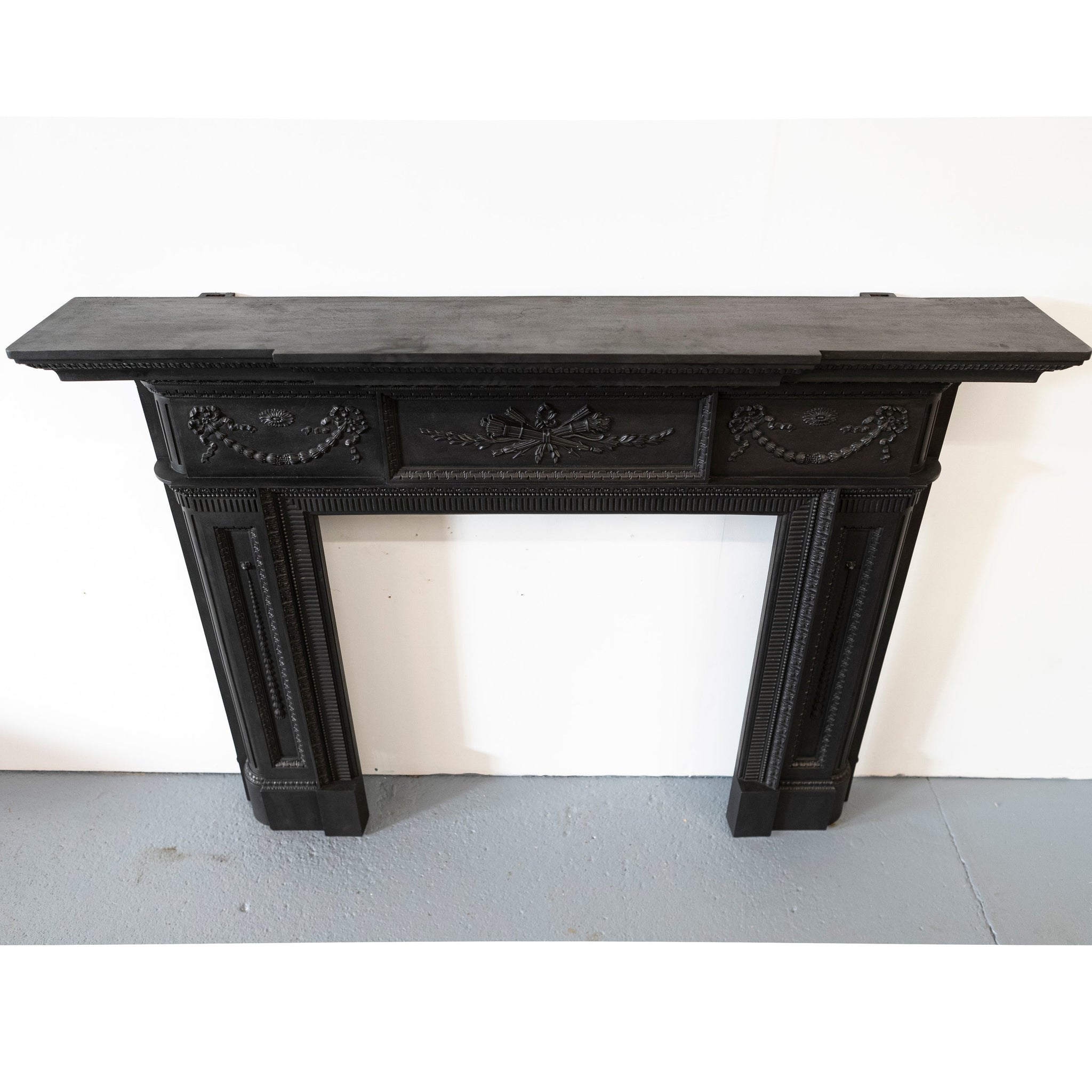 The frieze is arranged with a central classical relief panel, flanked by symmetrical swags and rosettes, all crisply cast with strong depth and definition. The detailing remains sharp throughout, indicative of high-quality period foundry work. A pronounced upper cornice forms a substantial mantel shelf.