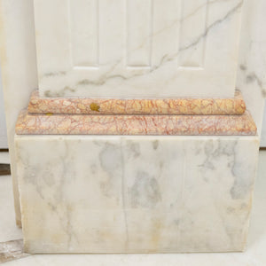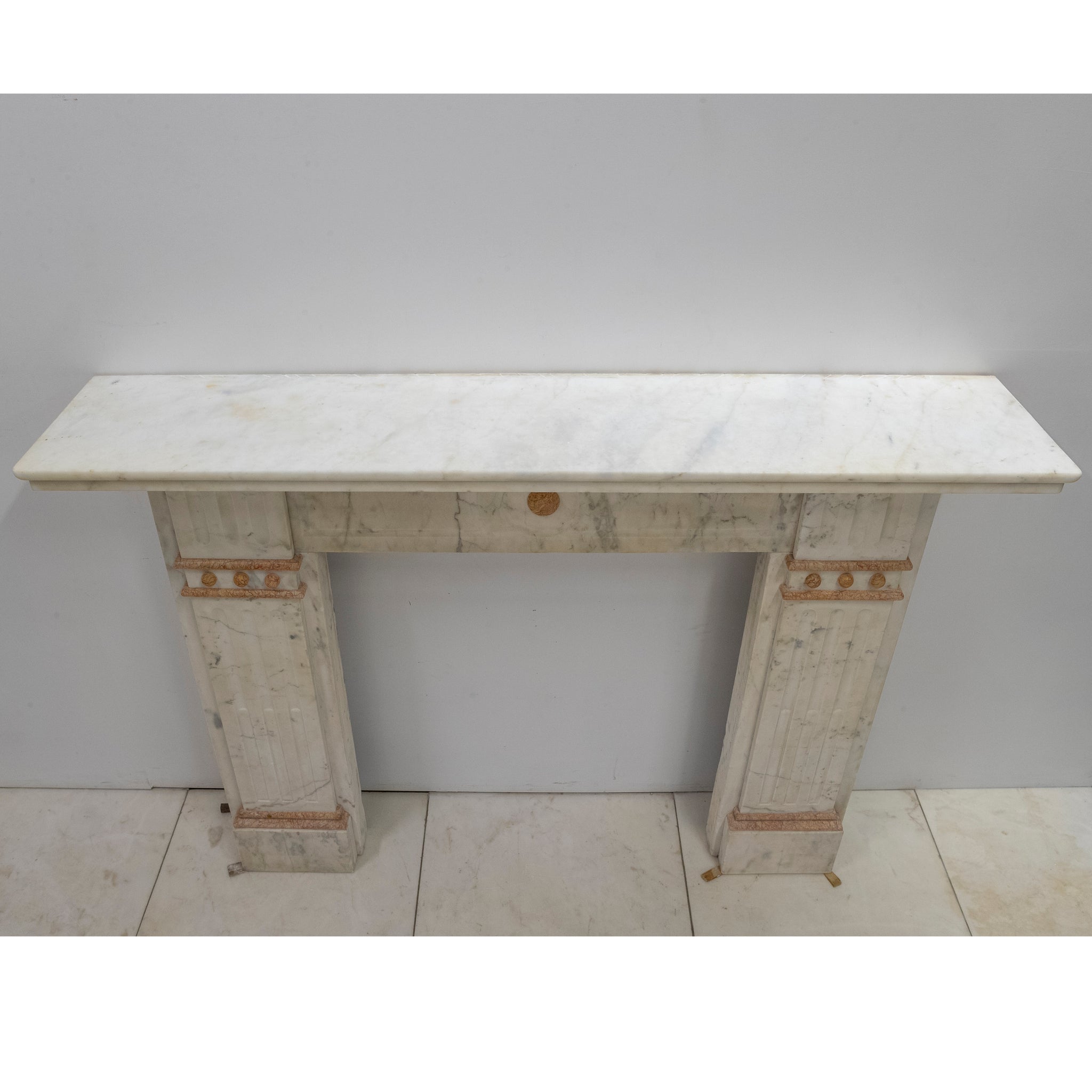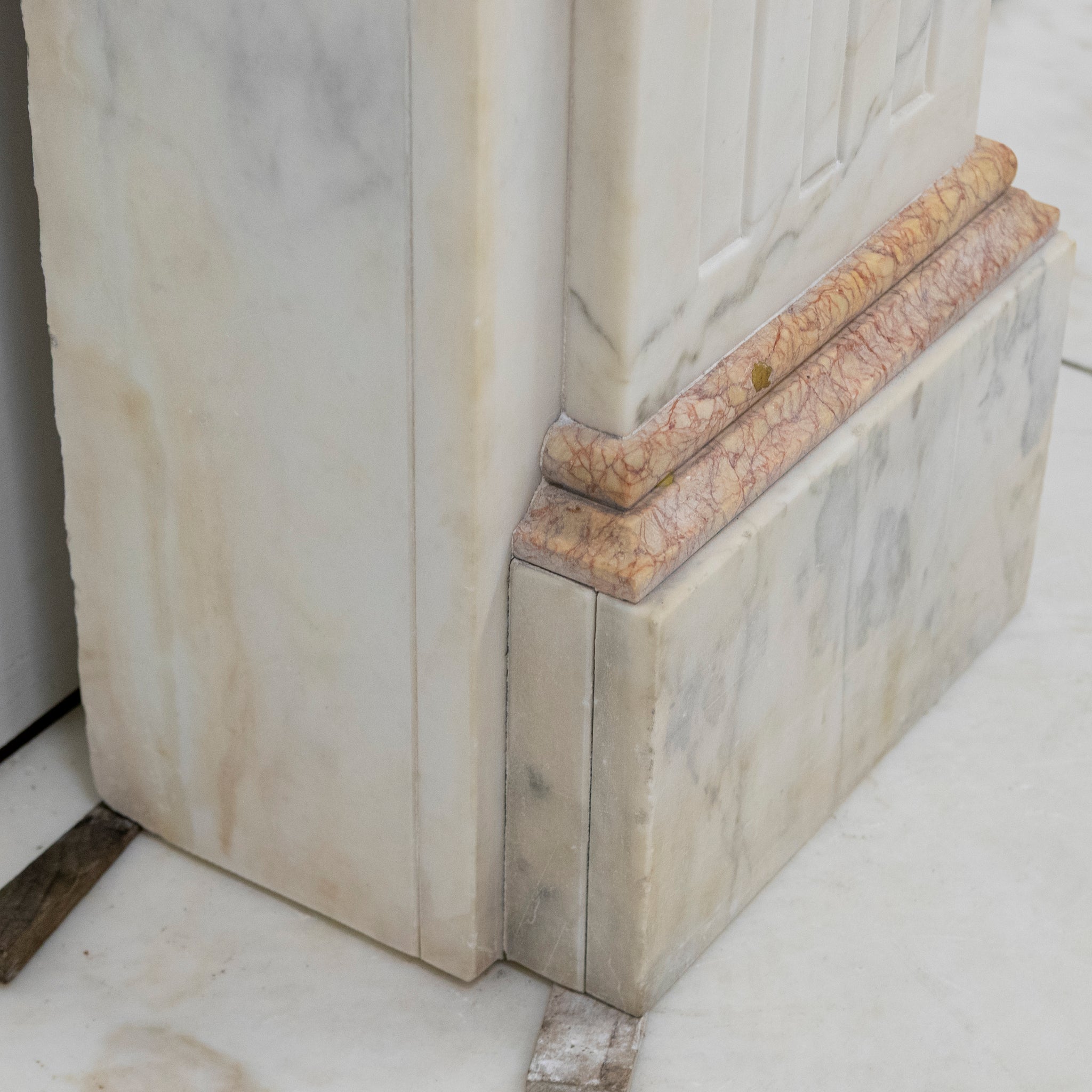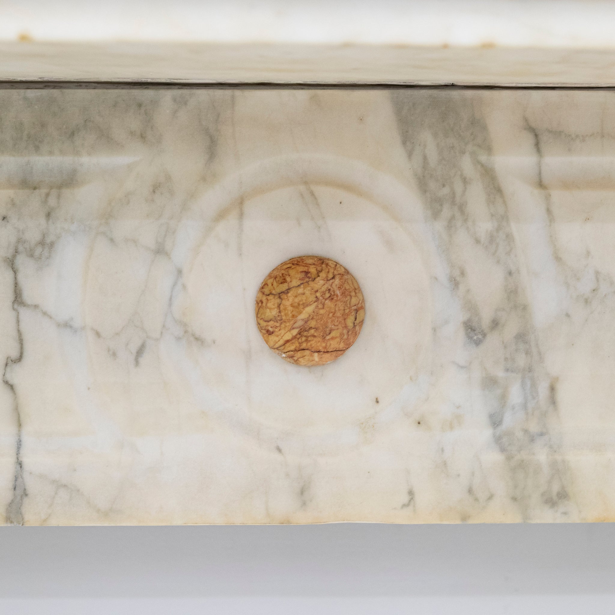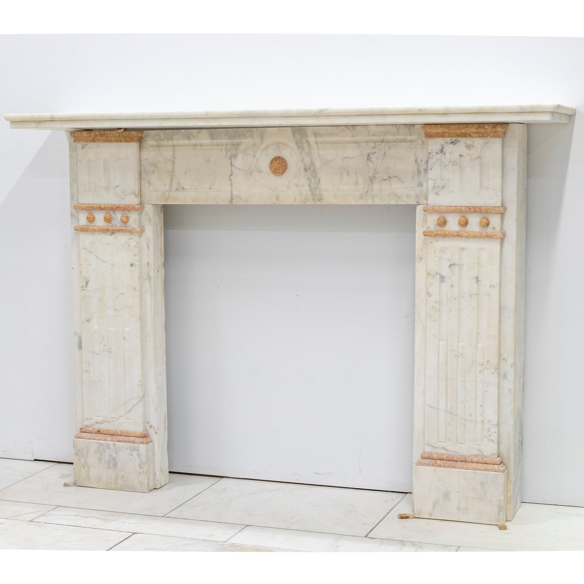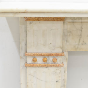 A refined Edwardian marble fireplace surround, dating to the early 20th century, carved from fine Carrara marble and enriched with Giallo odi Siena marble.