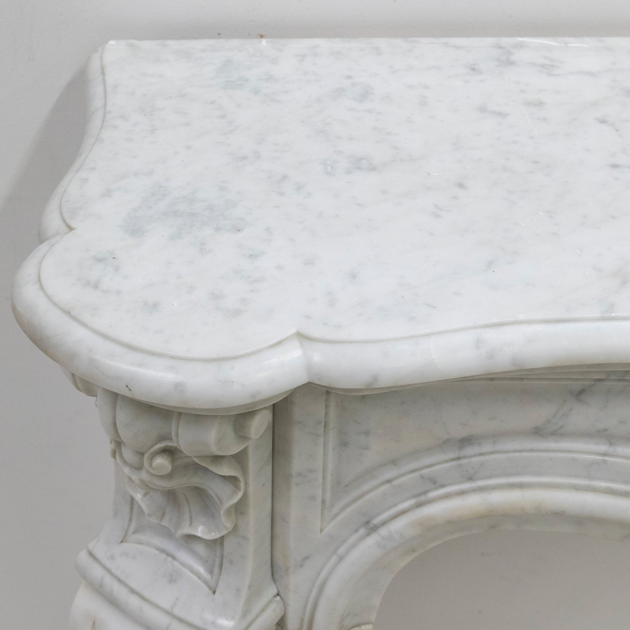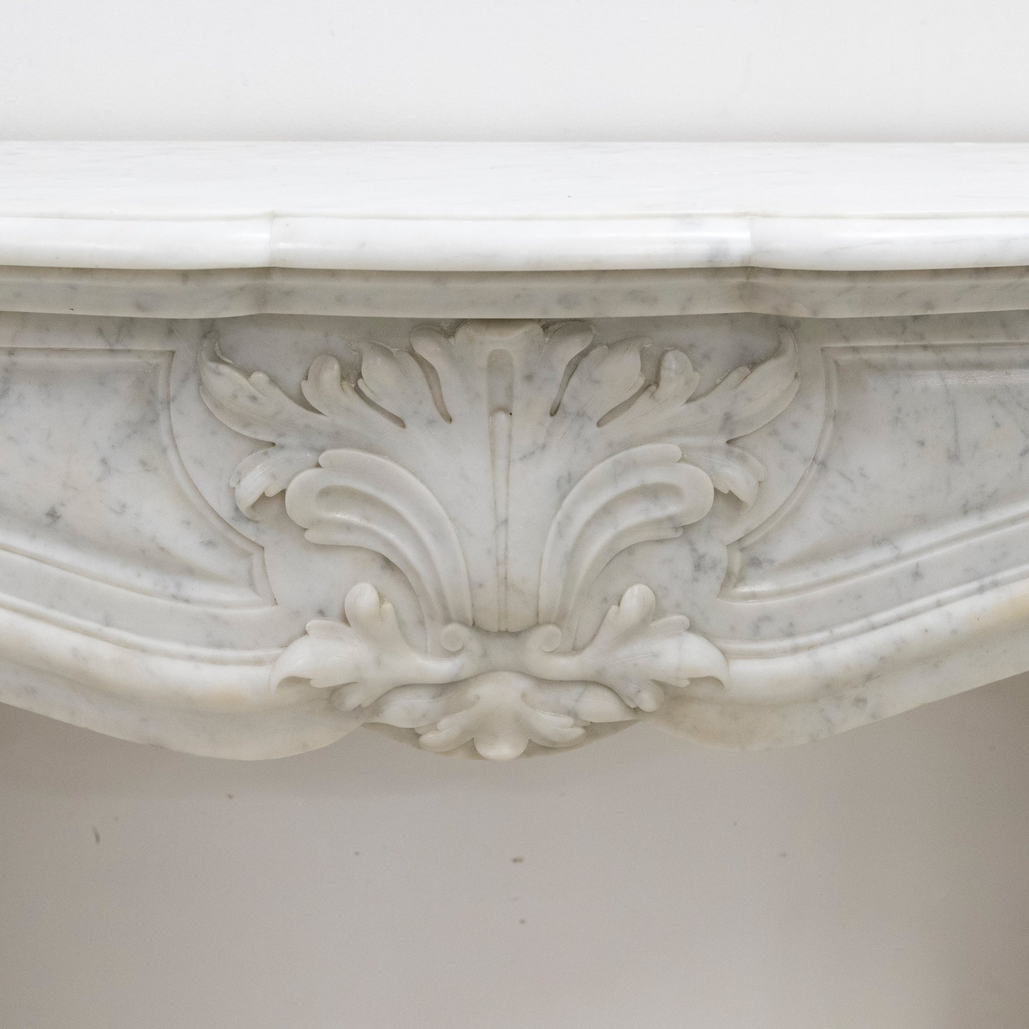 The softly serpentine frieze is centred by a finely modelled acanthus cartouche, framed by delicate scrollwork and flowing curves. The jambs are crisply detailed with restrained foliate panels, giving the piece balanced form.