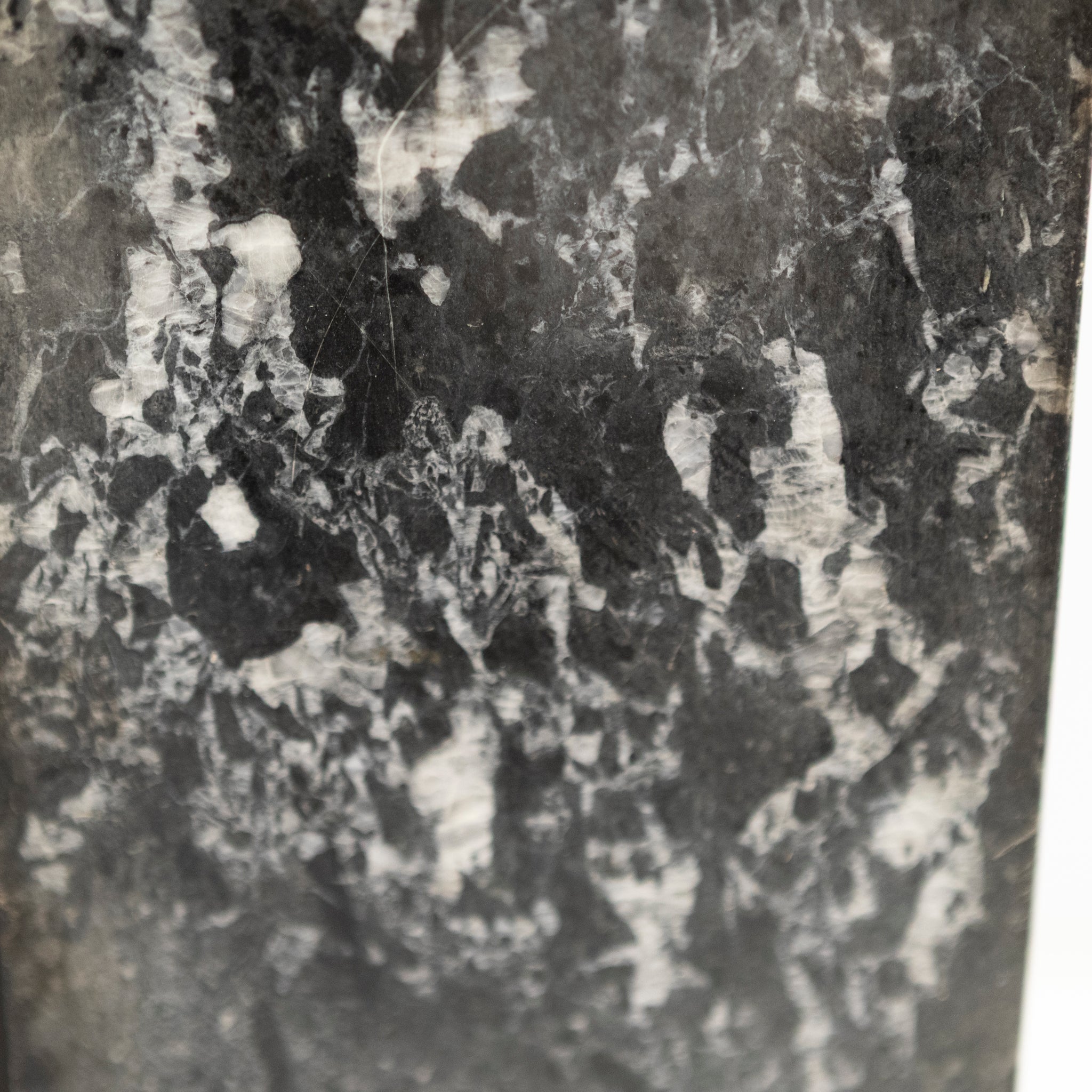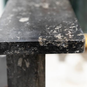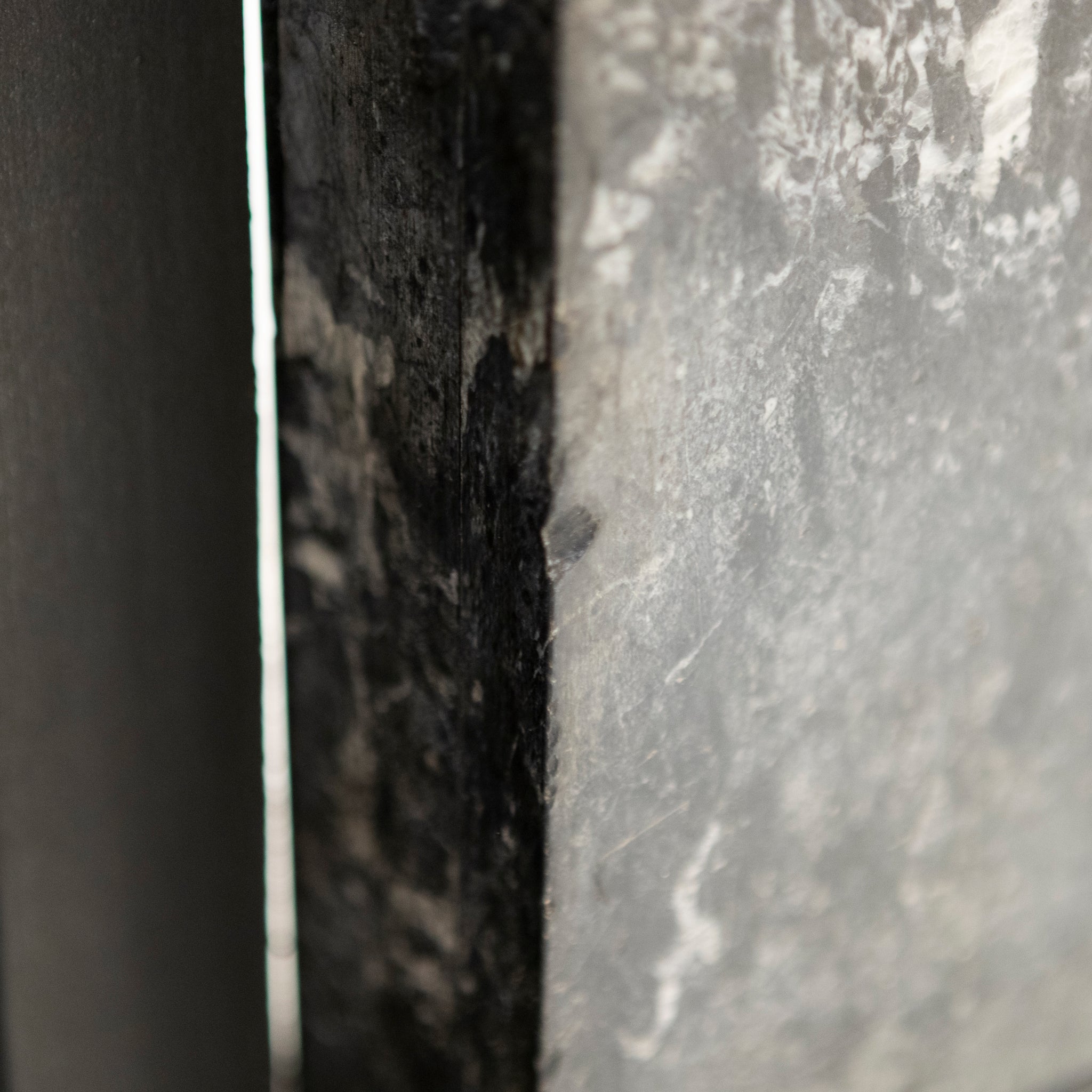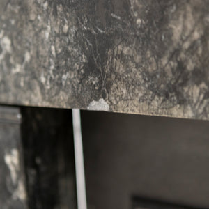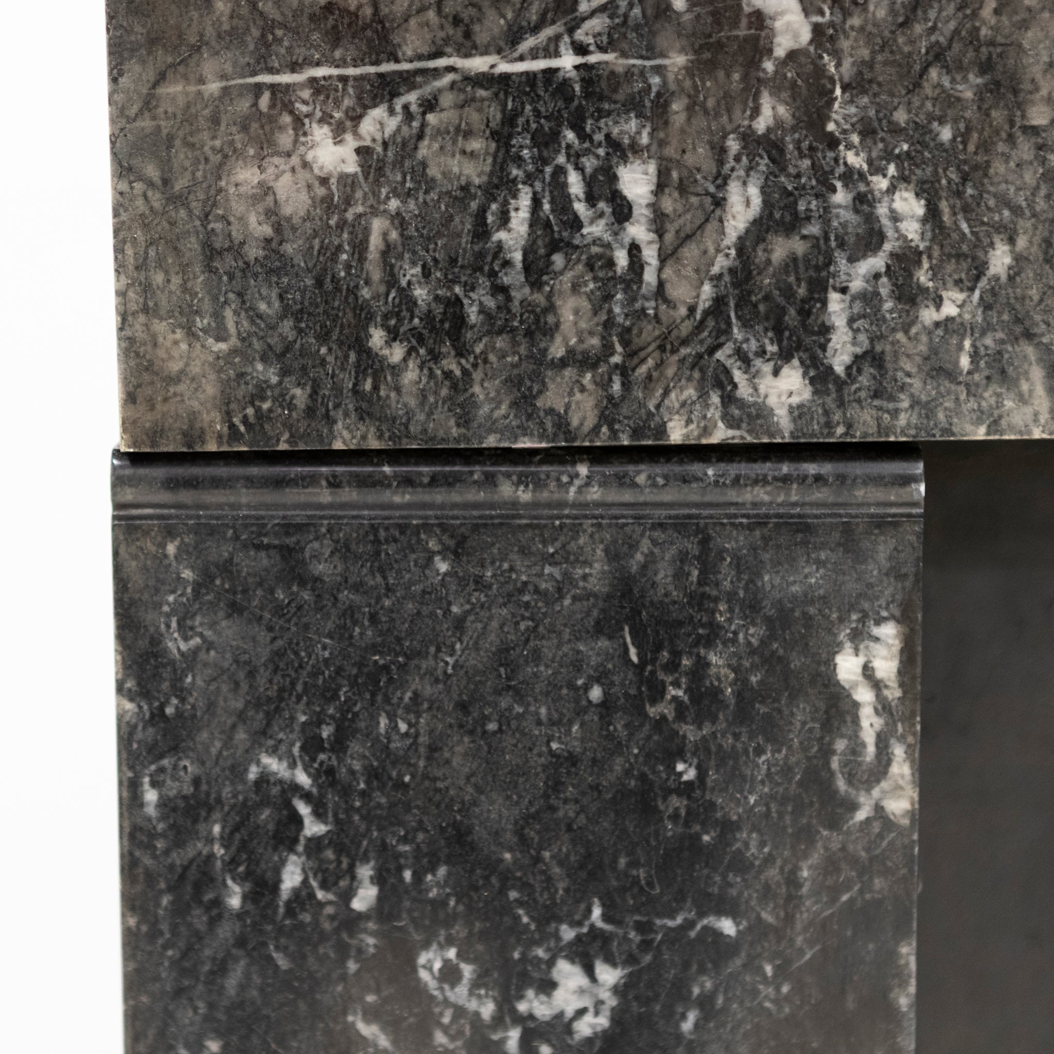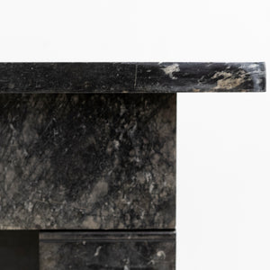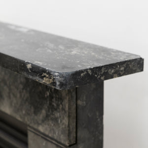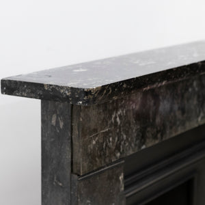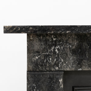 The surround is architectural in character, with a broad mantel shelf above simple, confident jamb. A deep charcoal with soft grey undertones, naturally figured with cloudy fossil inclusions and subtle calcite.