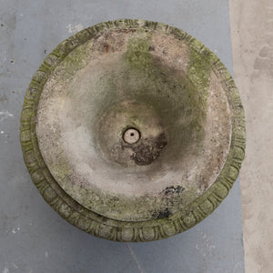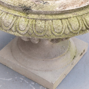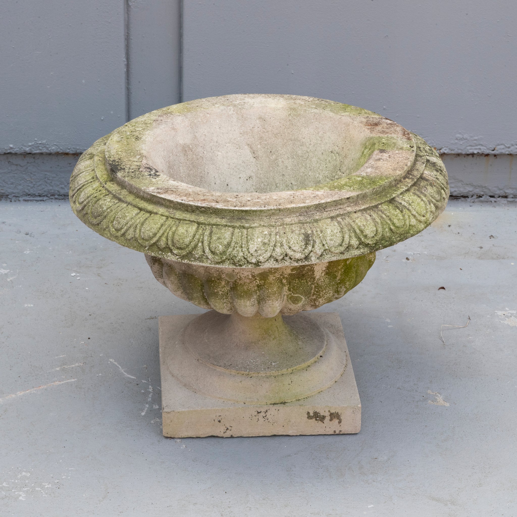 Reclaimed terracotta garden urn planter in a Classical French style, featuring an egg-and-dart rim over a cylindrical, semi-lobed body on square base.