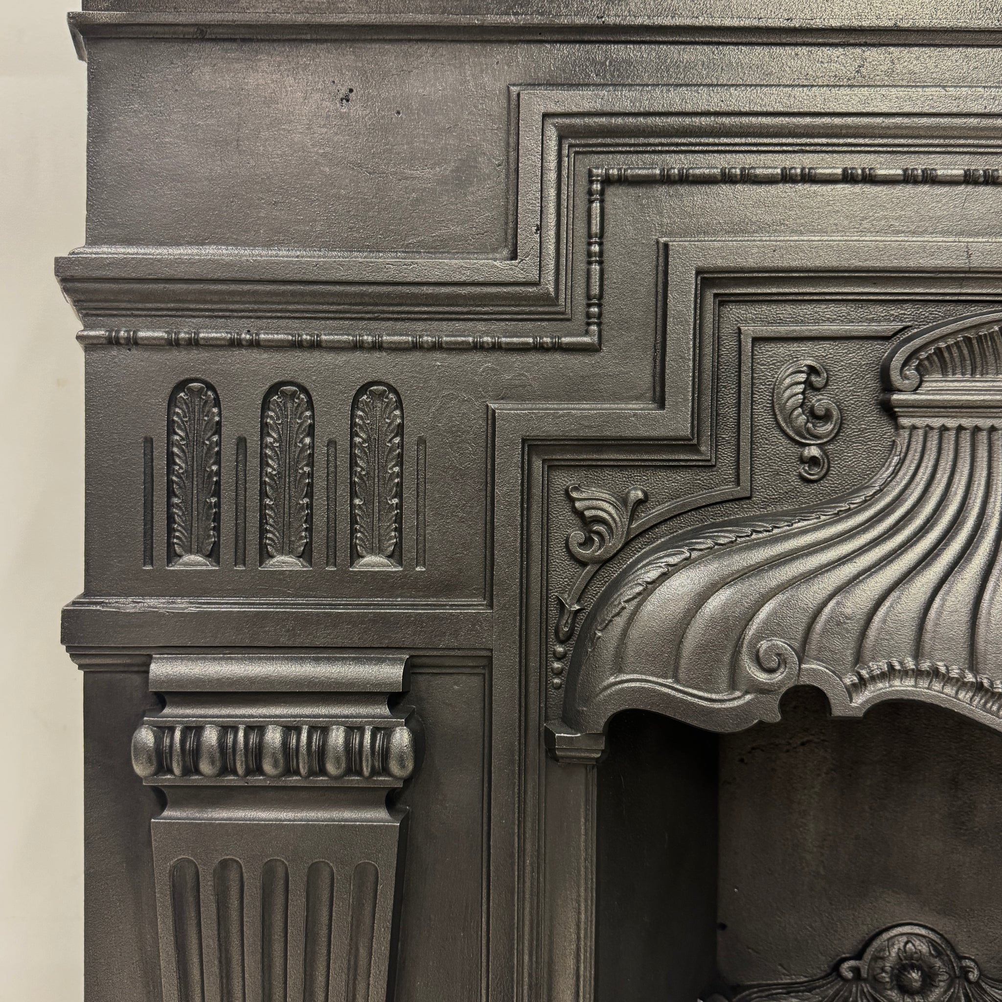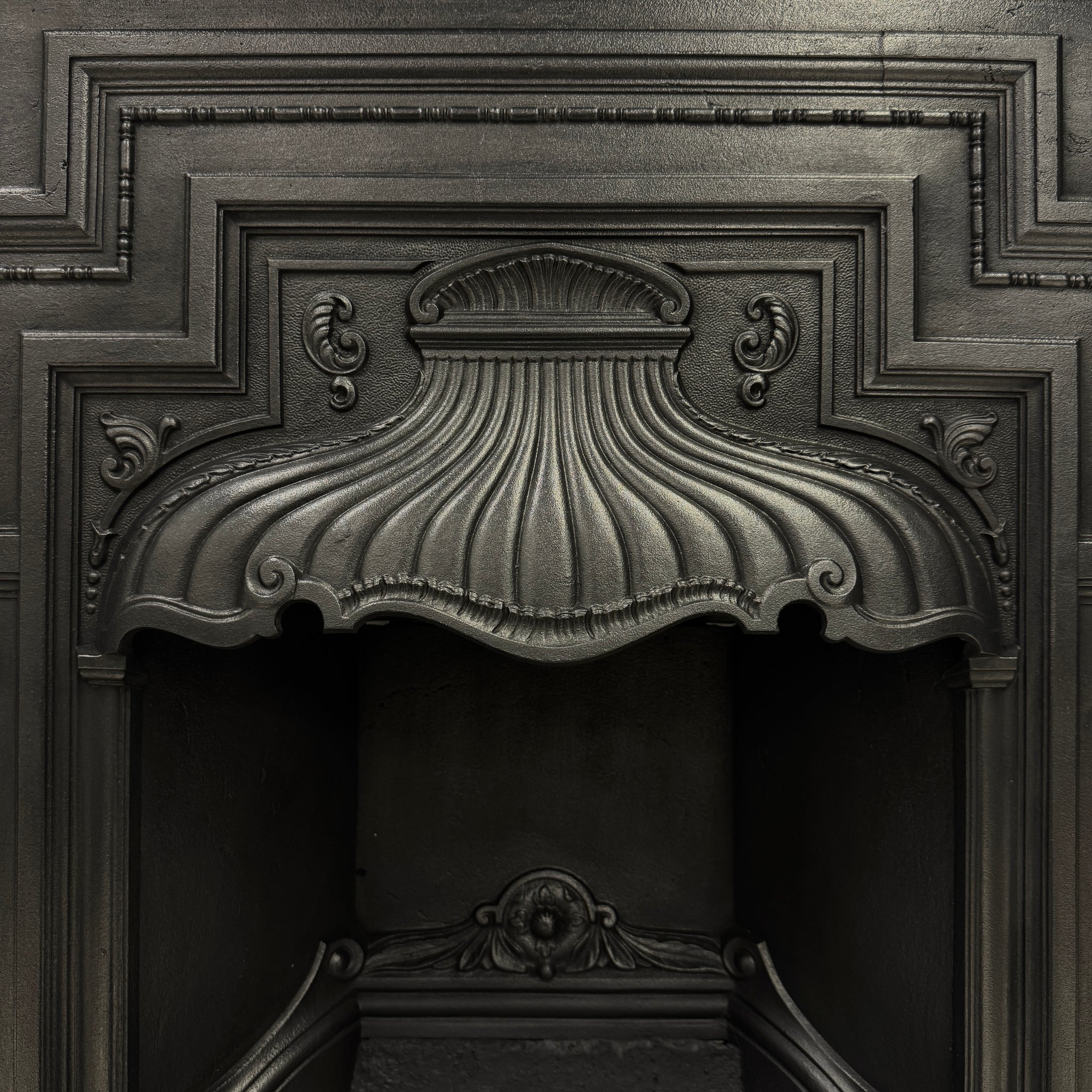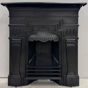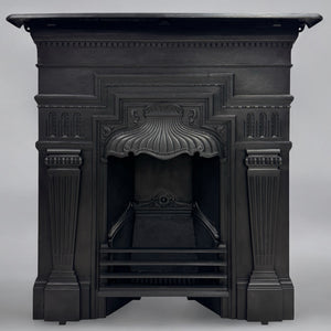 A beautiful Victorian combination fireplace featuring a finely detailed shell canopy hood, an enduring motif of the late 19th century. The fluted jambs, reeded panels and tiered cornice give the piece a strong neoclassical presence, balanced by the soft curves of the scalloped canopy.