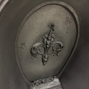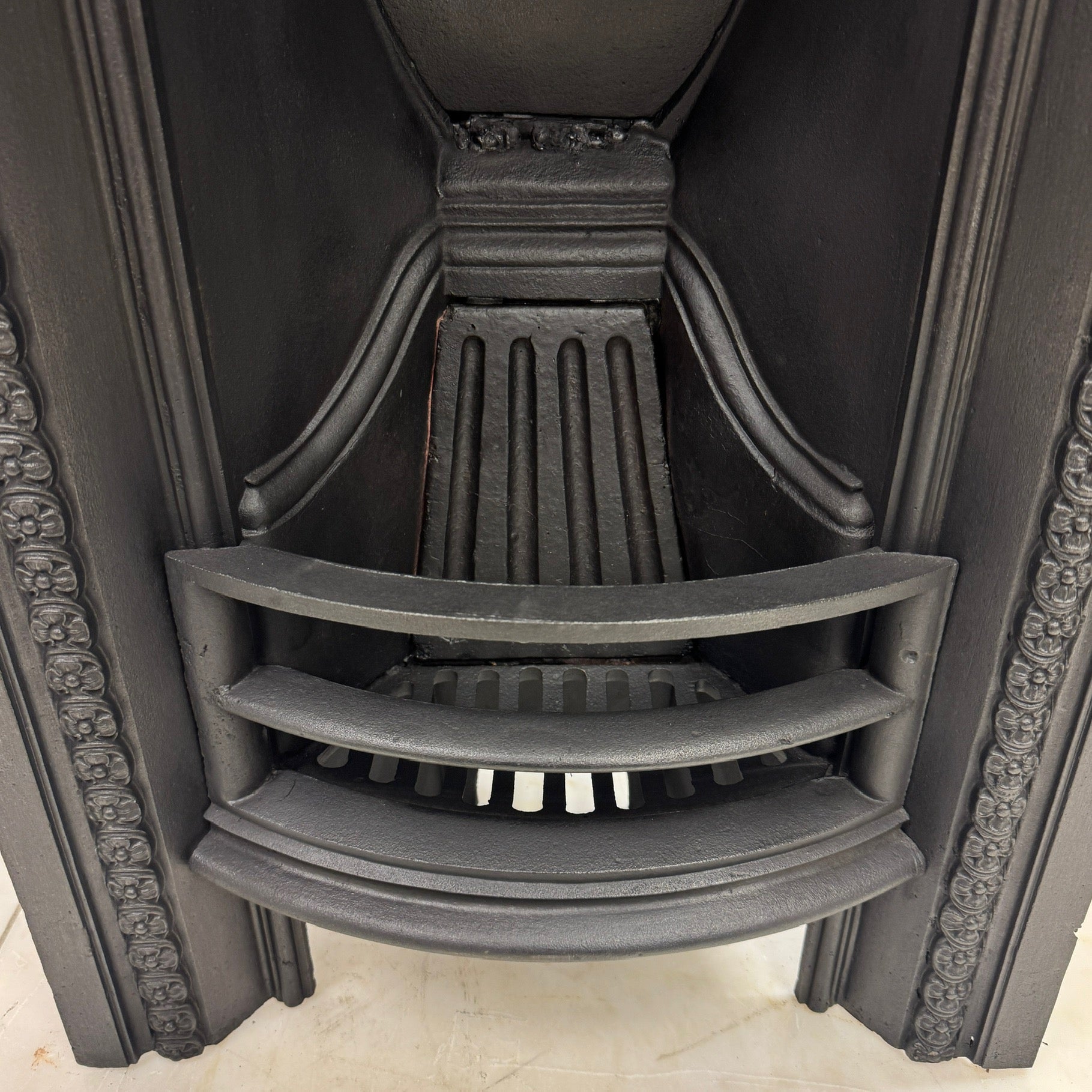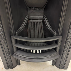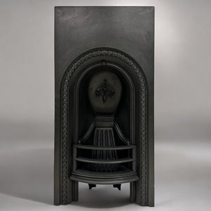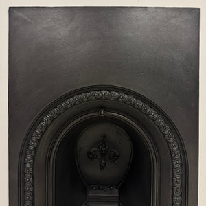 A Victorian arched cast iron fireplace insert. It features a detailed floral bead border and a Fleur-de-Lis motif on the back plate - a common decorative symbol in 19th-century British design. The curved bars and deep arch create a classic period look, making it perfect for a traditional bedroom.