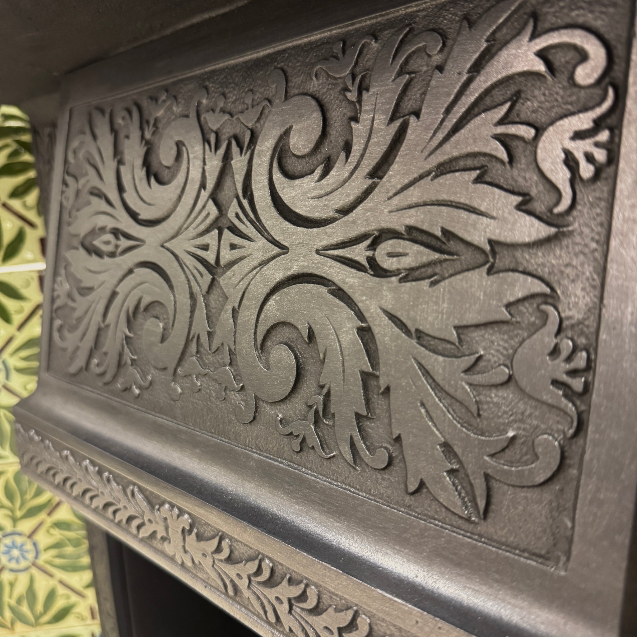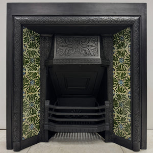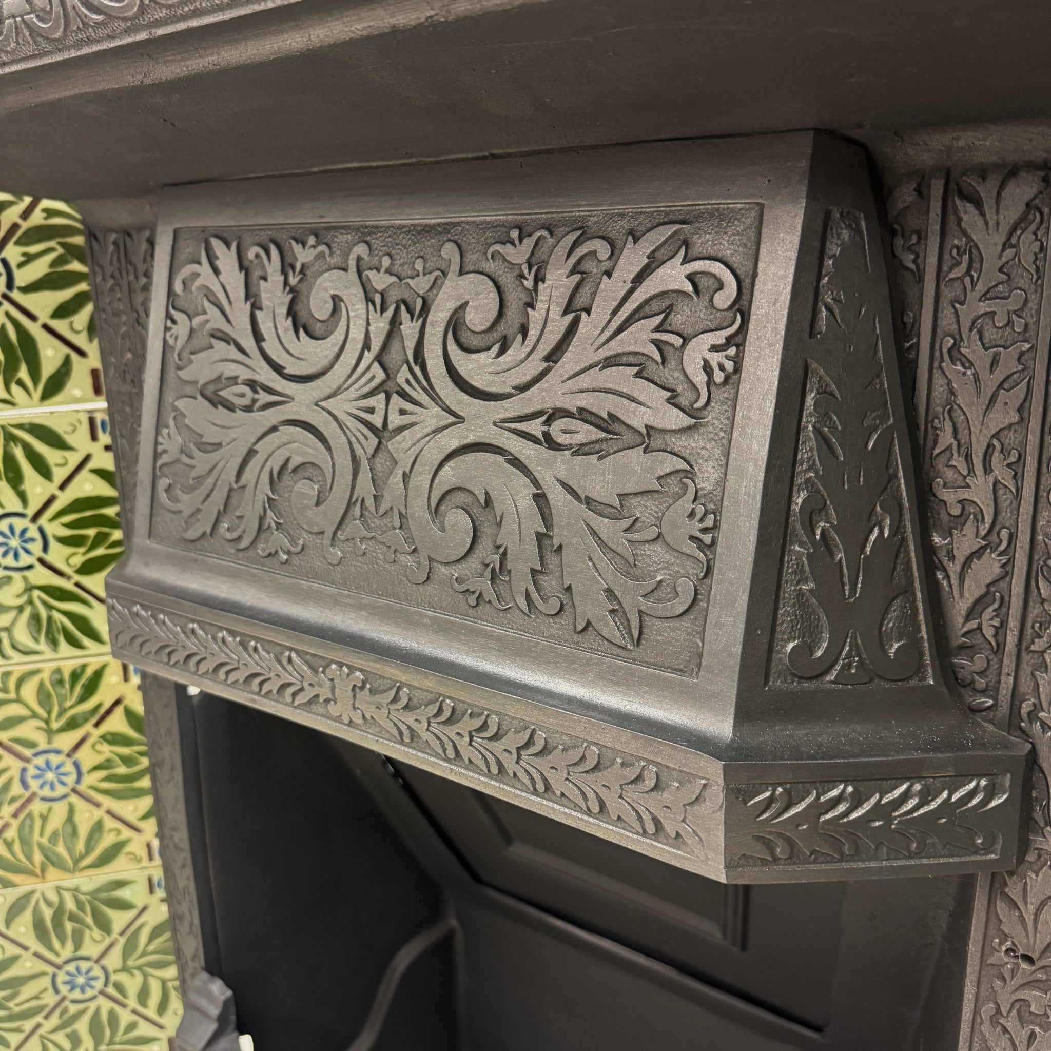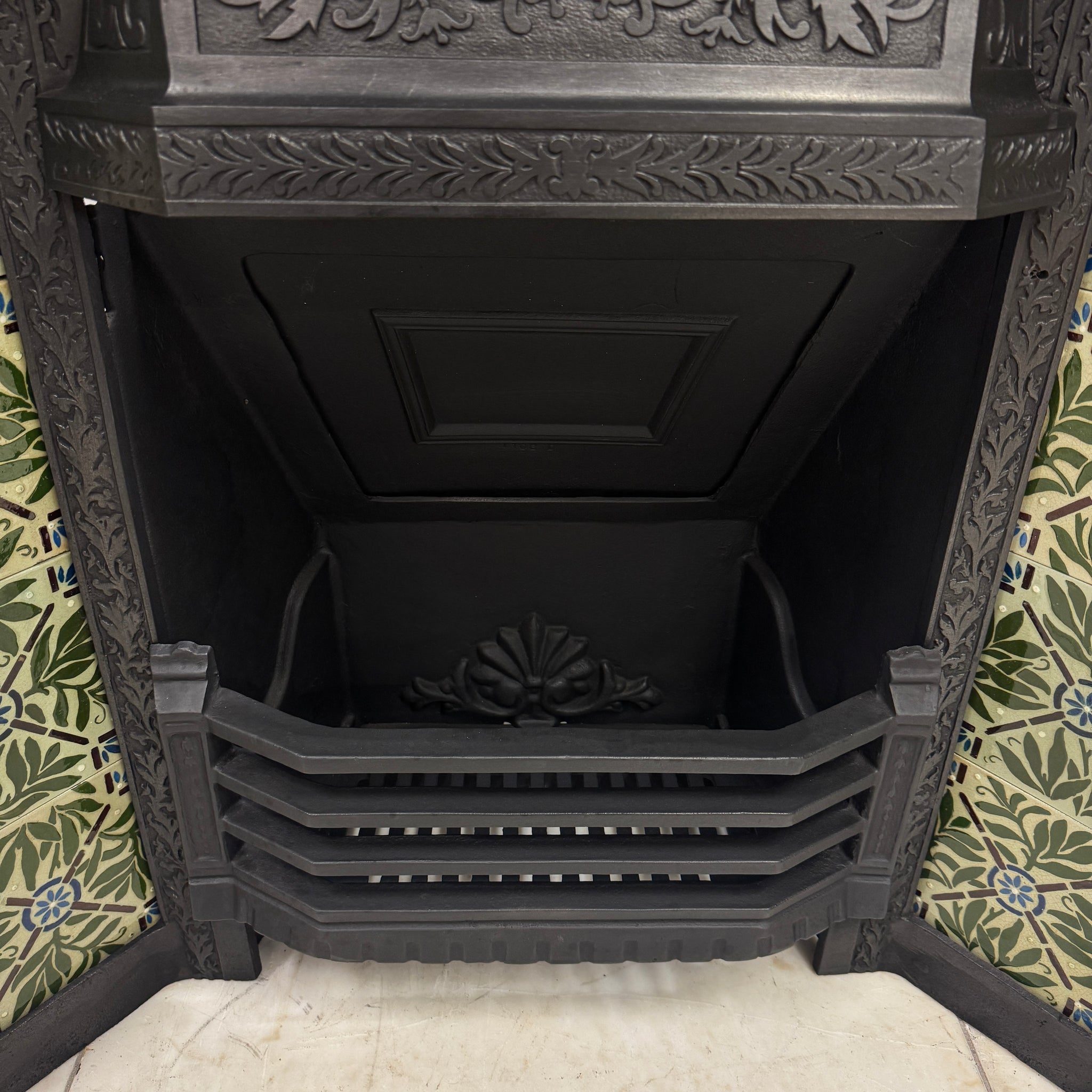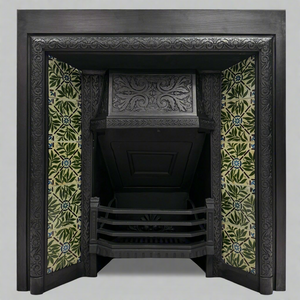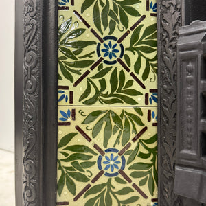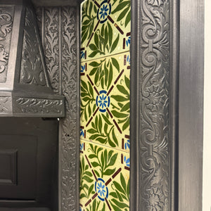 A beautifully restored Victorian cast iron insert, featuring crisp foliate detailing throughout the arch and canopy. The craftsmanship is richly enhanced by a stunning set of original Josiah Wedgwood tiles, displaying a classic Arts & Crafts botanical motif in deep greens and blues.
