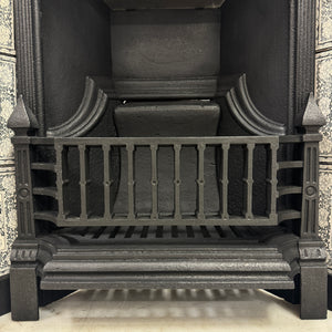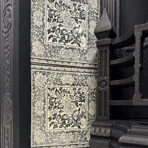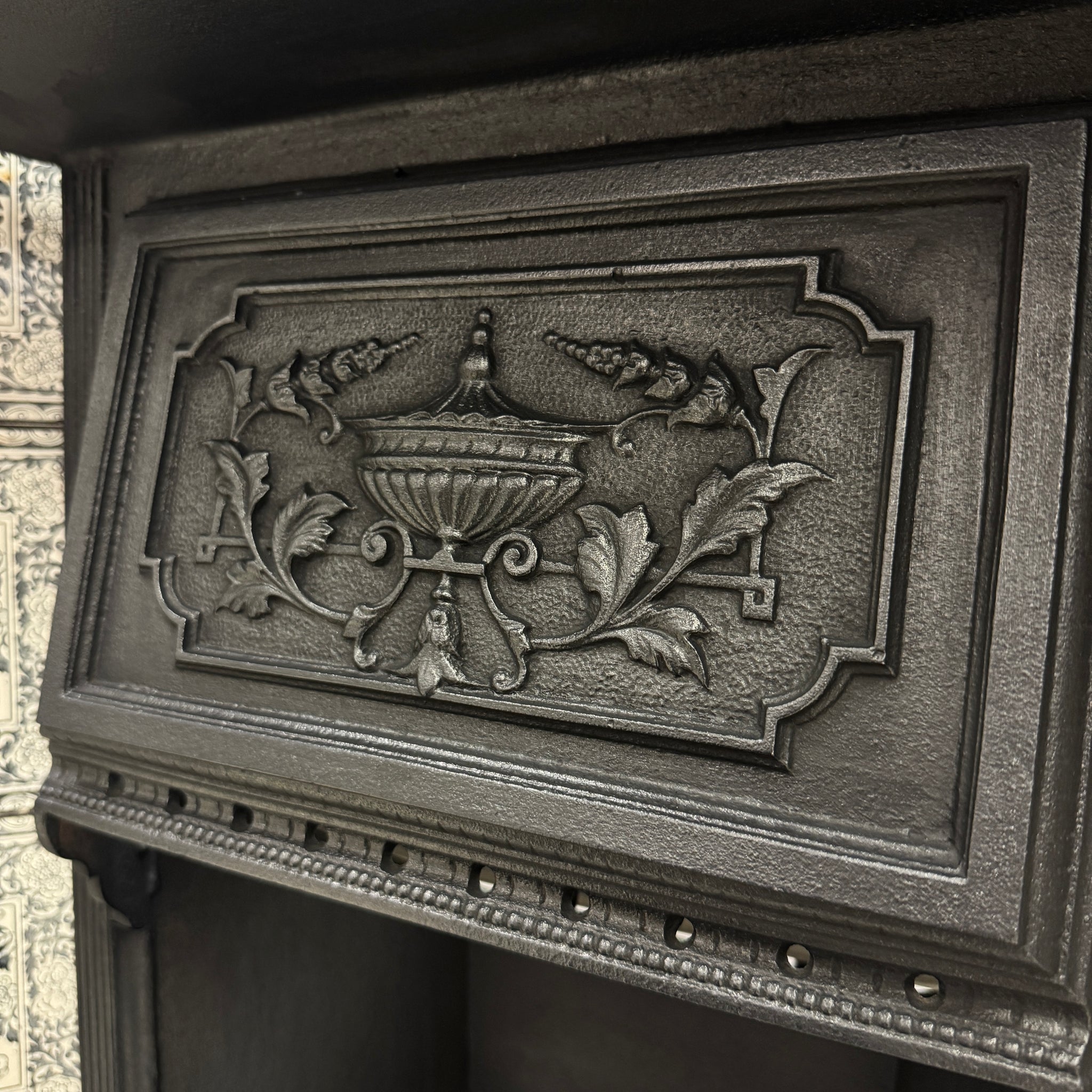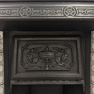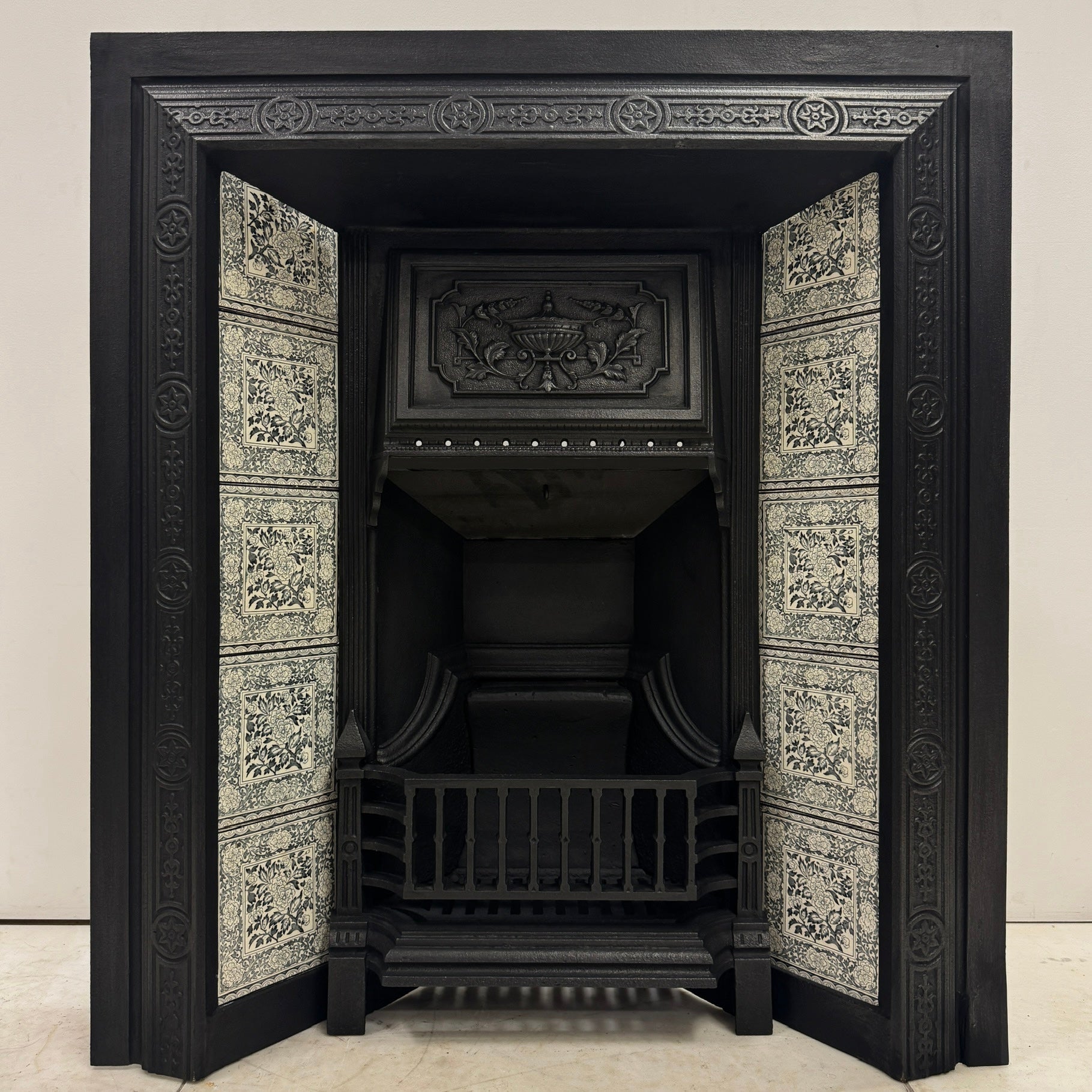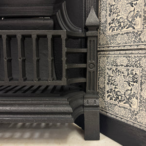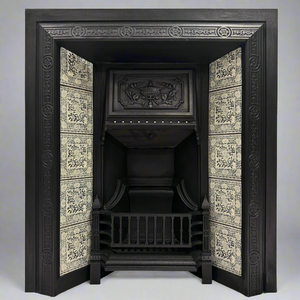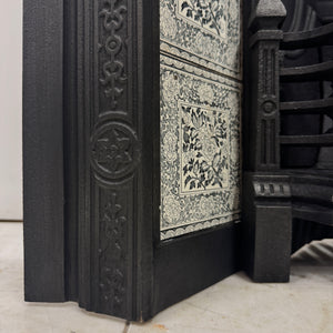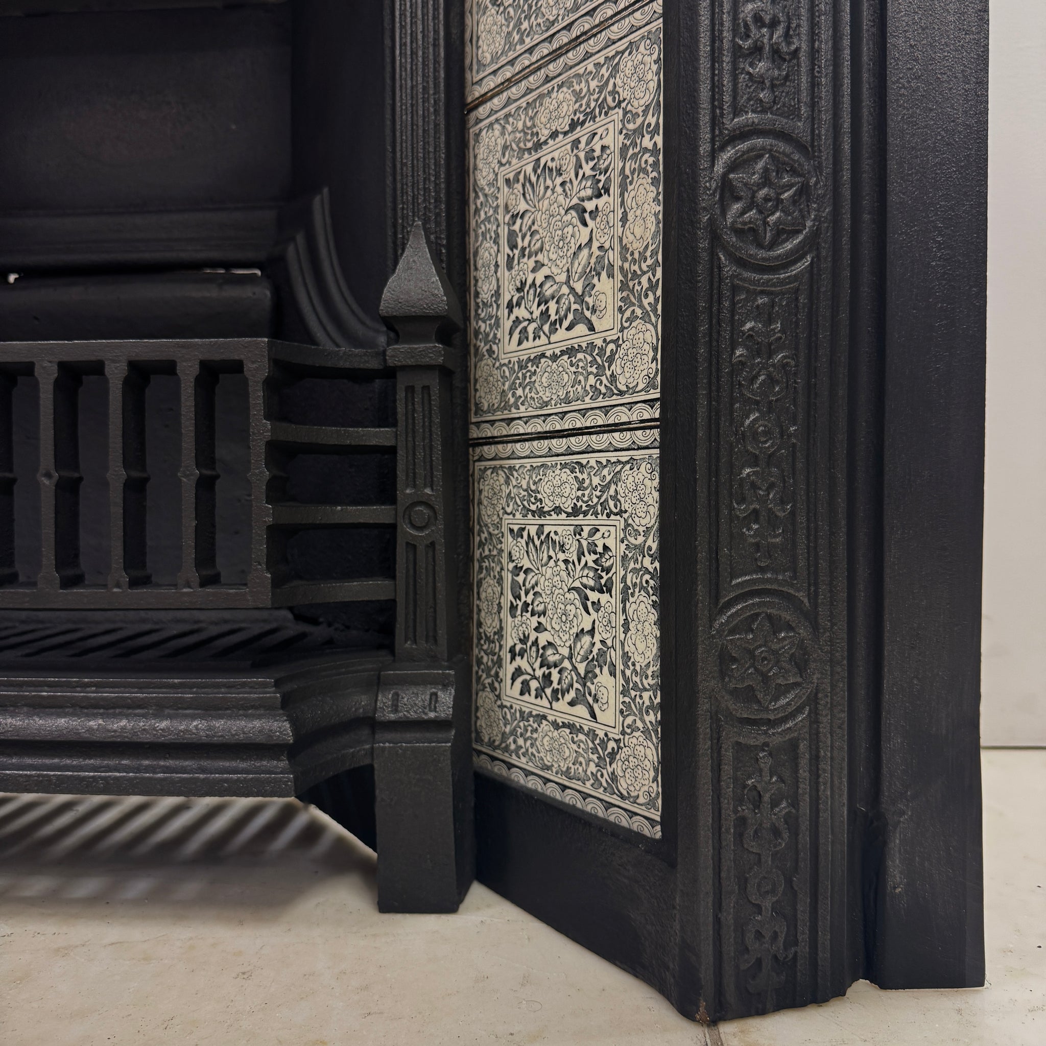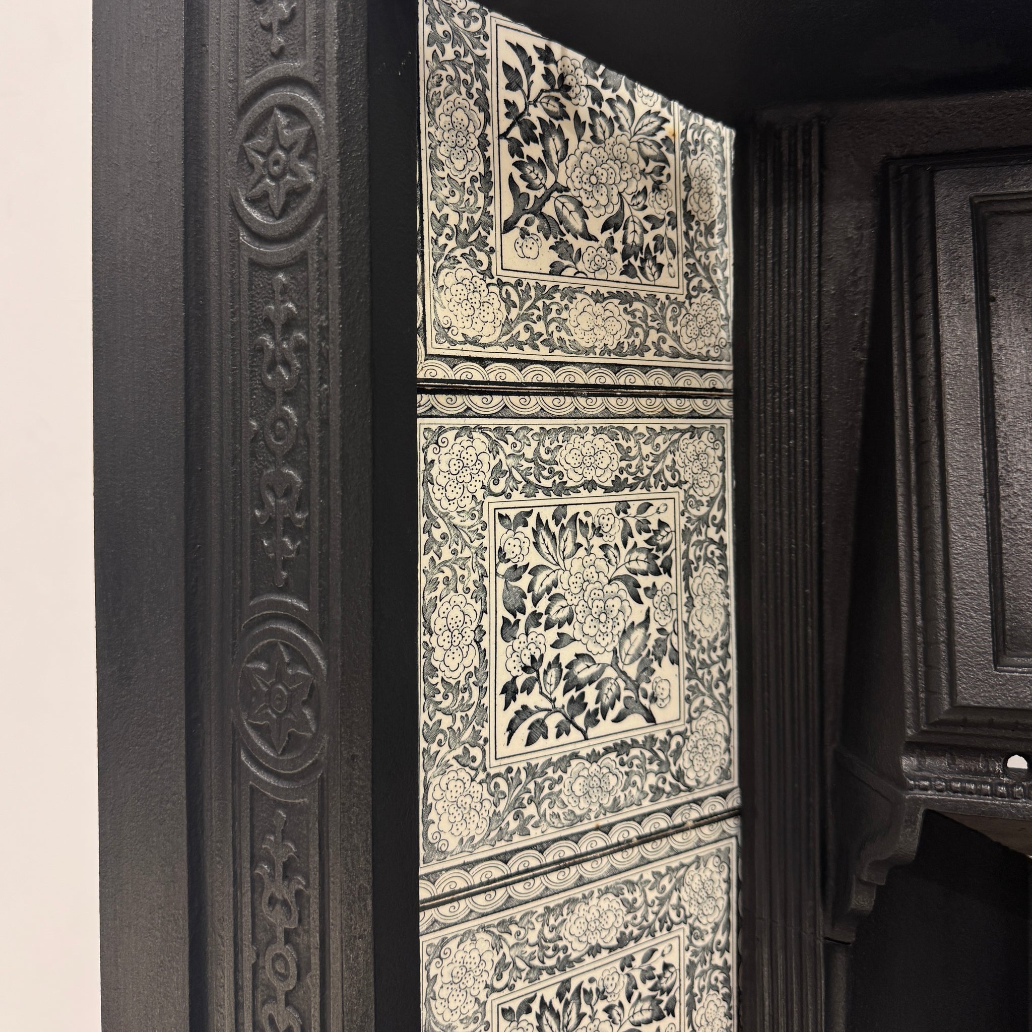 The insert is complemented by an original set of hand finished tiles, each displaying a delicate botanical design on a soft white/ivory background, a refined example of the Aesthetic Movement’s love of nature and monochrome balance.