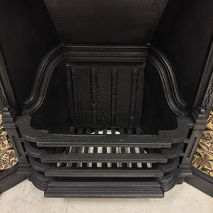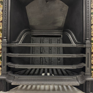 The insert features a beautifully arched opening with a beaded and geometric border, leading to an integrated three-bar grate and arched backplate.