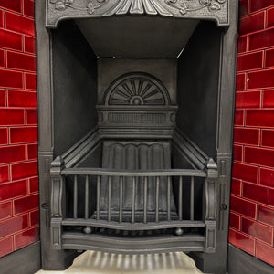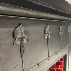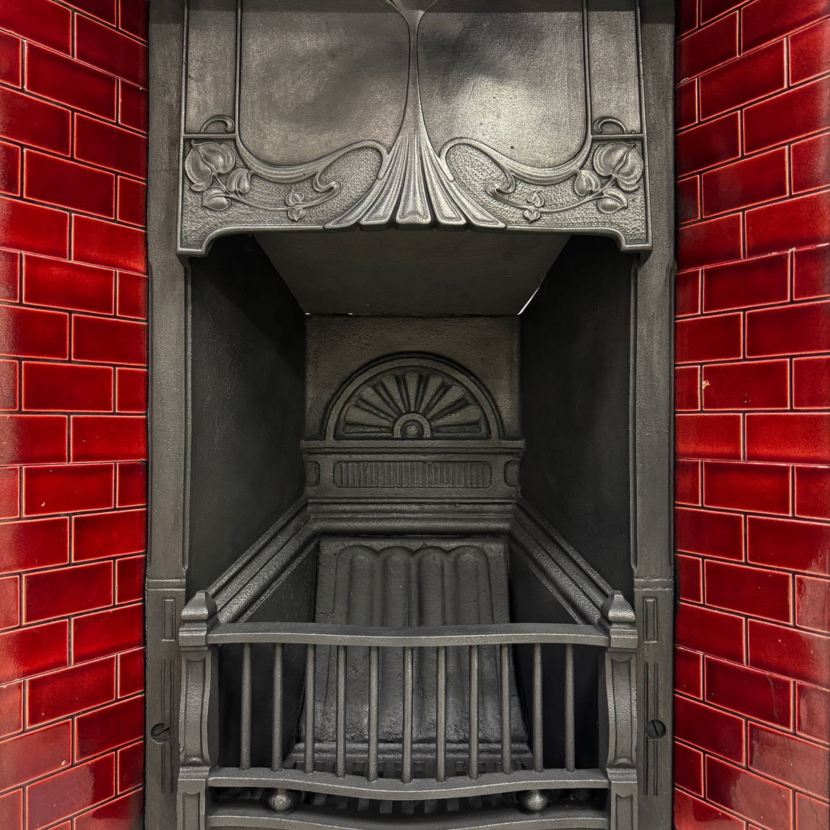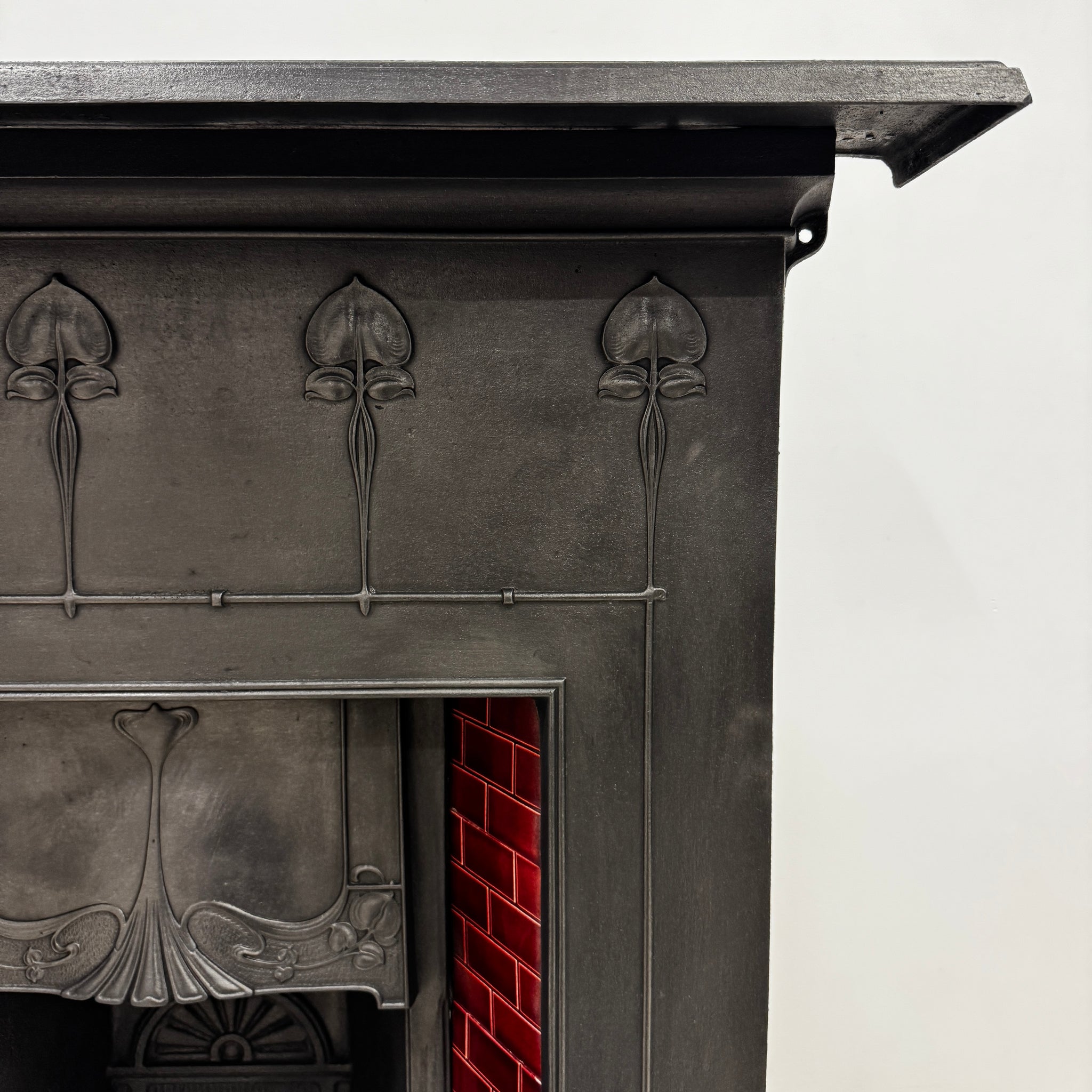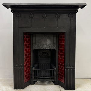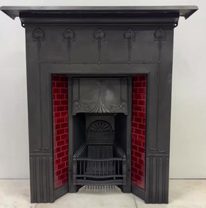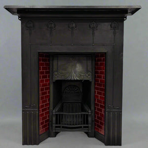 This antique combination fireplace showcases elegant Art Nouveau influences. Made from cast iron, the fireplace features a prominent surround with graceful floral motifs and flowing linear detailing typical of the period.Deep red brick-effect tiles frame the fire opening, adding a rich contrast.