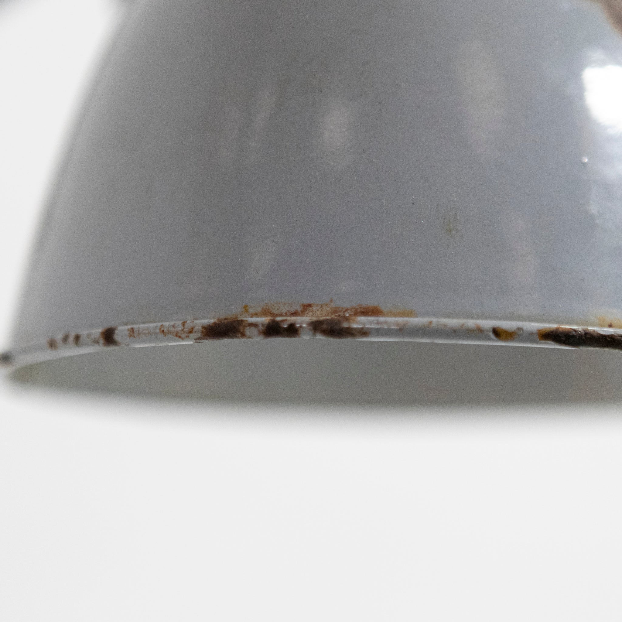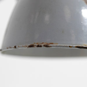 The domed enamel shade retains its original soft grey finish with visible age-related wear and deep, naturally aged patina consistent with genuine factory or workshop use.