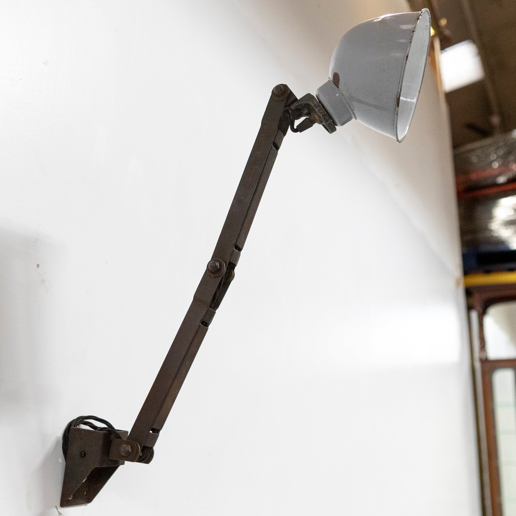 An original early 20th century industrial wall light featuring a fully articulated steel arm and original grey enamel shade.