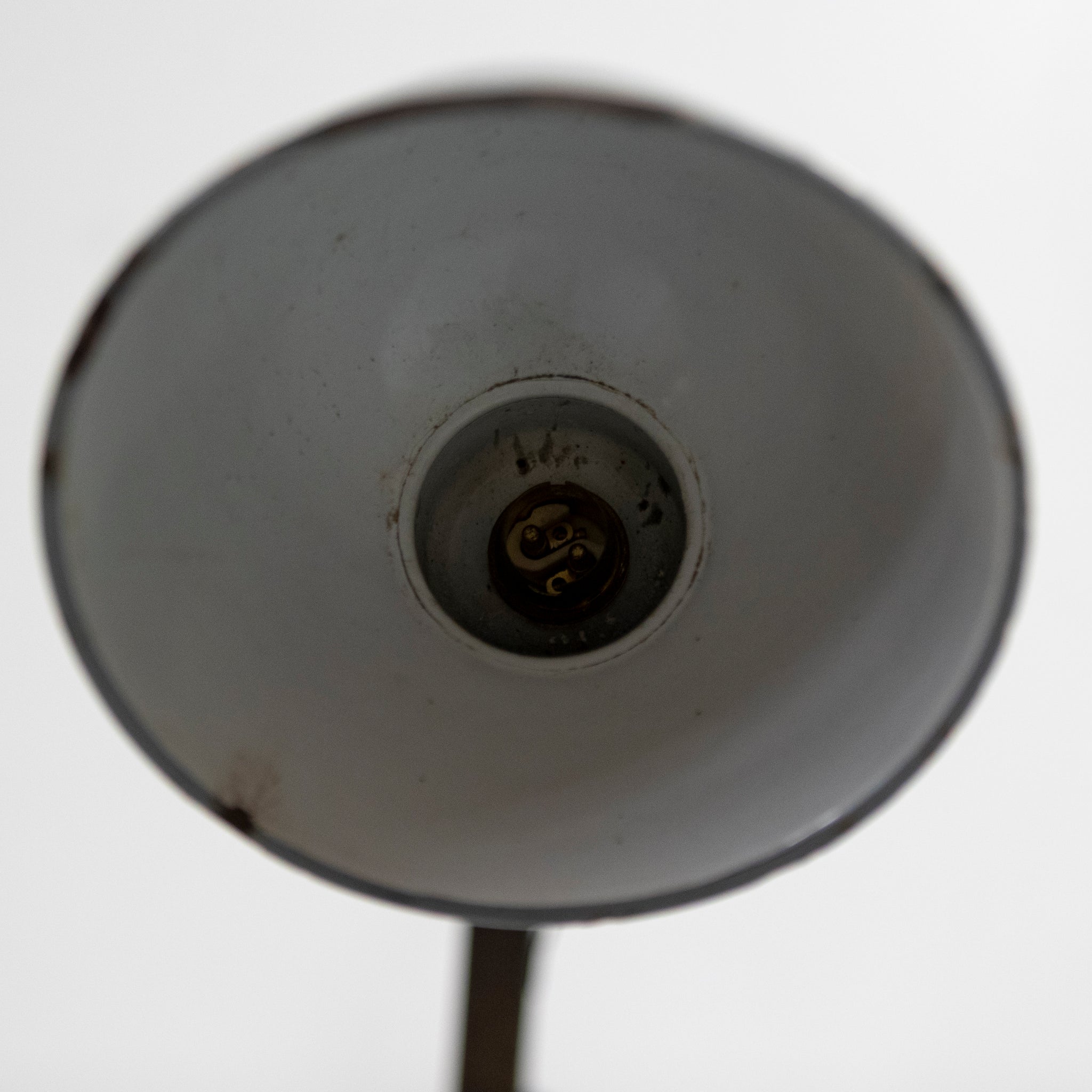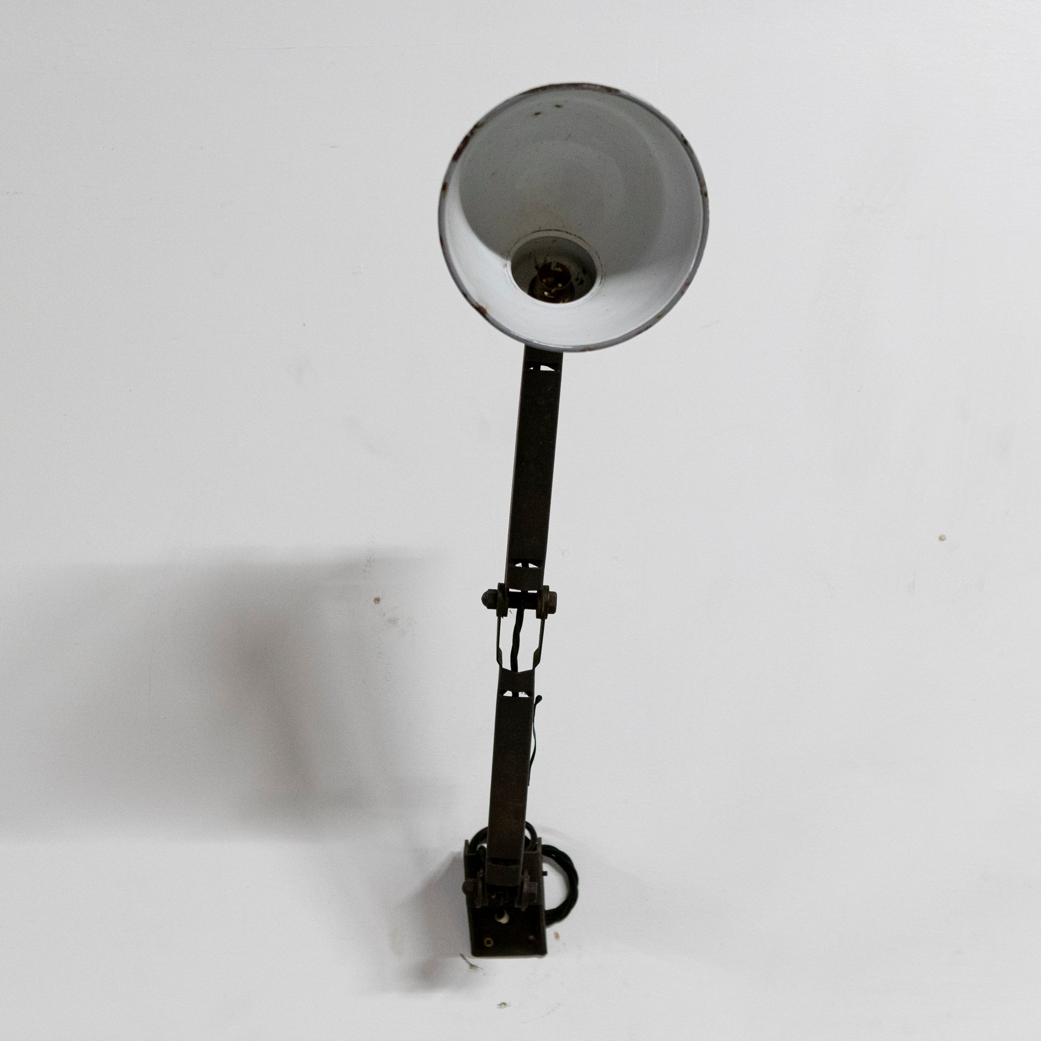 Designed for serious working environments, this articulated lamp features a fully adjustable jointed arm allowing precise directional control, terminating in its original grey enamelled metal shade with white interior for strong, focused light output.