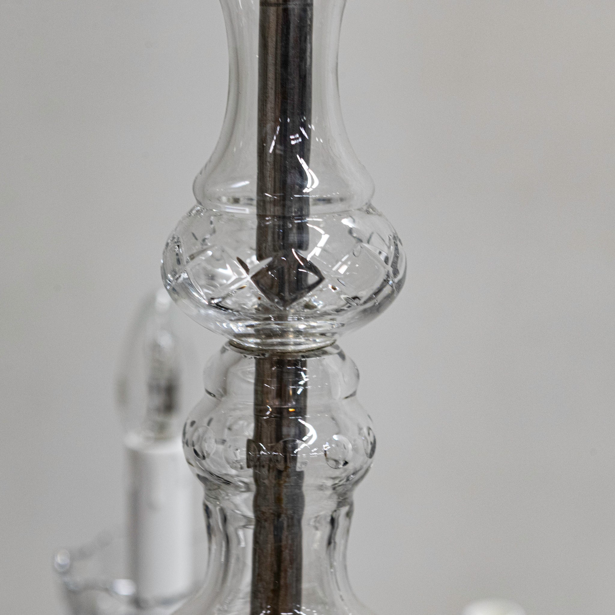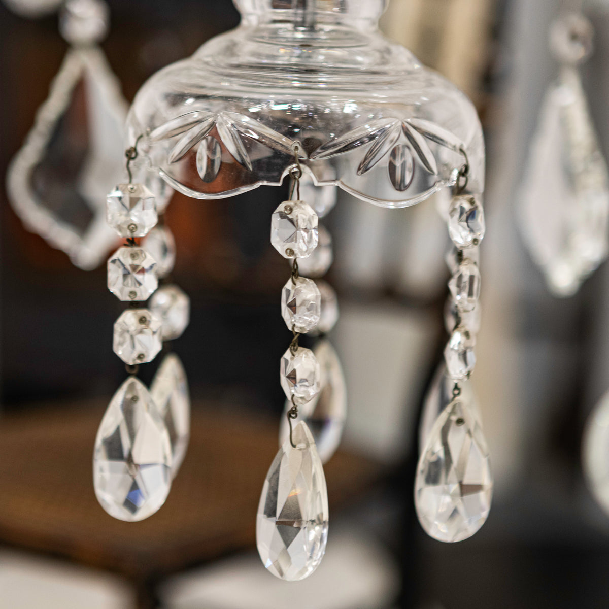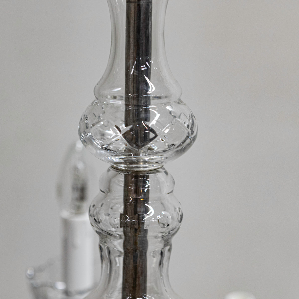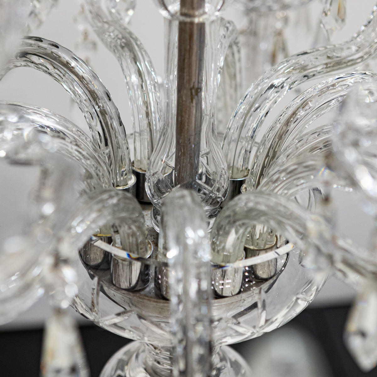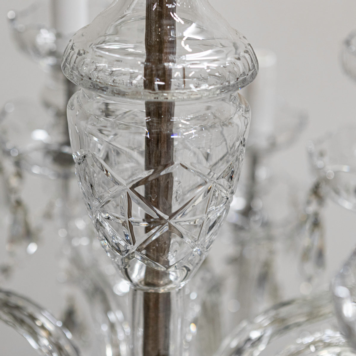 Composed of scalloped droplets, cut glass bobeche trays and detailed stems that are also echoed through the central elements.