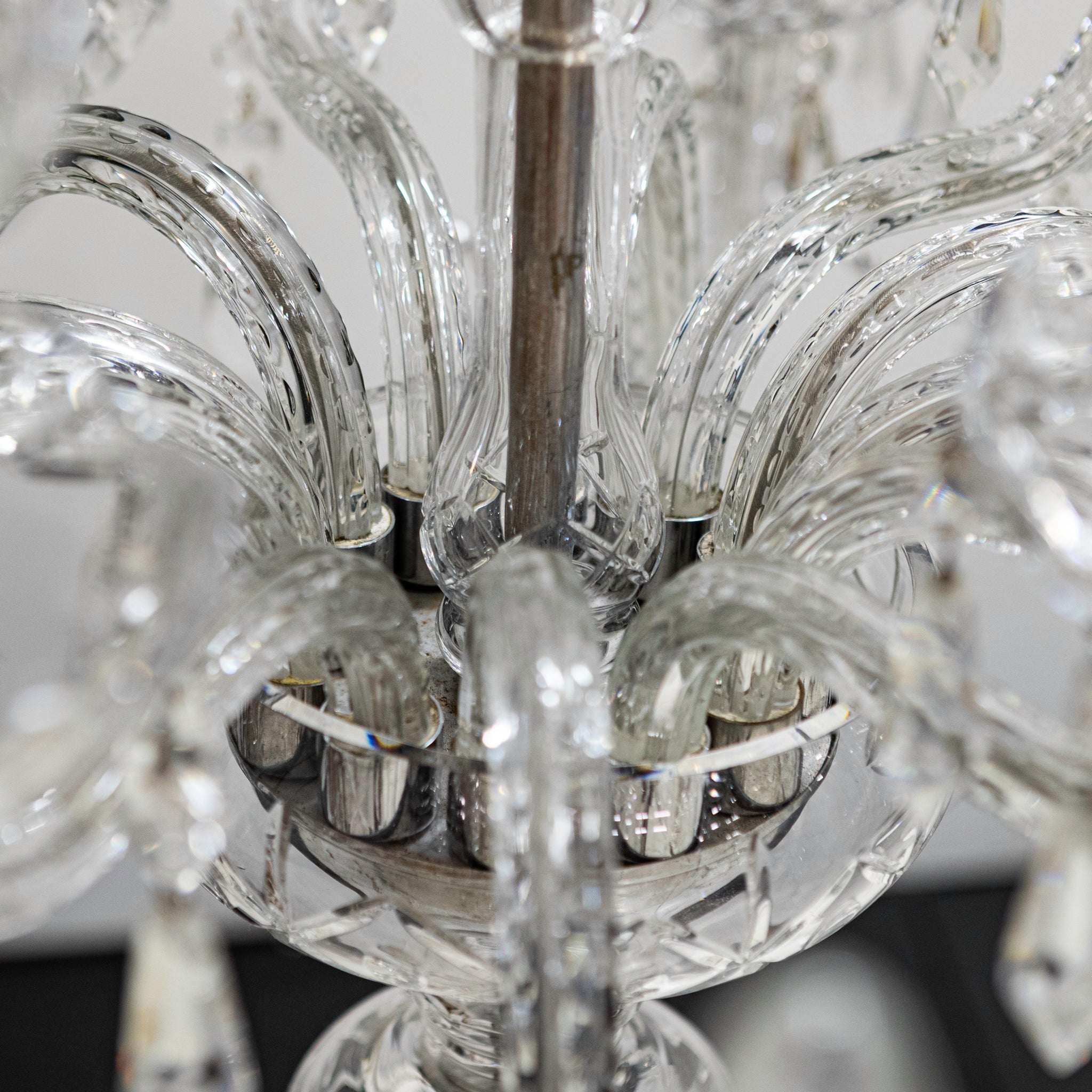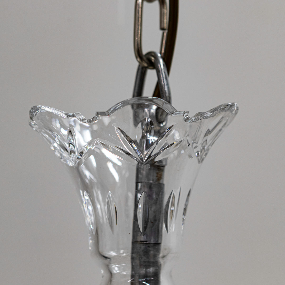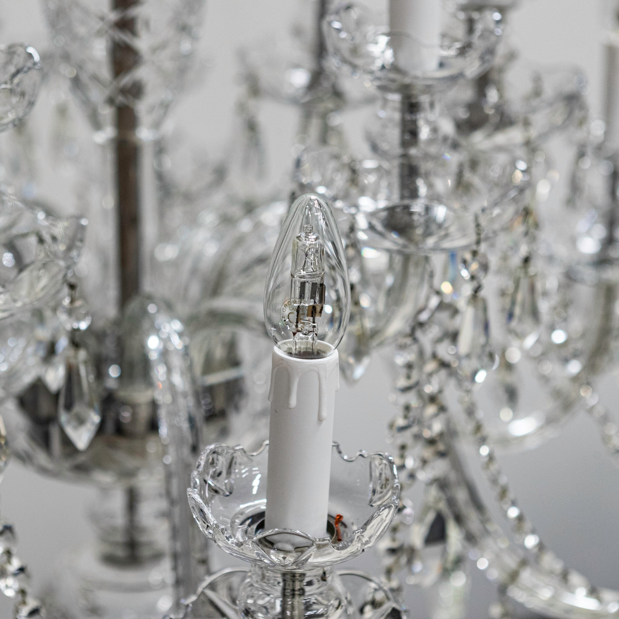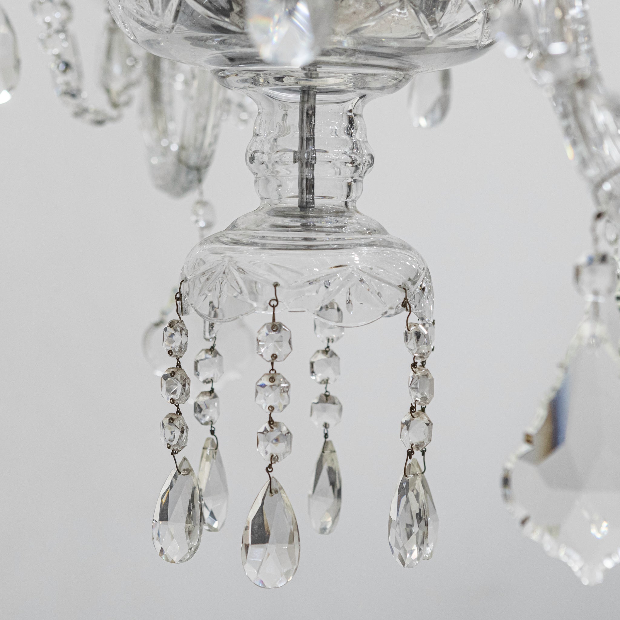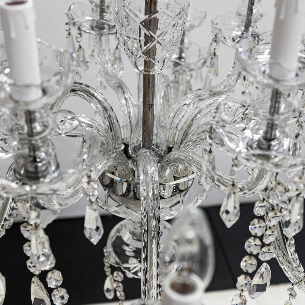 Composed of scalloped droplets, cut glass bobeche trays and detailed stems that are also echoed through the central elements.