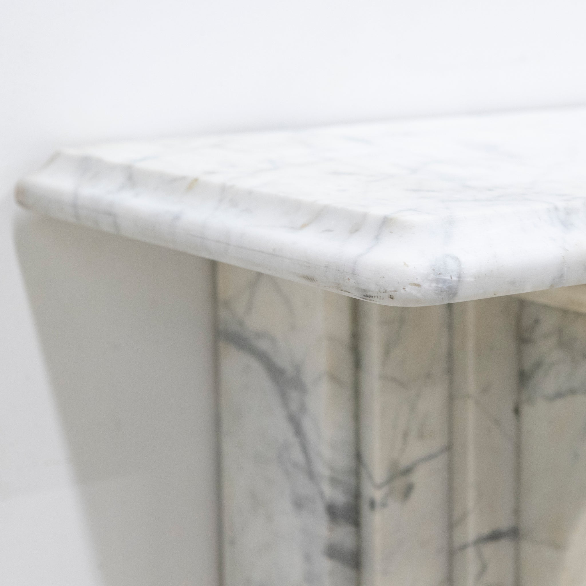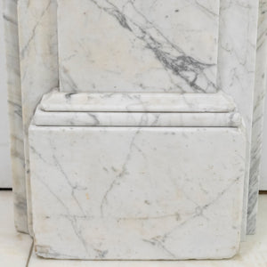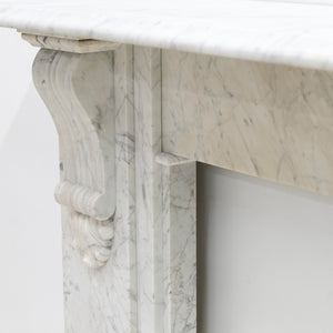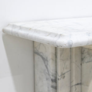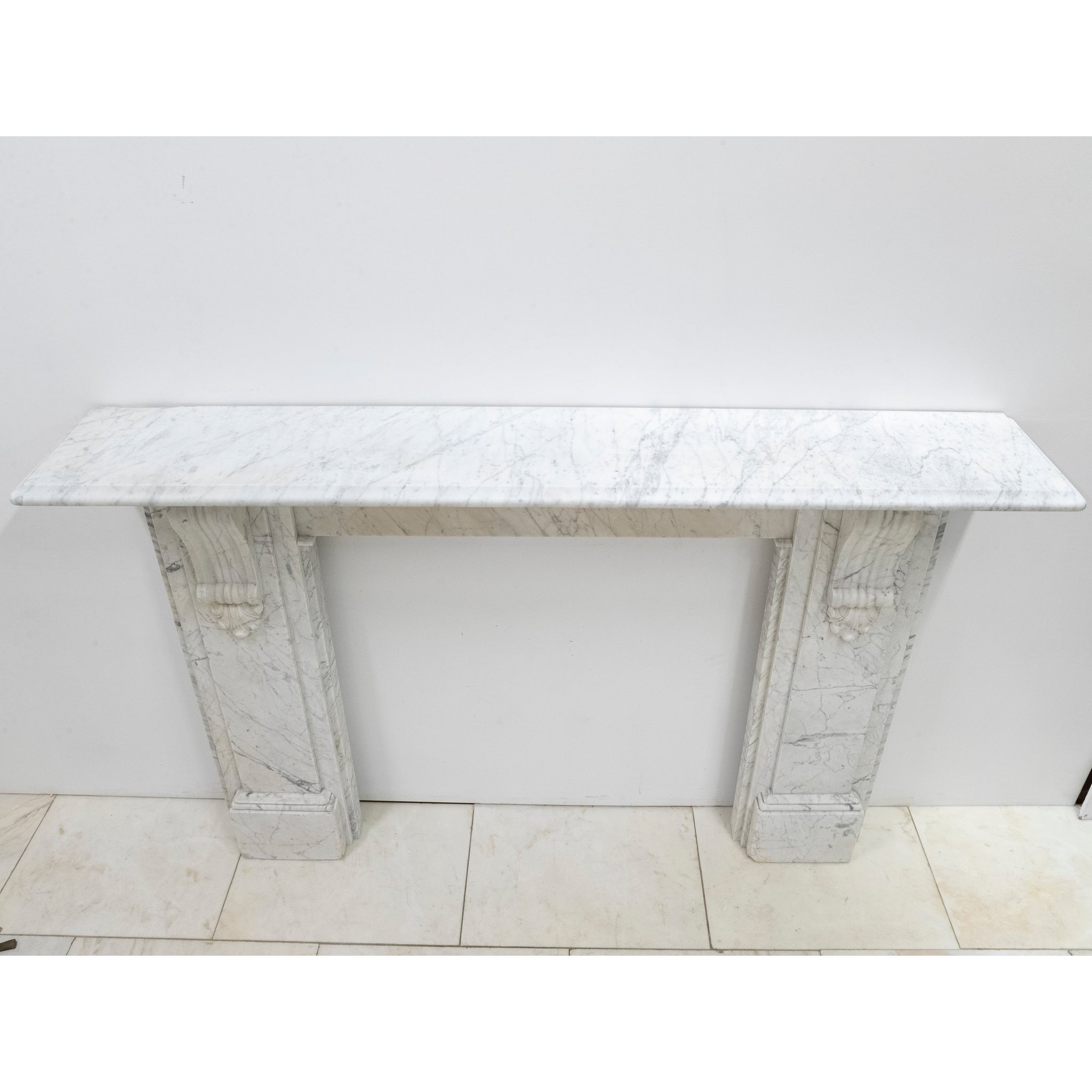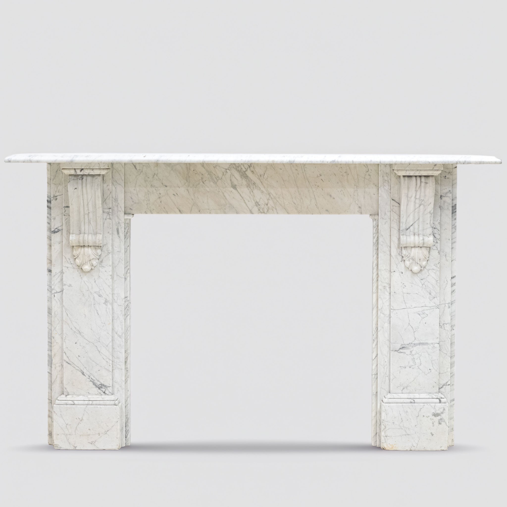 A pair of elegrant, carved marble corbels supporting the shelf. Each corbel is fluted and terminates in a bold carved drop with stylised acanthus-style detailing.