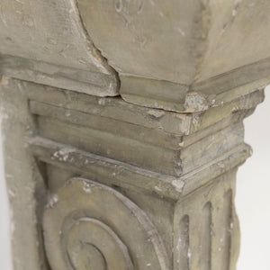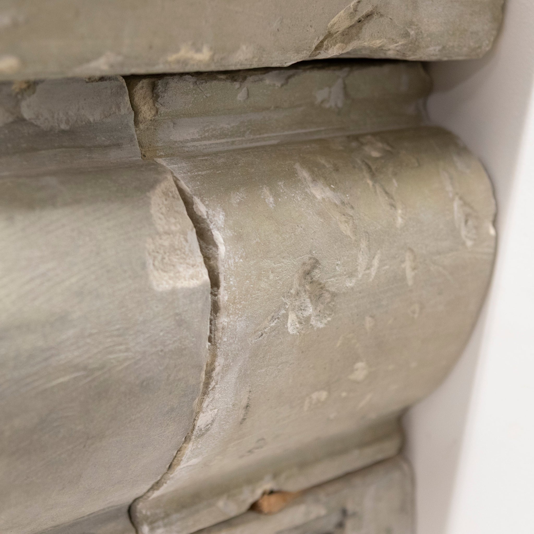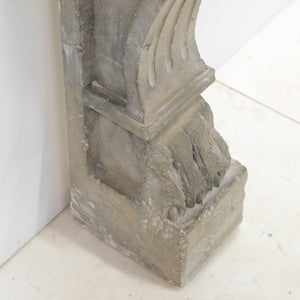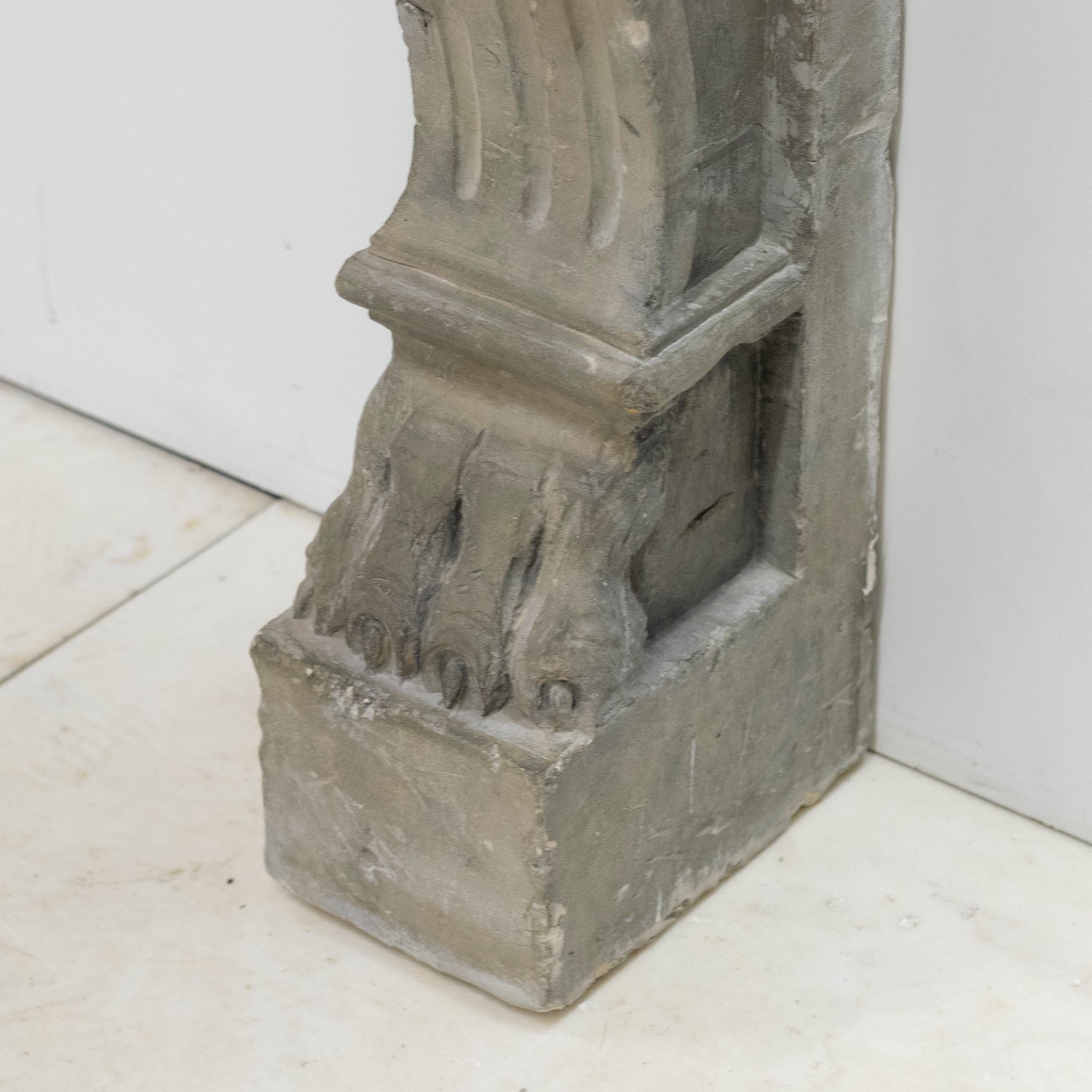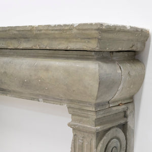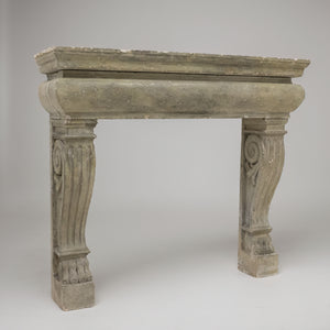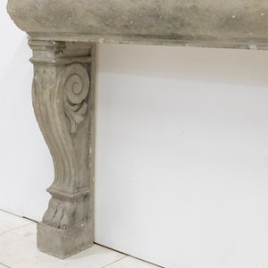 An impressive and bold freplace surround with bold proportions and sculptural carving, featuring a broad, rounded lintel supported by two orantely carved legs. Each leg is detailed with vertical fluting and large corbel-like scrolls, which project forward and give the surround a strong sense of depth. At the base, the legs terminate in carved claw feet.