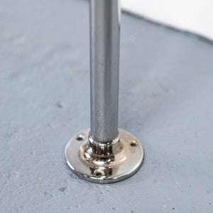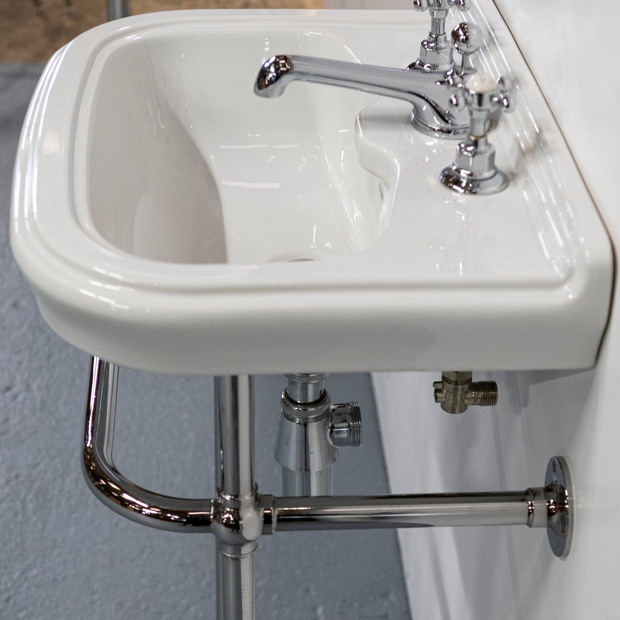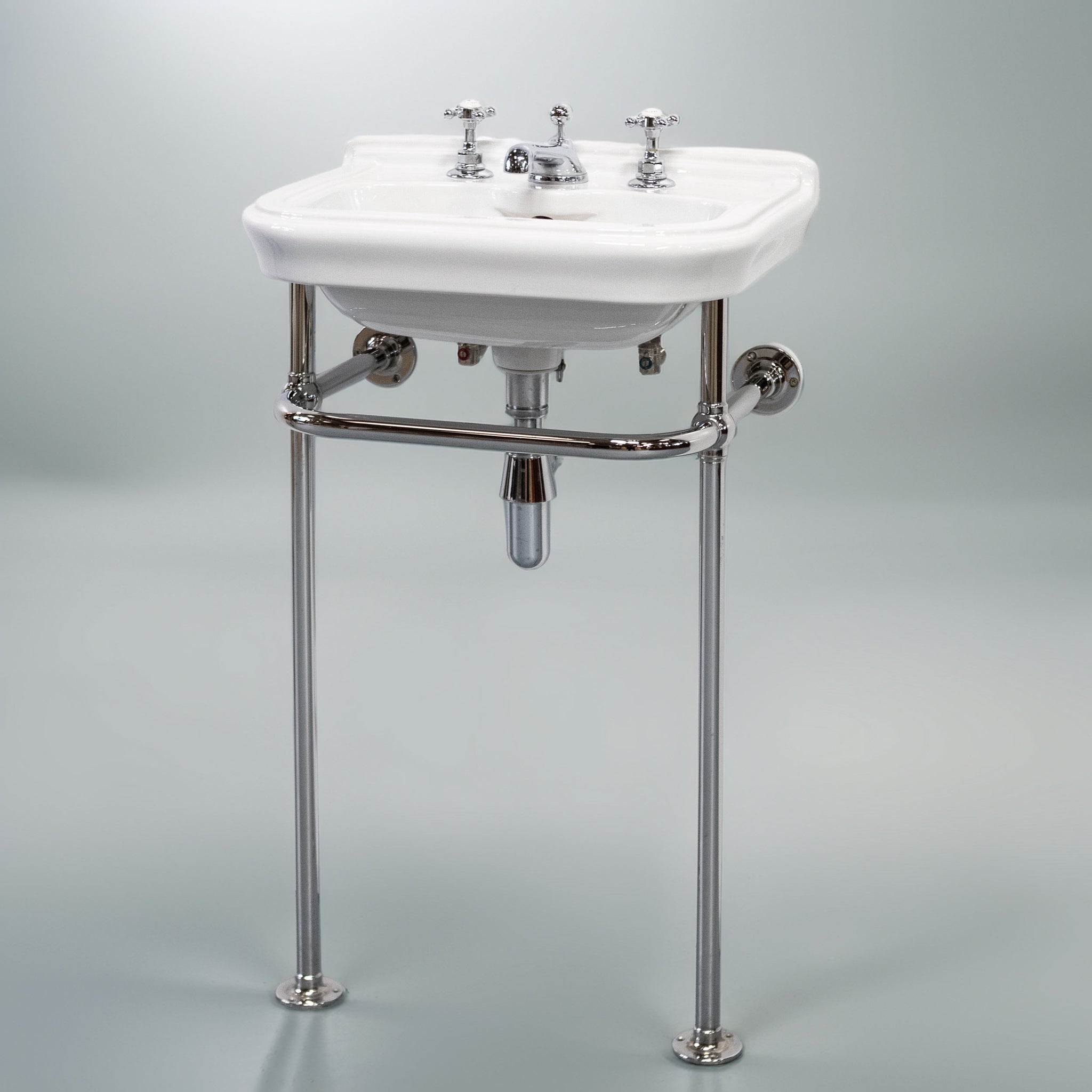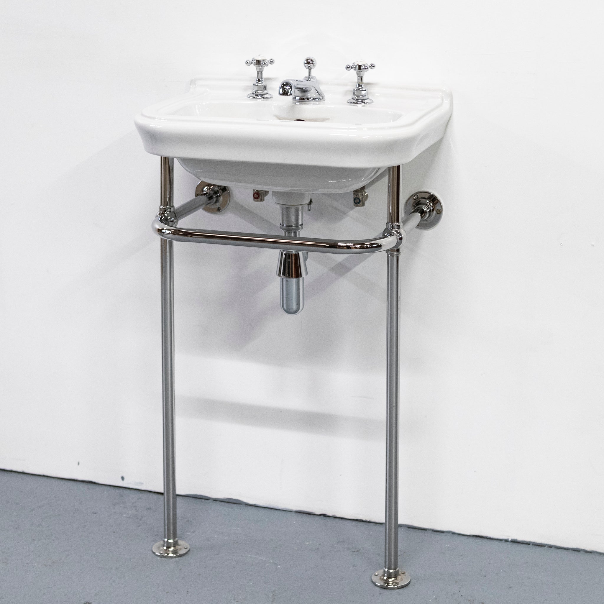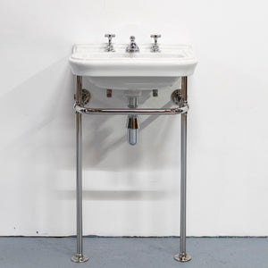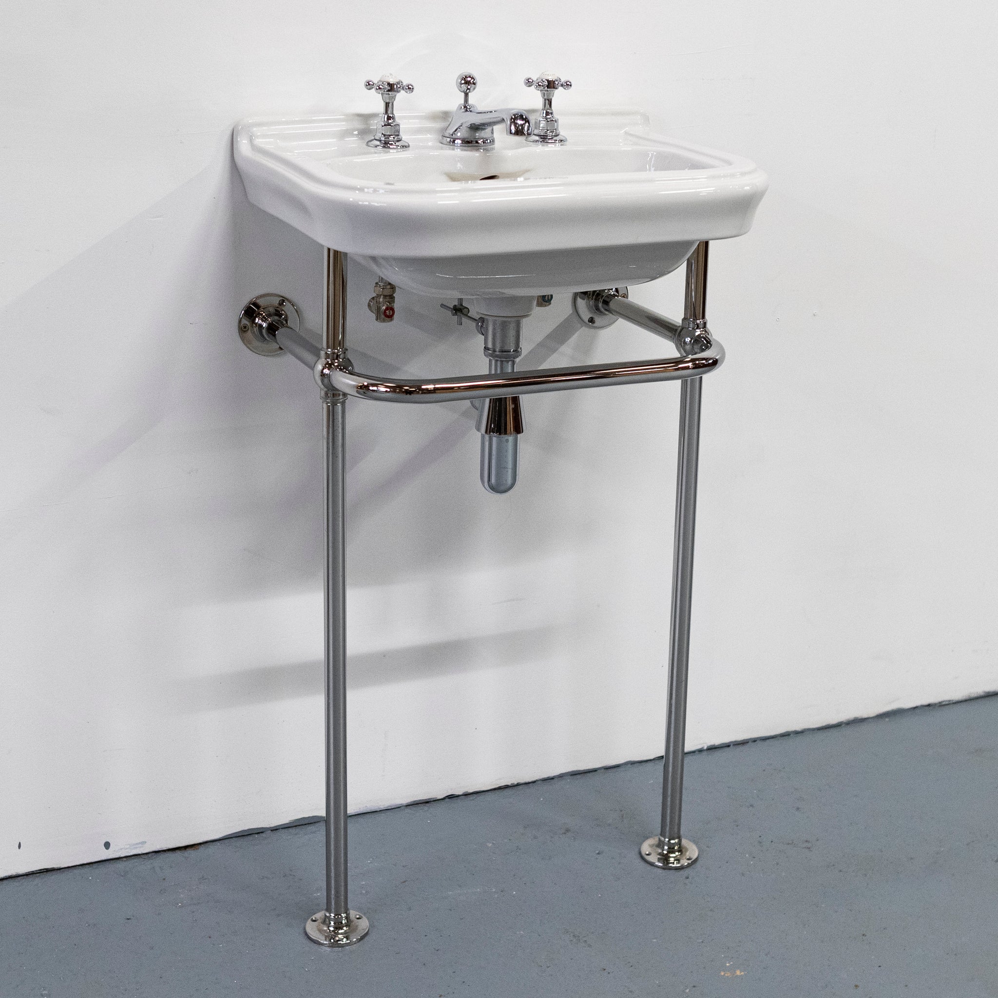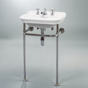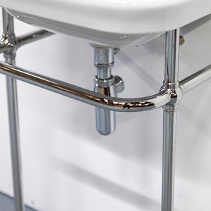 The chrome stand features slender legs, a curved front rail, and wall-fixing arms for stability, with exposed pipework that enhances the period character. Ideal for bathrooms or cloakrooms in heritage and traditional interiors.