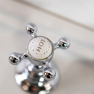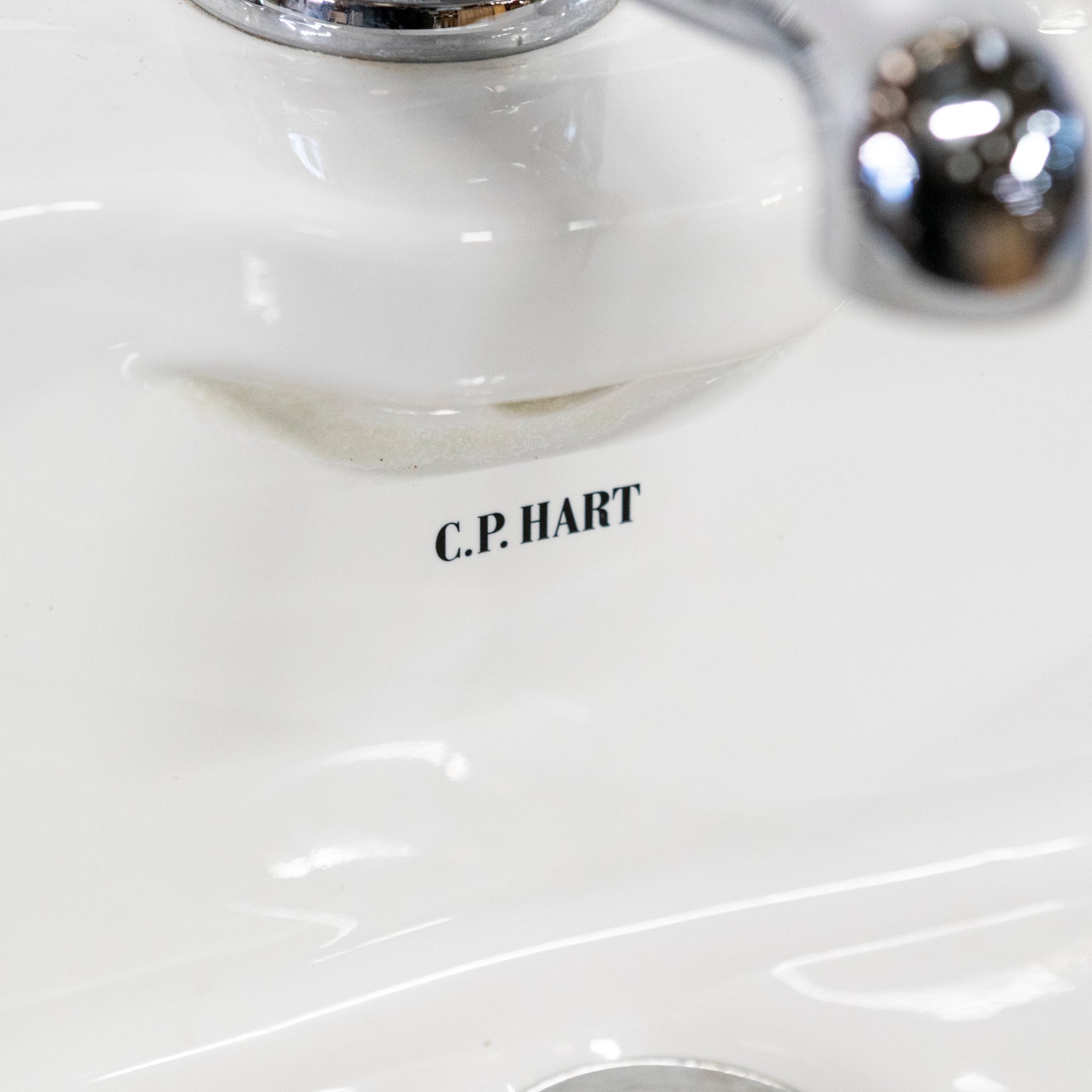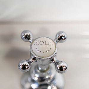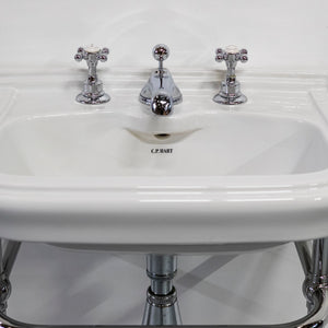 Reclaimed ceramic basin with a polished chrome washstand by C.P. Hart.