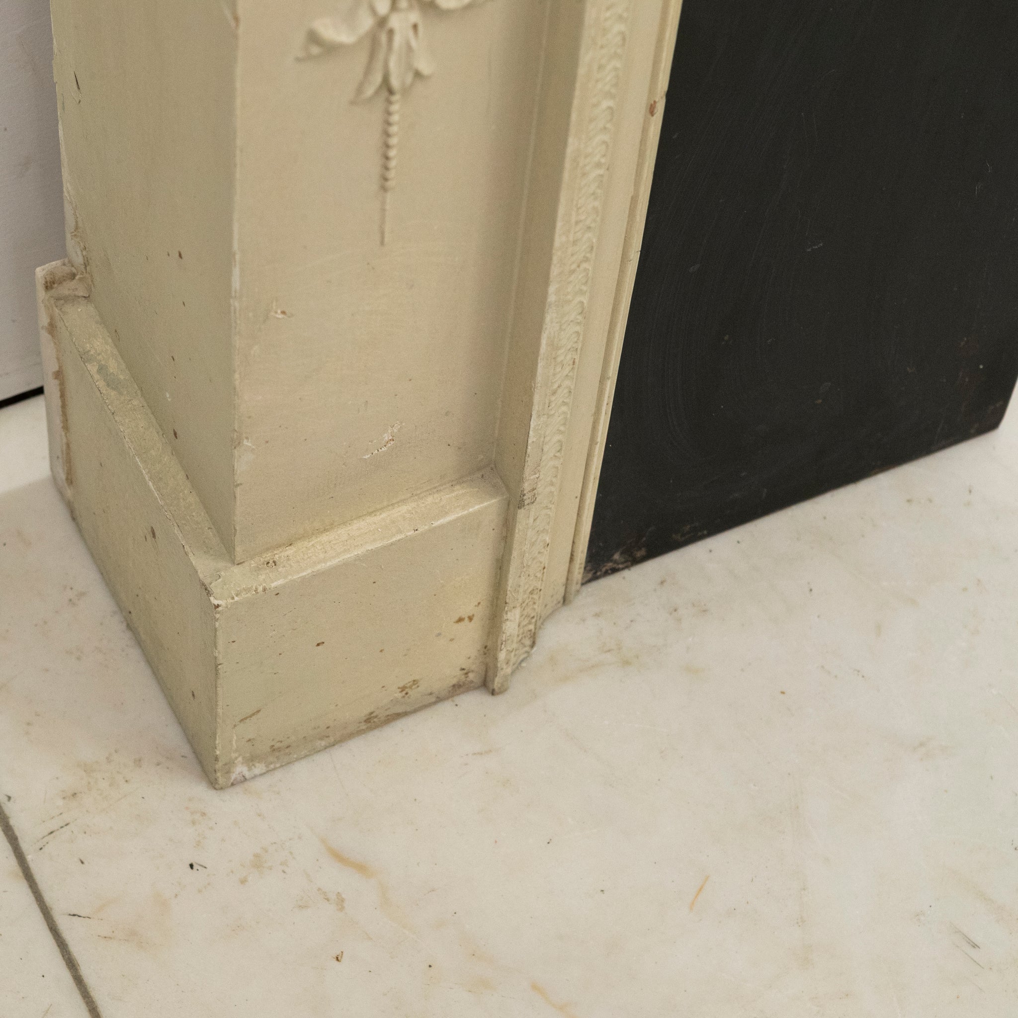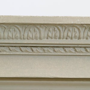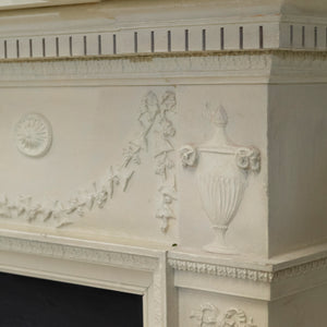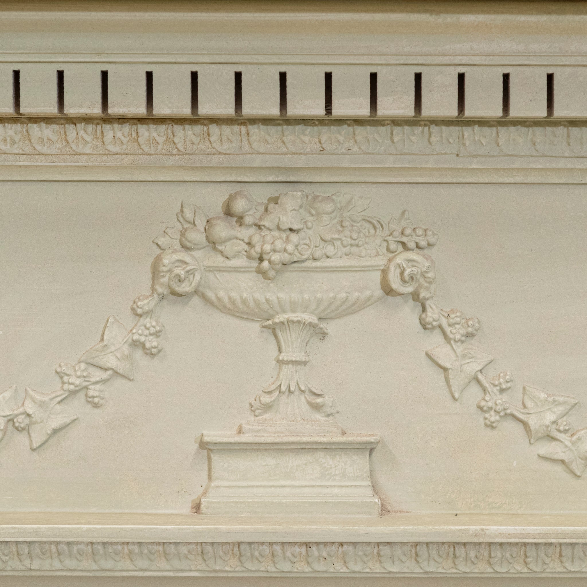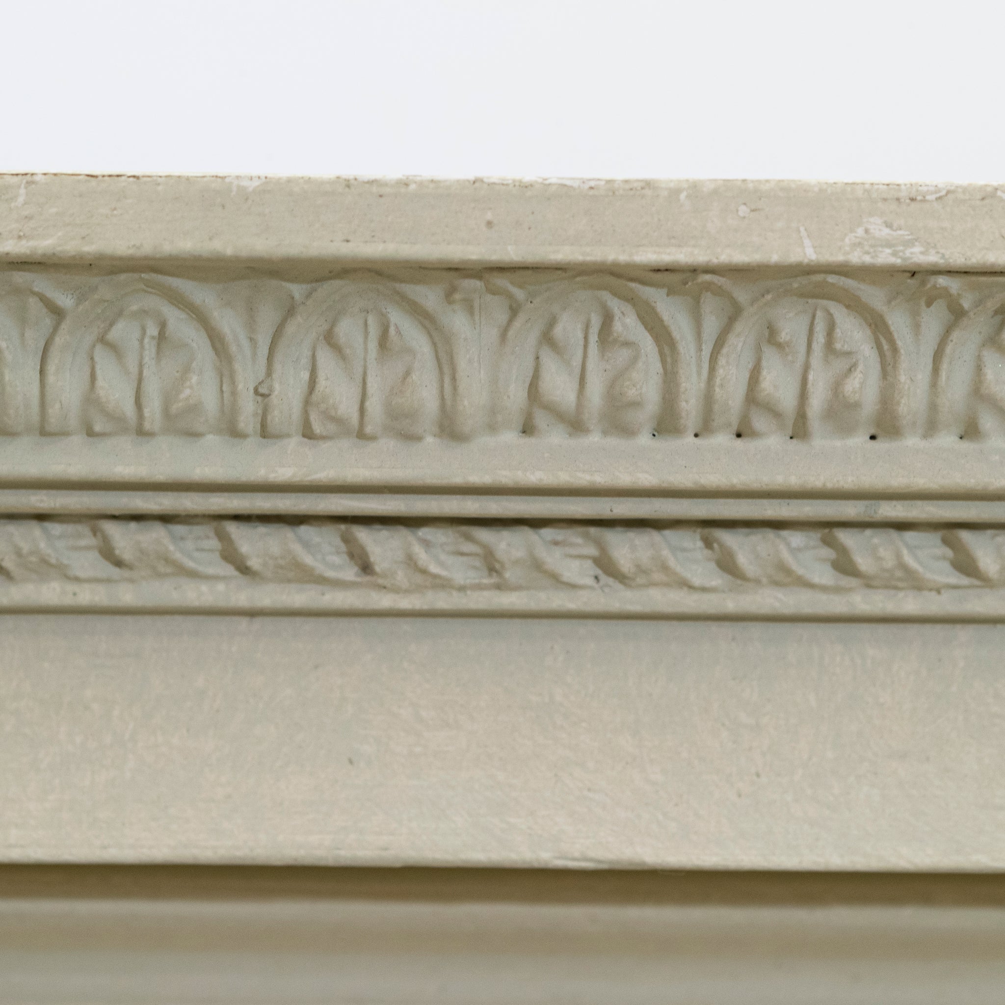 The frieze is finely detailed with classical garlands, paterae and urns, framed by crisply moulded bands and dentil work, all surmounted by a deep projecting shelf. The jambs are adorned with elegant vertical reliefs. The scale of the piece makes it particularly well suited to grand reception rooms, drawing rooms or formal interiors.