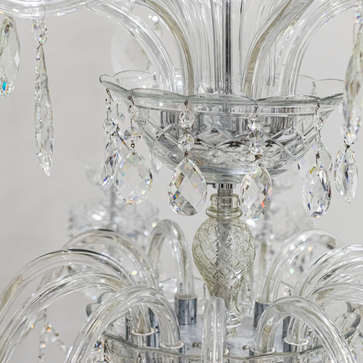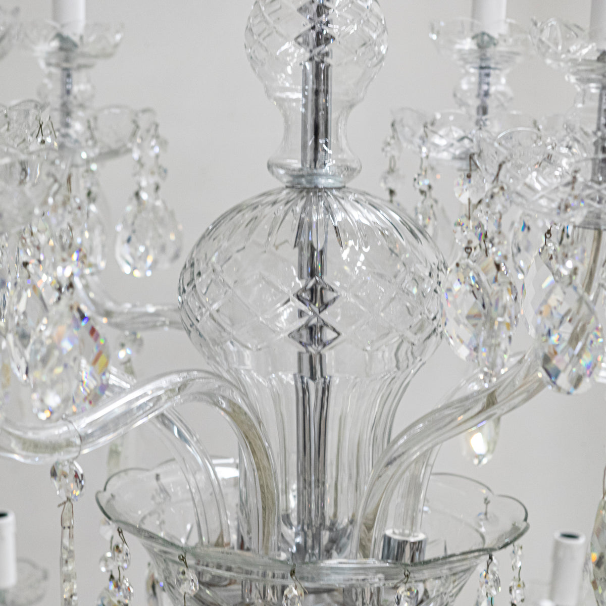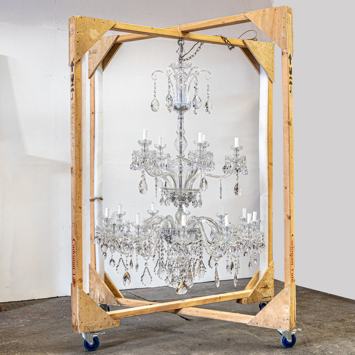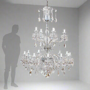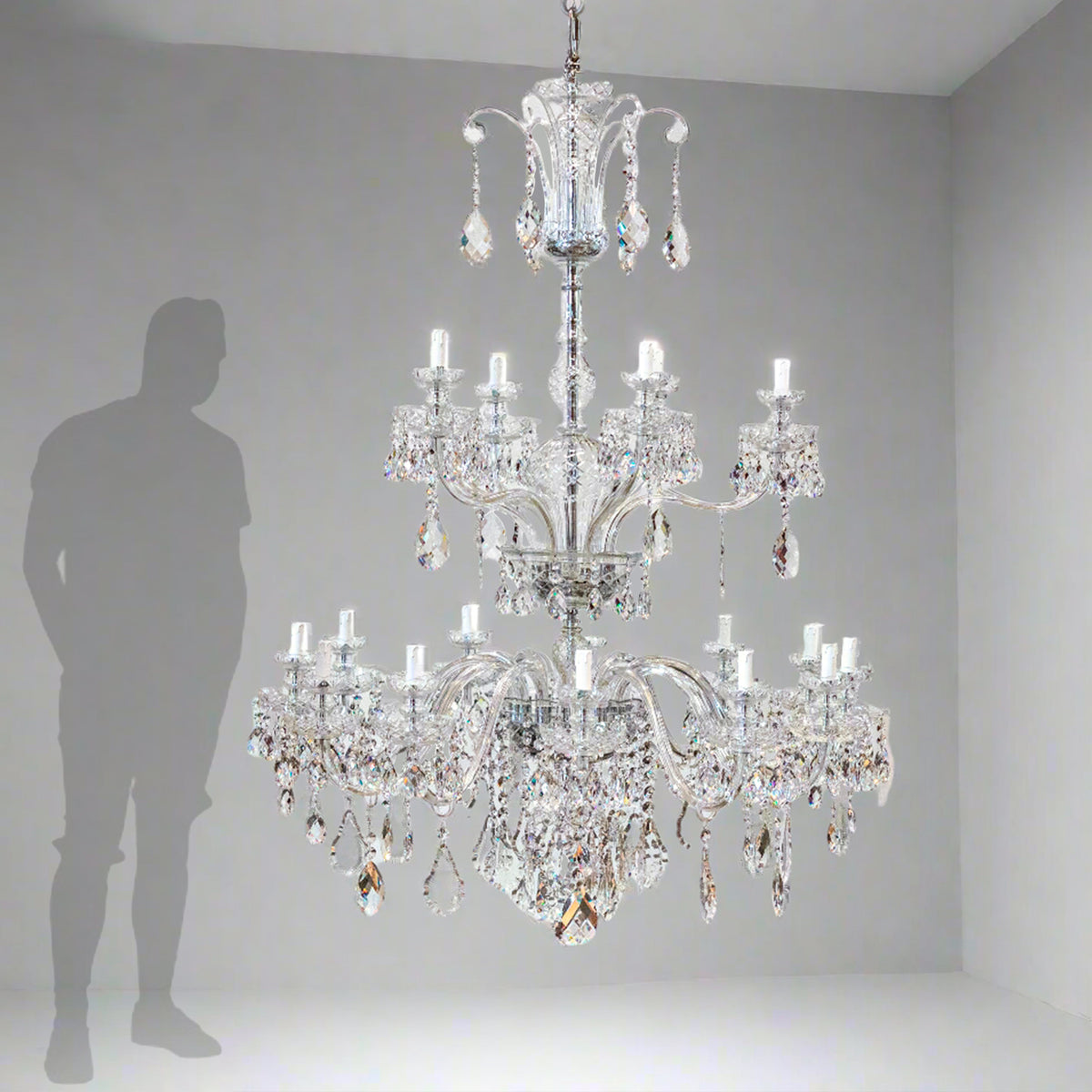 With an imposing height of 5'7'', this spectacular lead crystal chandelier has 18 candle branches: 12 to the lower tier, 6 to the middle.