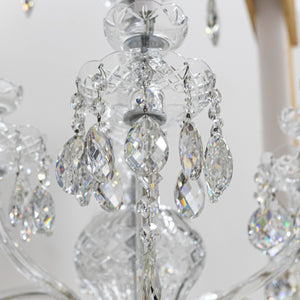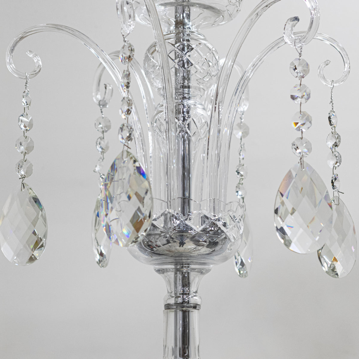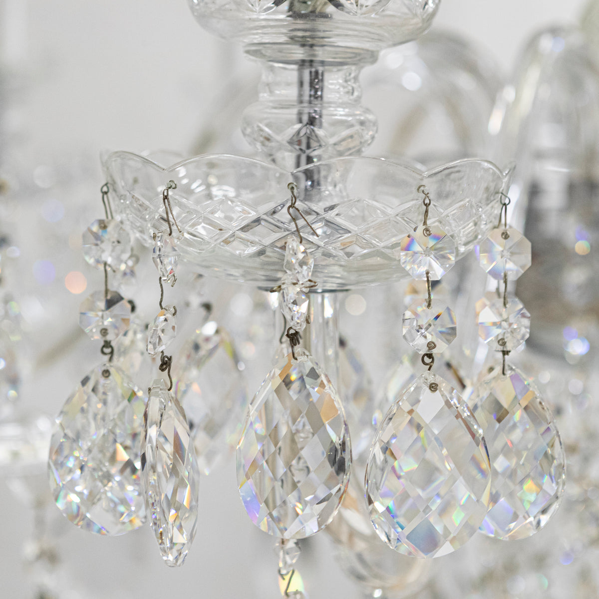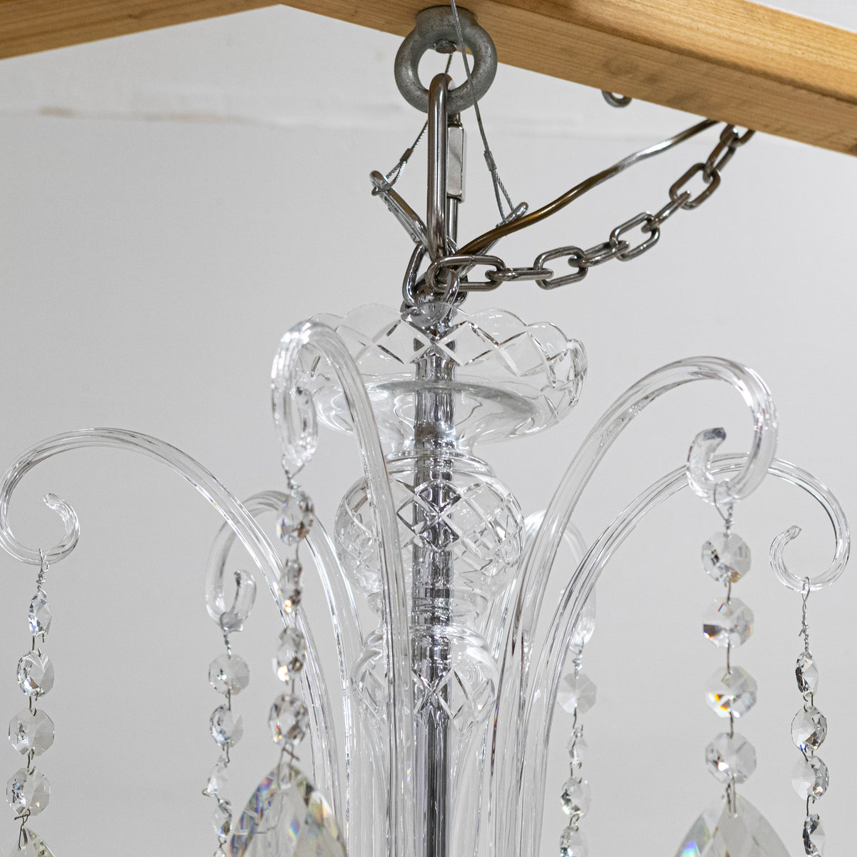 With petal-edged cups and pans on, with spire ornaments above; dressed profusely with graduated festoons of ‘double star’ prisms and pear-shaped pendants, terminating in a large multi-faceted finial.