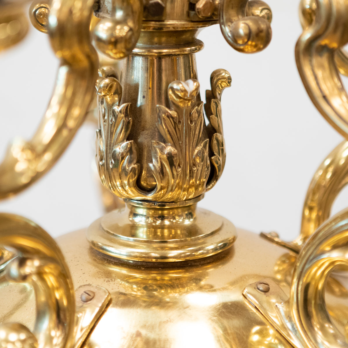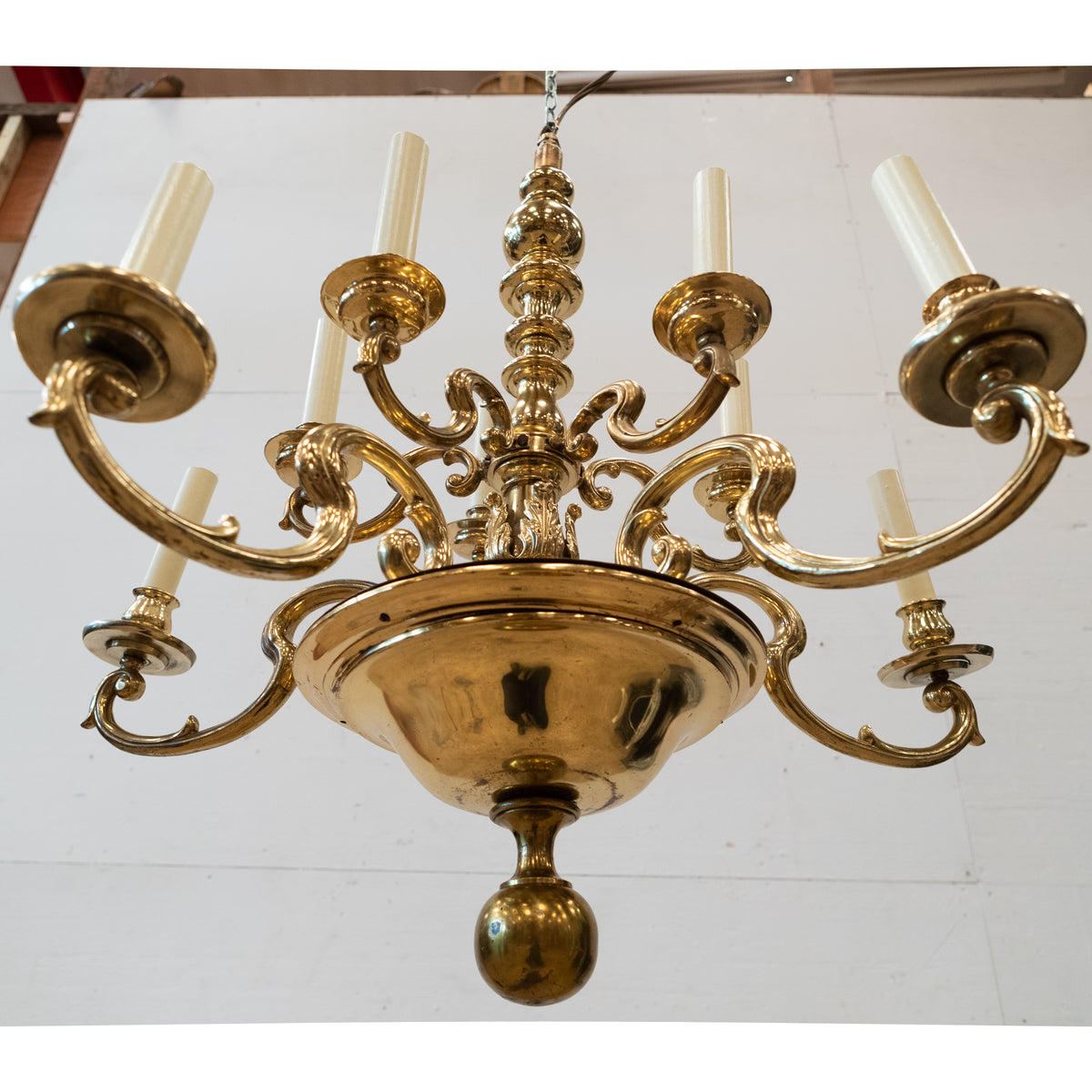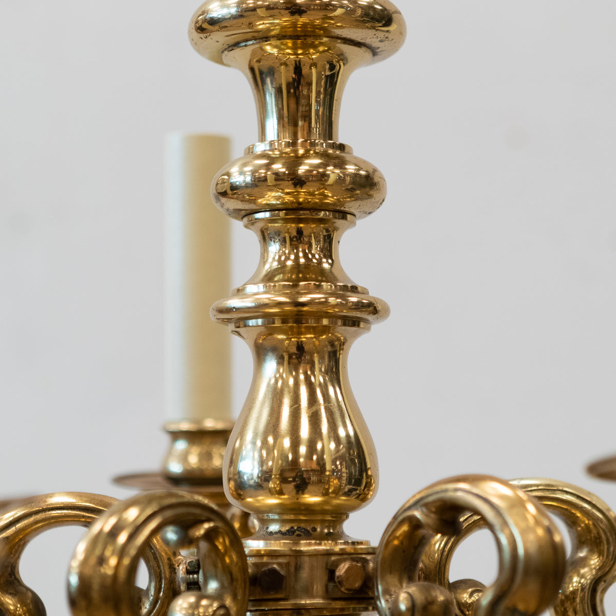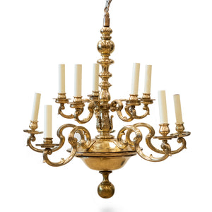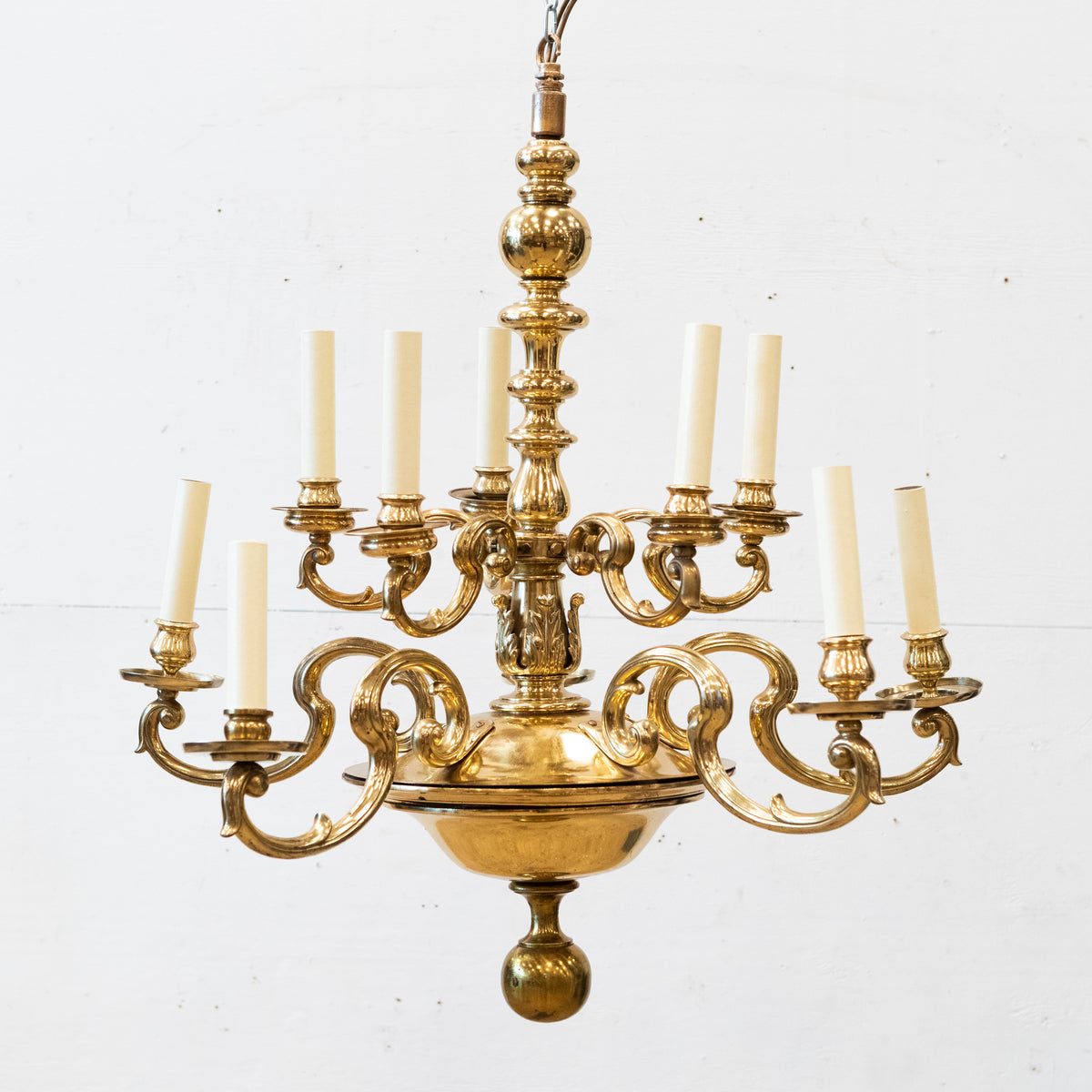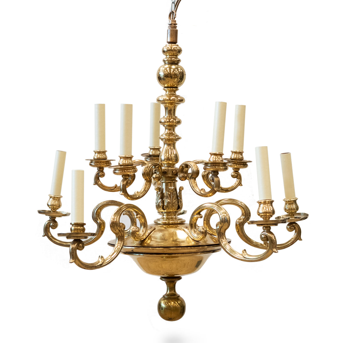 Typical of the Dutch style has a turned shaft with leaf details and a ball base. The two tiers deliver 10 ornate serpentine arms with light fixtures and drip discs.