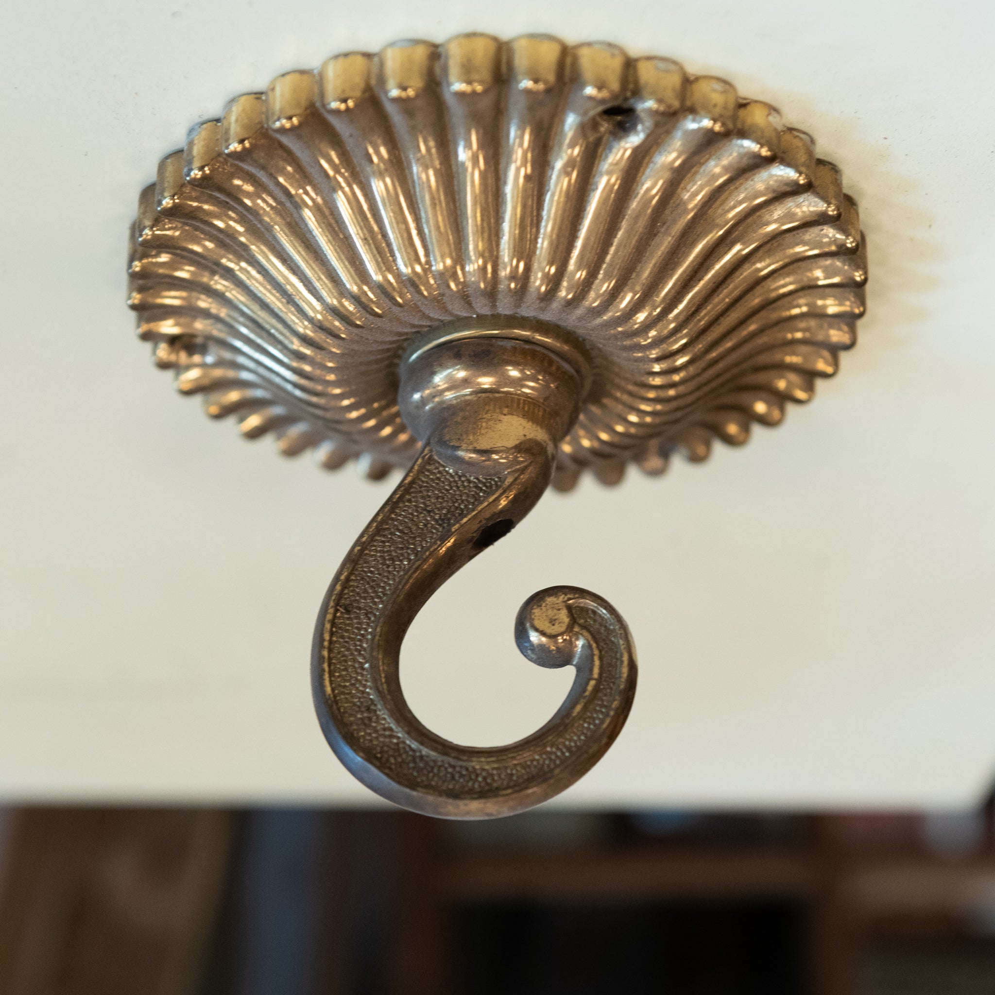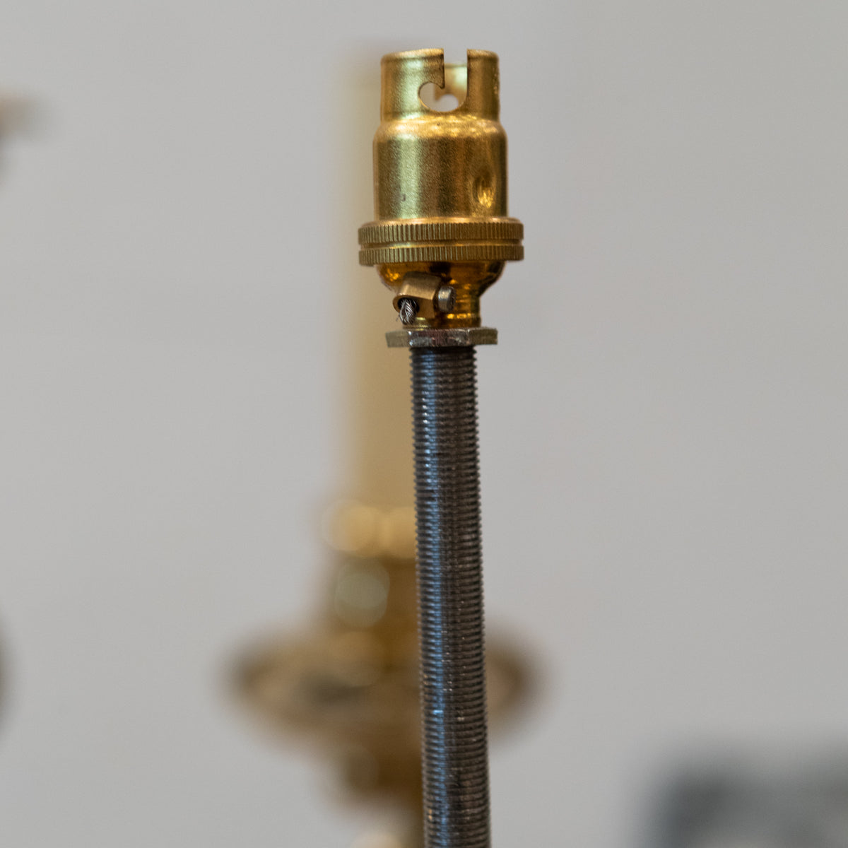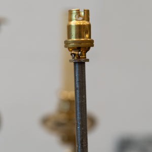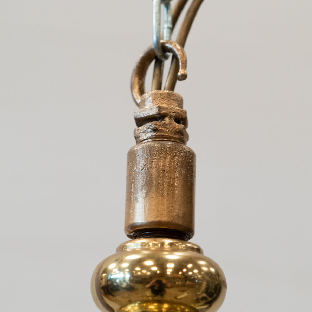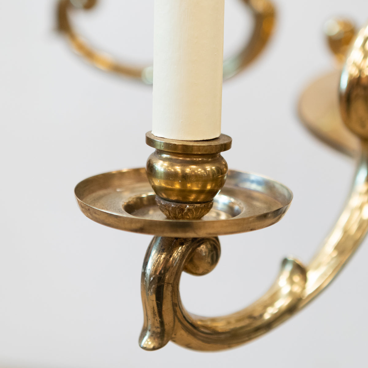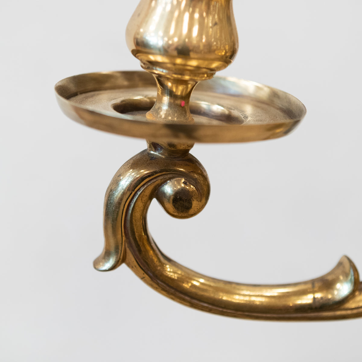 Typical of the Dutch style has a turned shaft with leaf details and a ball base. The two tiers deliver 10 ornate serpentine arms with light fixtures and drip discs.