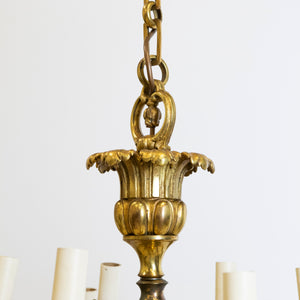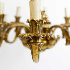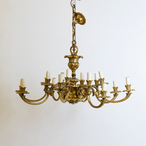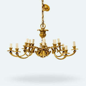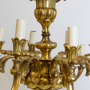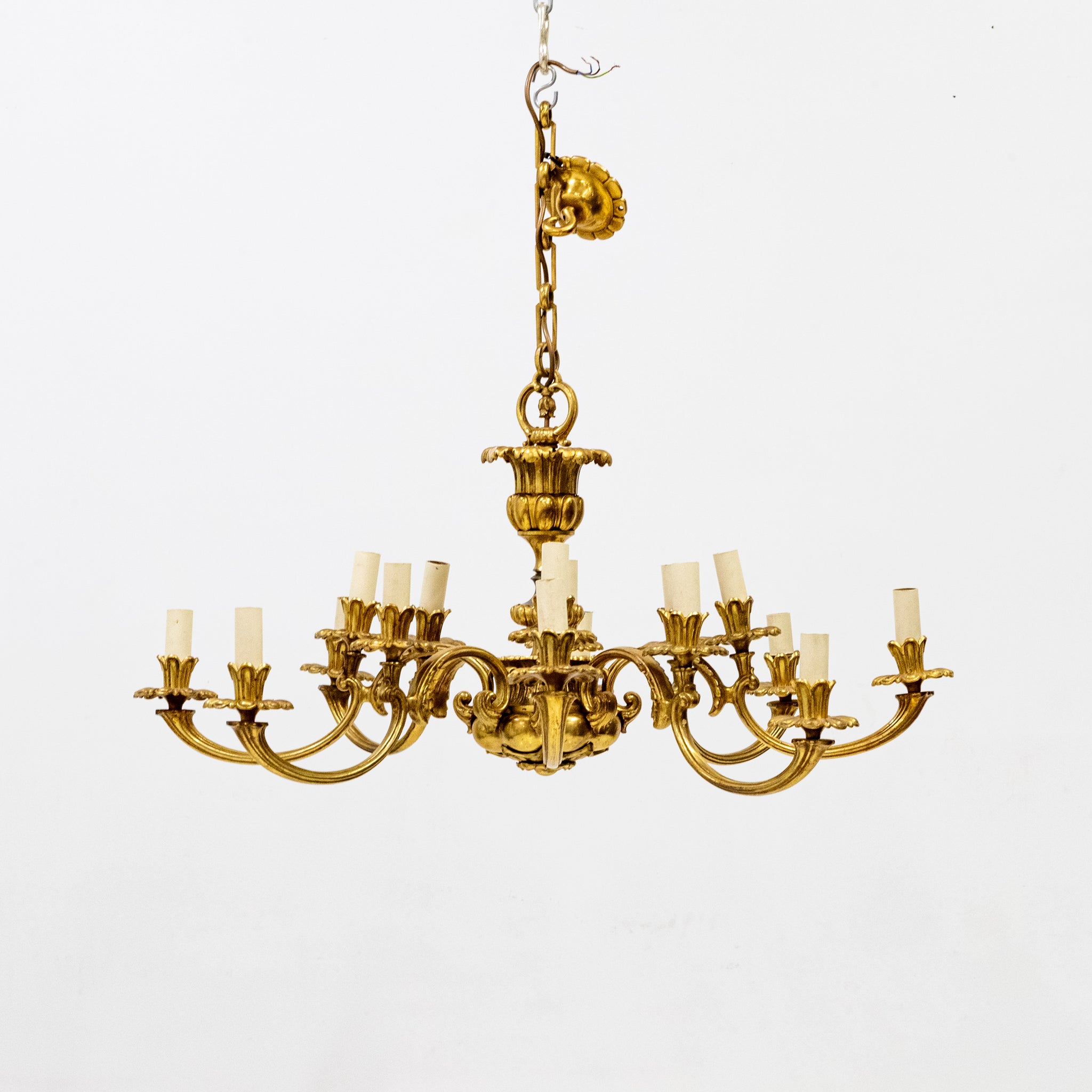 An exceptional piece, this early 19th-century Georgian chandelier has 12 arms, each ending in foliate, fluted bobeche with candle holders. The substantial brass piece has original gilded finish delivering an authentic crisp aged patina.